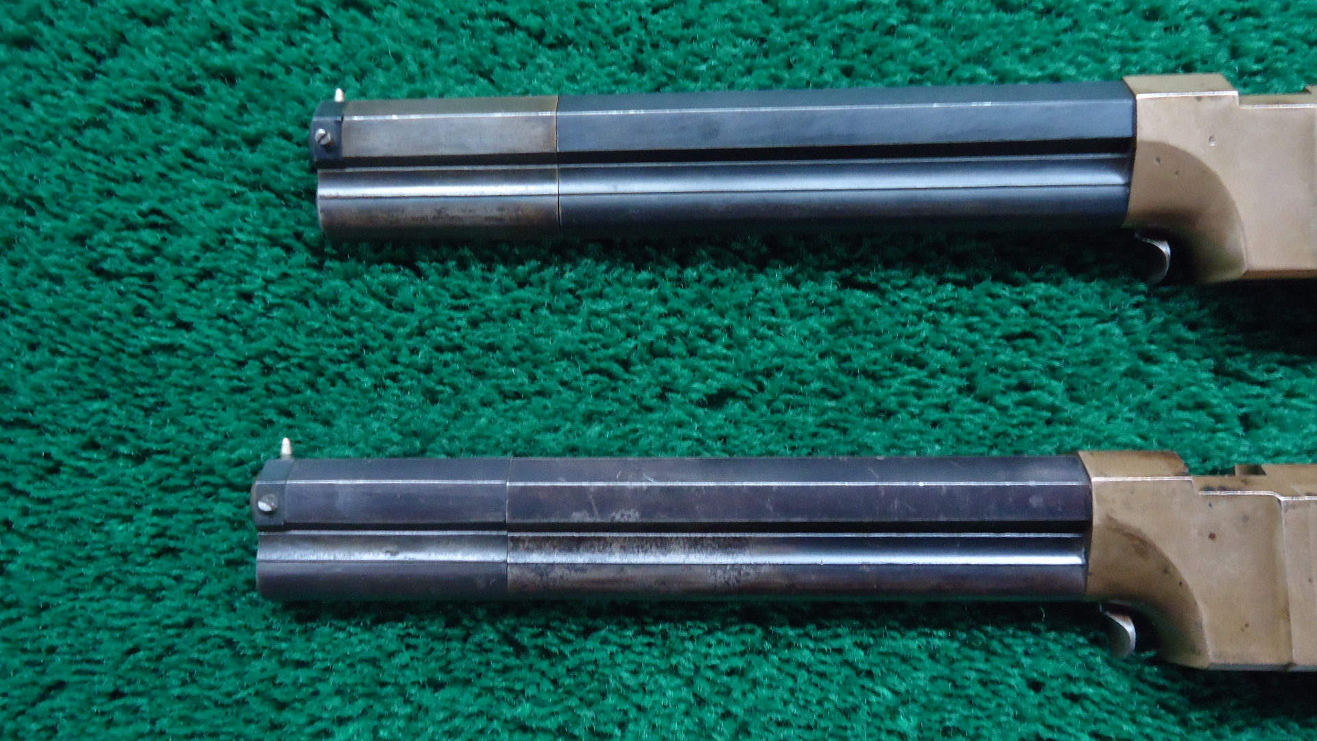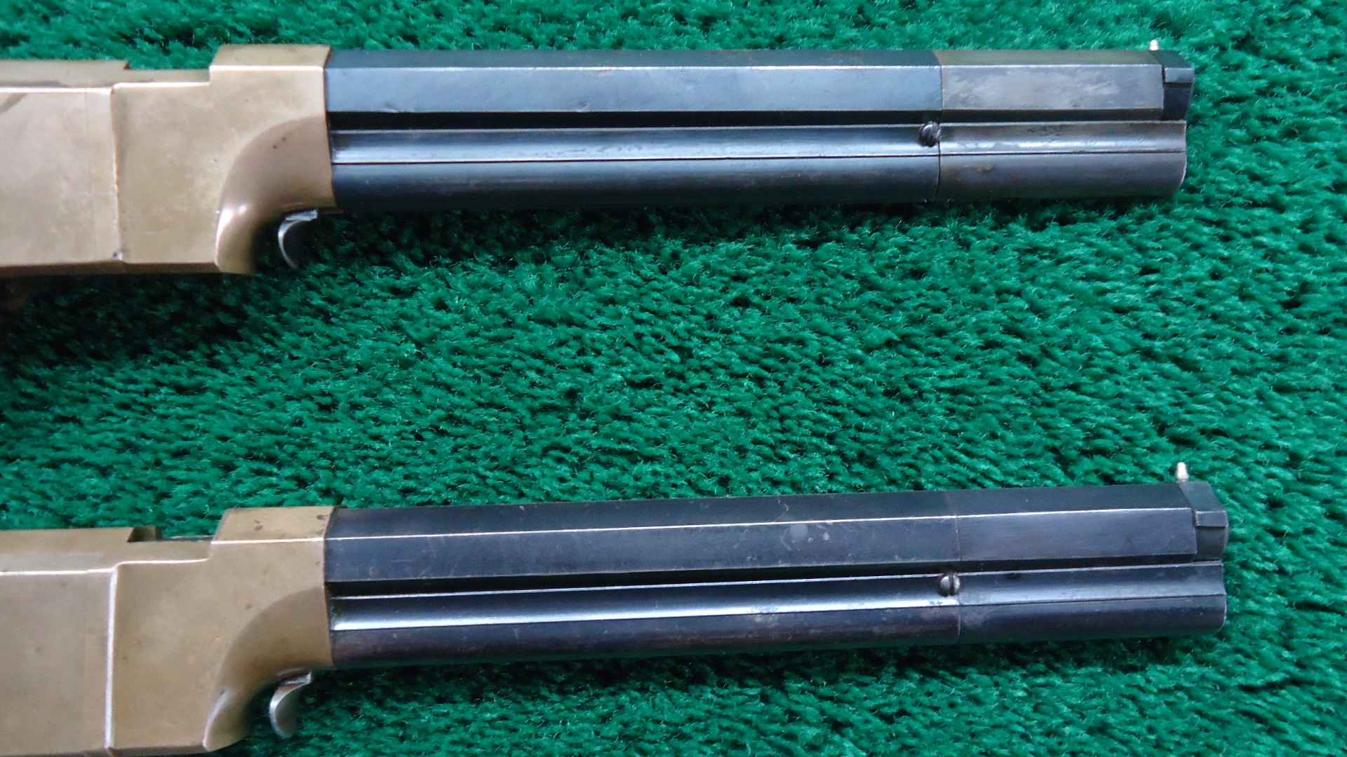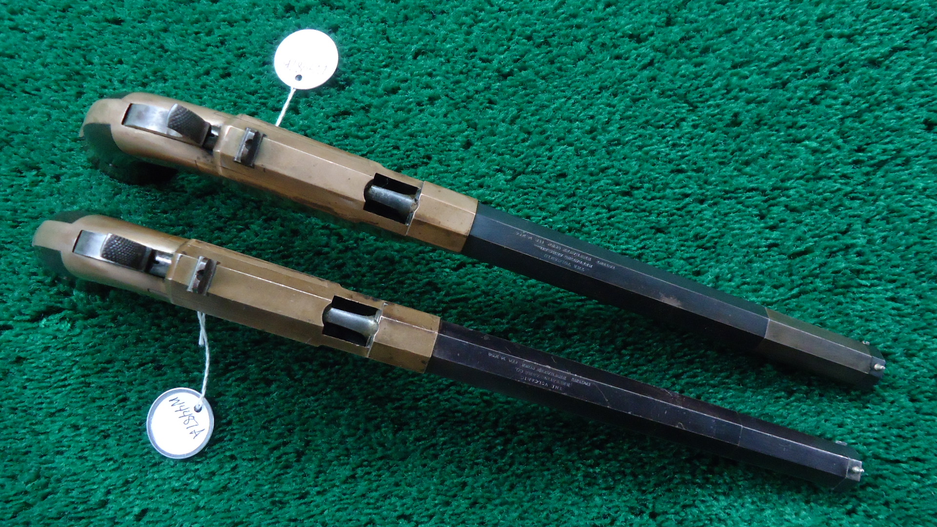 W4487A & W4487B CASED PAIR OF LARGE FRAME NO. 2 VOLCANIC PISTOLS; Pair of standard configuration Large Frame No. 2 Volcanic lever action pistols with 8 inch blued octagon barrels chambered in 41 caliber “Rocket Ball”. This was self contained ammunition. Both have very good shiny bores with sharp rifling. Sights include a post front with a fixed notch rear. Barrels with integral magazines retain about 80% of their original blue finish and good addresses. On one of them the rotating sleeve at the muzzle has no blue remaining but the rest of the barrel does. Brass frames have a nice smooth brass patina. Hammers and levers have traces of case color remaining. Walnut grips fit well and retain most all of their original factory varnish. About 1,500 of these 8 inch barrel pistols were manufactured between 1855-1859. Also included is an old custom mahogany case with a blank plaque on the lid. Case lining is in good condition. A very nice cased pair of Volcanic pistols that compliment each other.