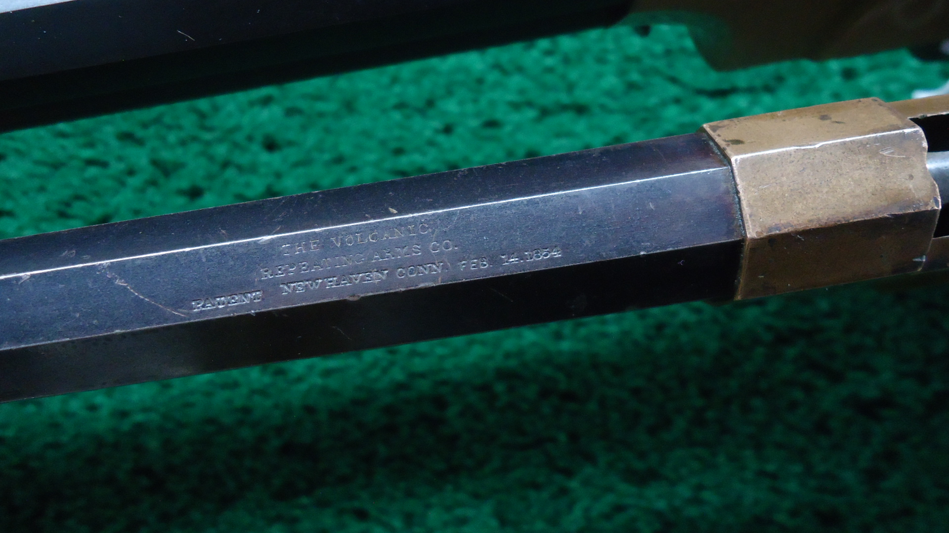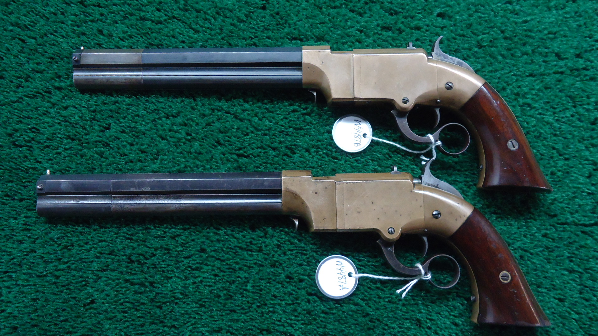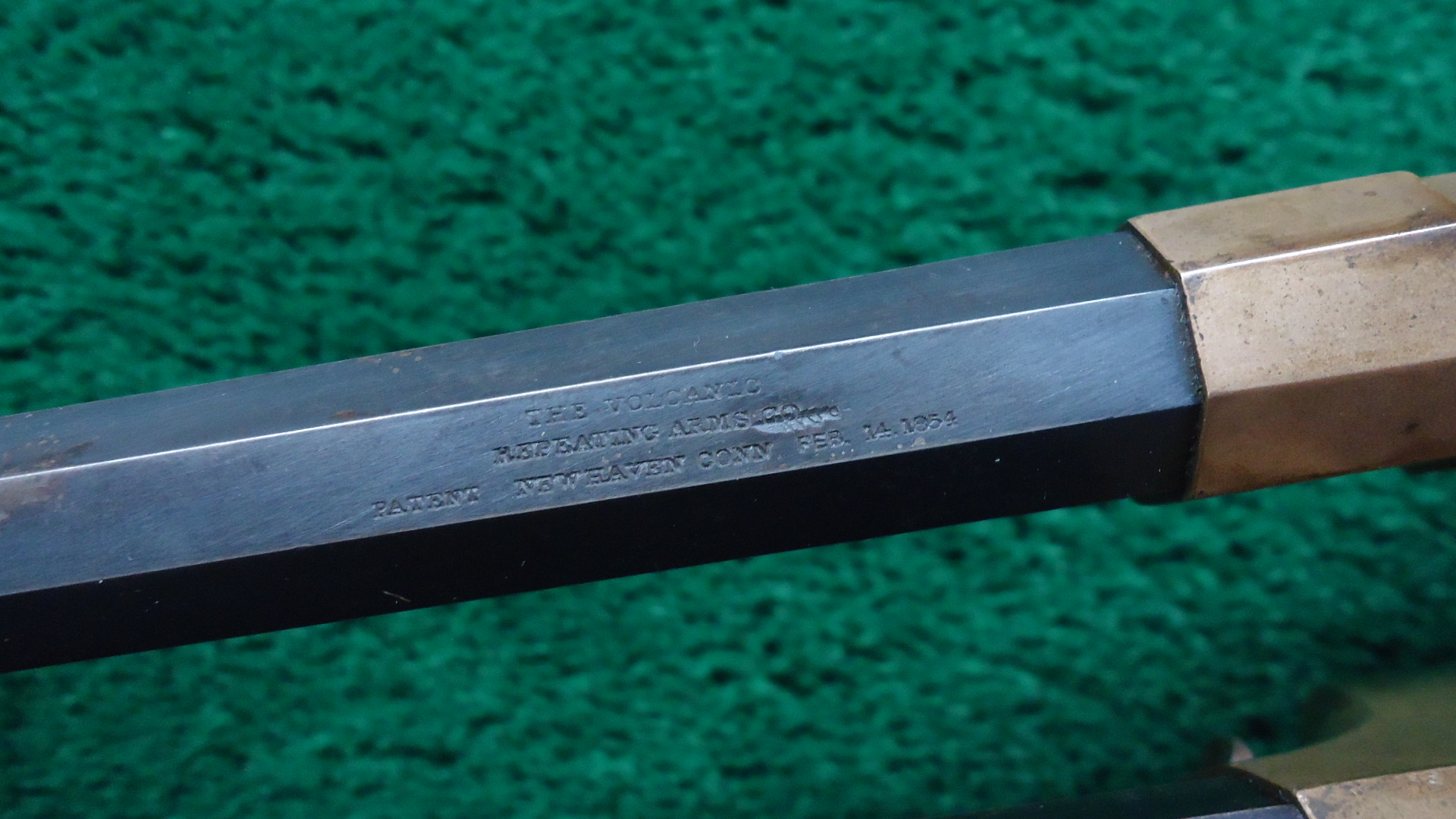 W4487A & W4487B CASED PAIR OF LARGE FRAME NO. 2 VOLCANIC PISTOLS; Pair of standard configuration Large Frame No. 2 Volcanic lever action pistols with 8 inch blued octagon barrels chambered in 41 caliber “Rocket Ball”. This was self contained ammunition. Both have very good shiny bores with sharp rifling. Sights include a post front with a fixed notch rear. Barrels with integral magazines retain about 80% of their original blue finish and good addresses. On one of them the rotating sleeve at the muzzle has no blue remaining but the rest of the barrel does. Brass frames have a nice smooth brass patina. Hammers and levers have traces of case color remaining. Walnut grips fit well and retain most all of their original factory varnish. About 1,500 of these 8 inch barrel pistols were manufactured between 1855-1859. Also included is an old custom mahogany case with a blank plaque on the lid. Case lining is in good condition. A very nice cased pair of Volcanic pistols that compliment each other.