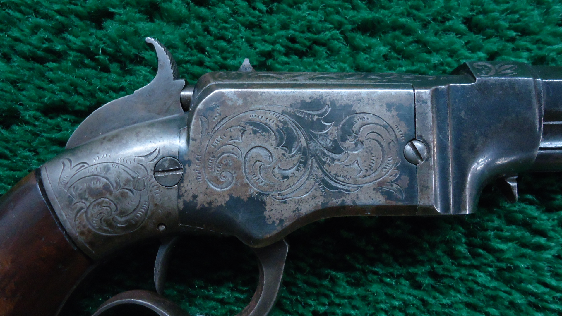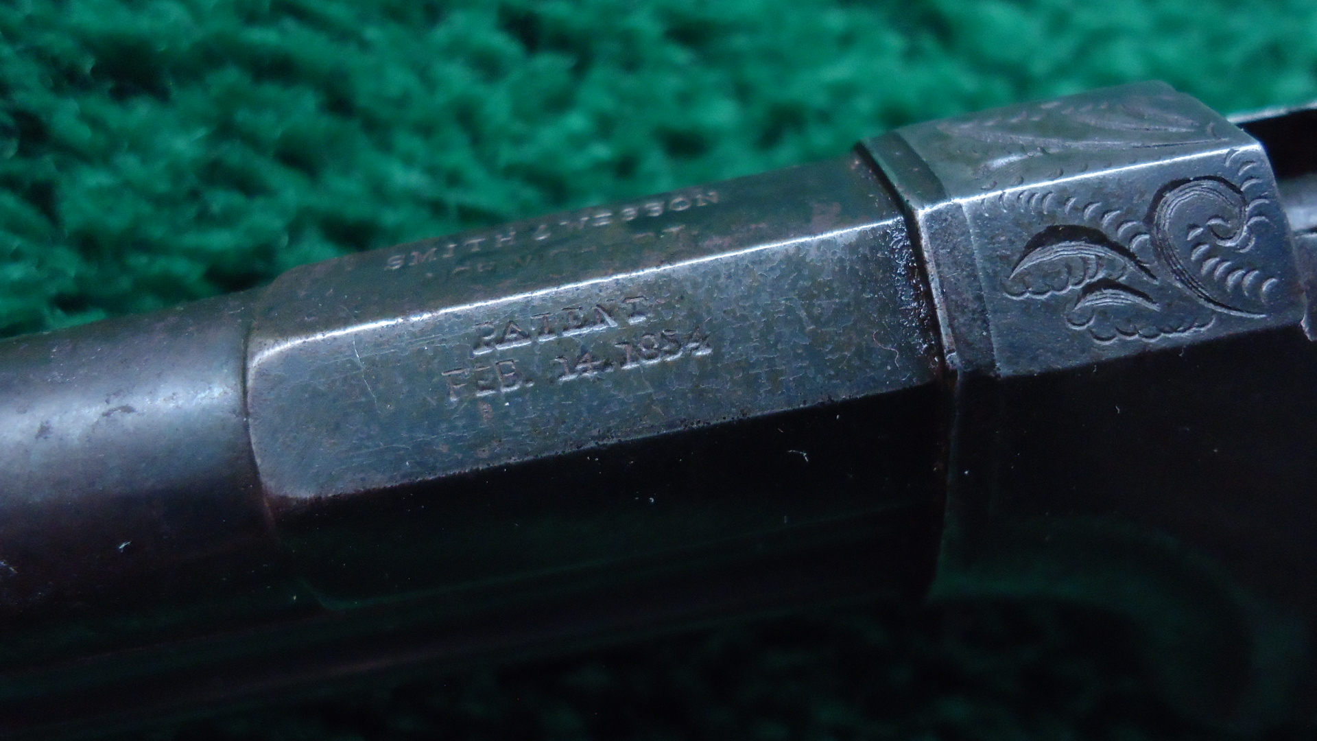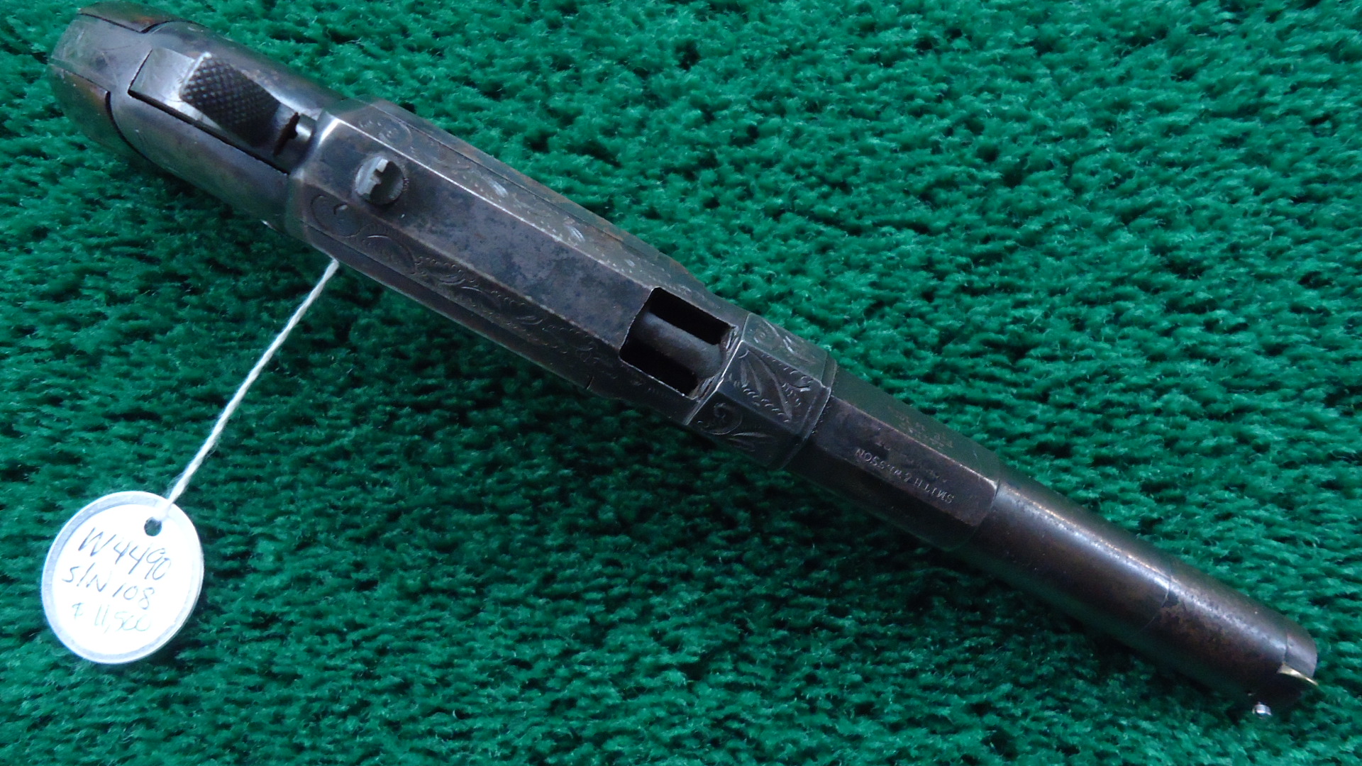 W4490 EARLY SMITH & WESSON NO. 1 SMALL FRAME PISTOL IN 31 CALIBER; Factory engraved early production serial number 108 small frame No. 1 Volcanic lever action pistol has an 4 inch part octagon barrel chambered in 36 caliber and has a good bore with scattered roughness. Also has the distinctive “Type I” features which include an uncrowned flat muzzle with flat front magazine locking spring retained by a screw at its bottom and one carrier block spring screw on the bottom of the frame. The top of the barrel is stamped “SMITH & WESSON / NORWICH, CT” while one flat reads “FEB 14,1854″ and another reads ” CAST-STEEL”. Integral 6-shot magazine below the barrel. Sights include a post blade front and a fixed notch rear. Has the rare early production lever with the finger spur. Barrel and magazine tube assembly as well as the frame retain about 50% blue with scattered areas of very light pitting. The blued iron frame has factory scroll engraving. Varnished Rosewood grips are refinished and fit poorly. Action functions properly. This Smith & Wesson Volcanic pistol was manufactured in 1854. Only about 1,200 of these 36 caliber small frame No. 1 Volcanic pistols were made between 1854-1855.
