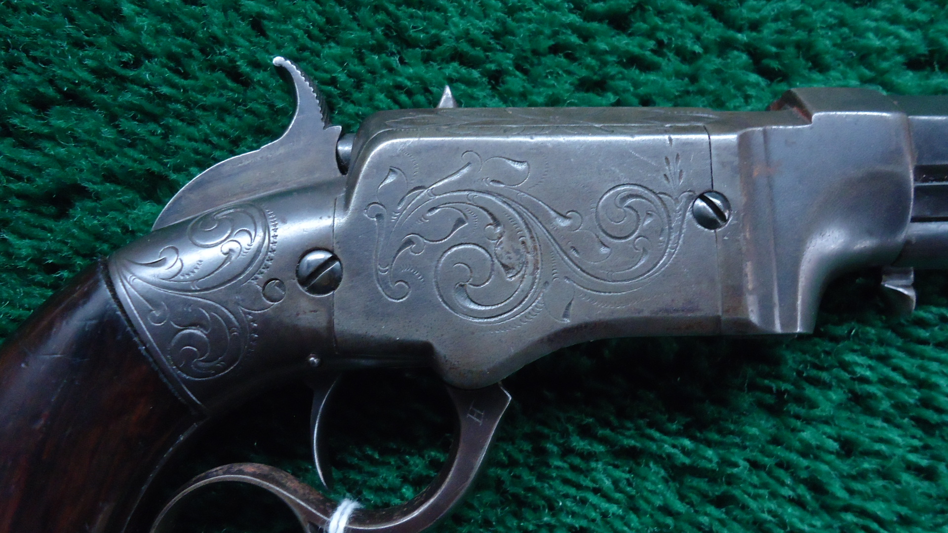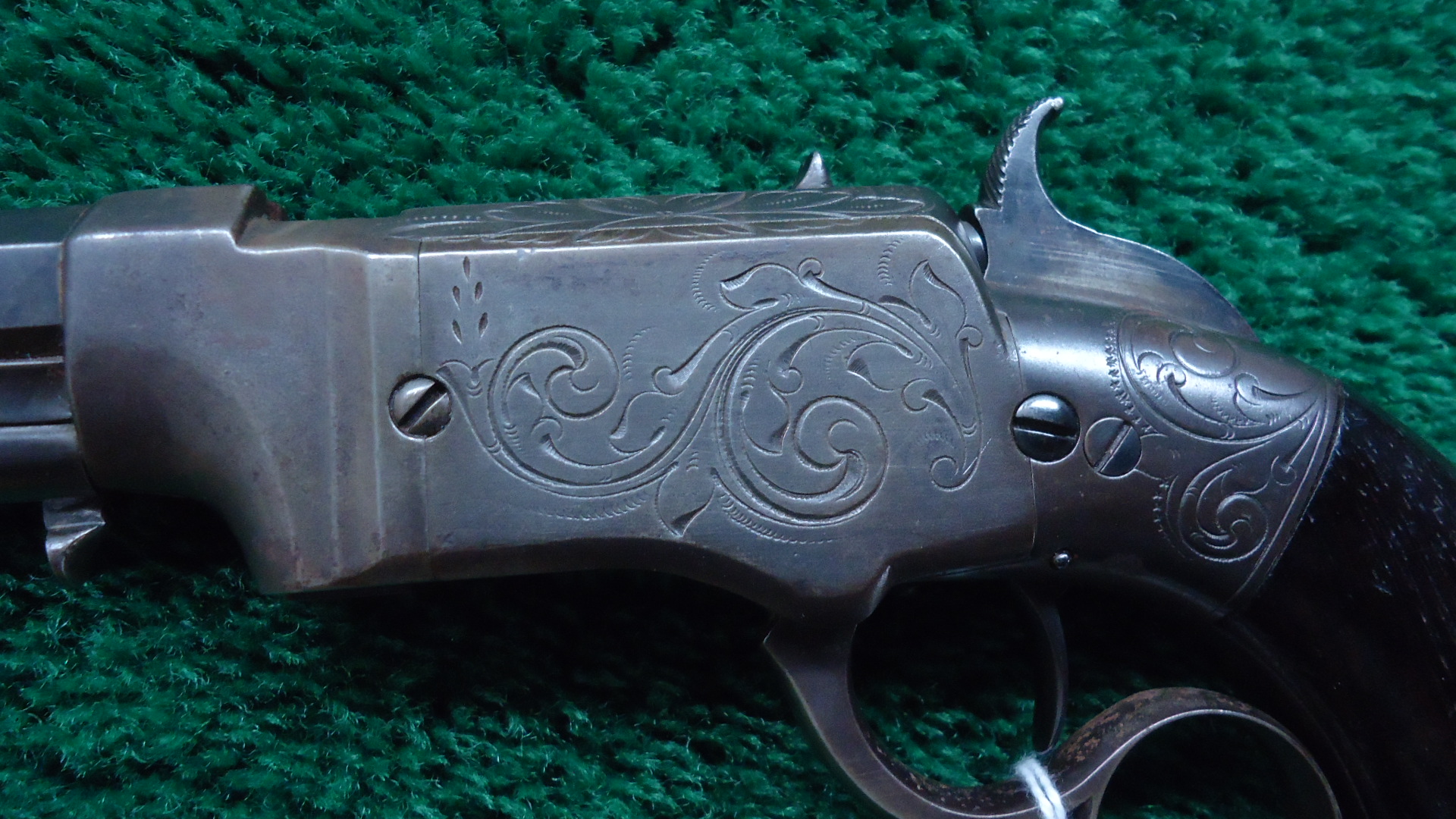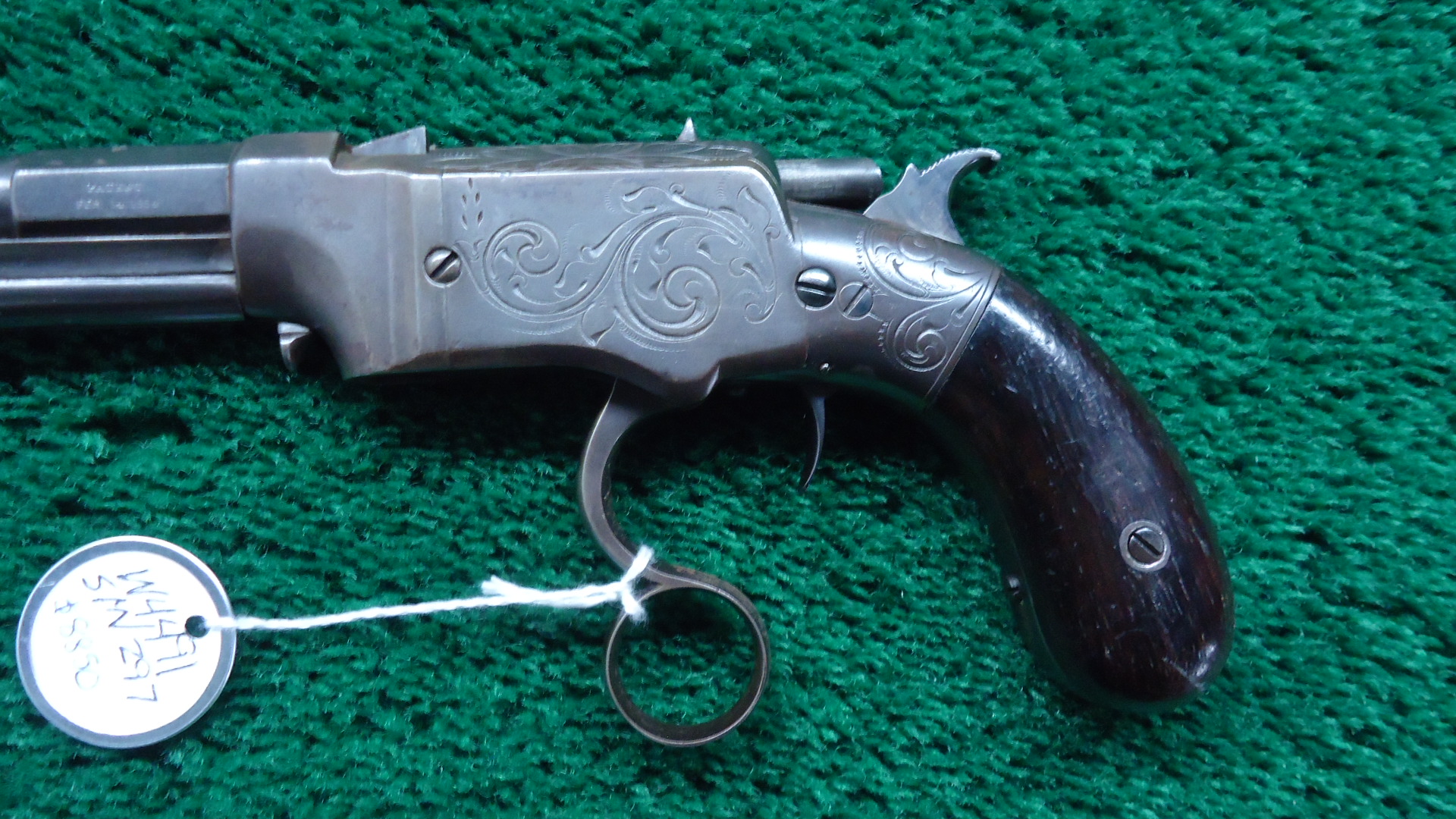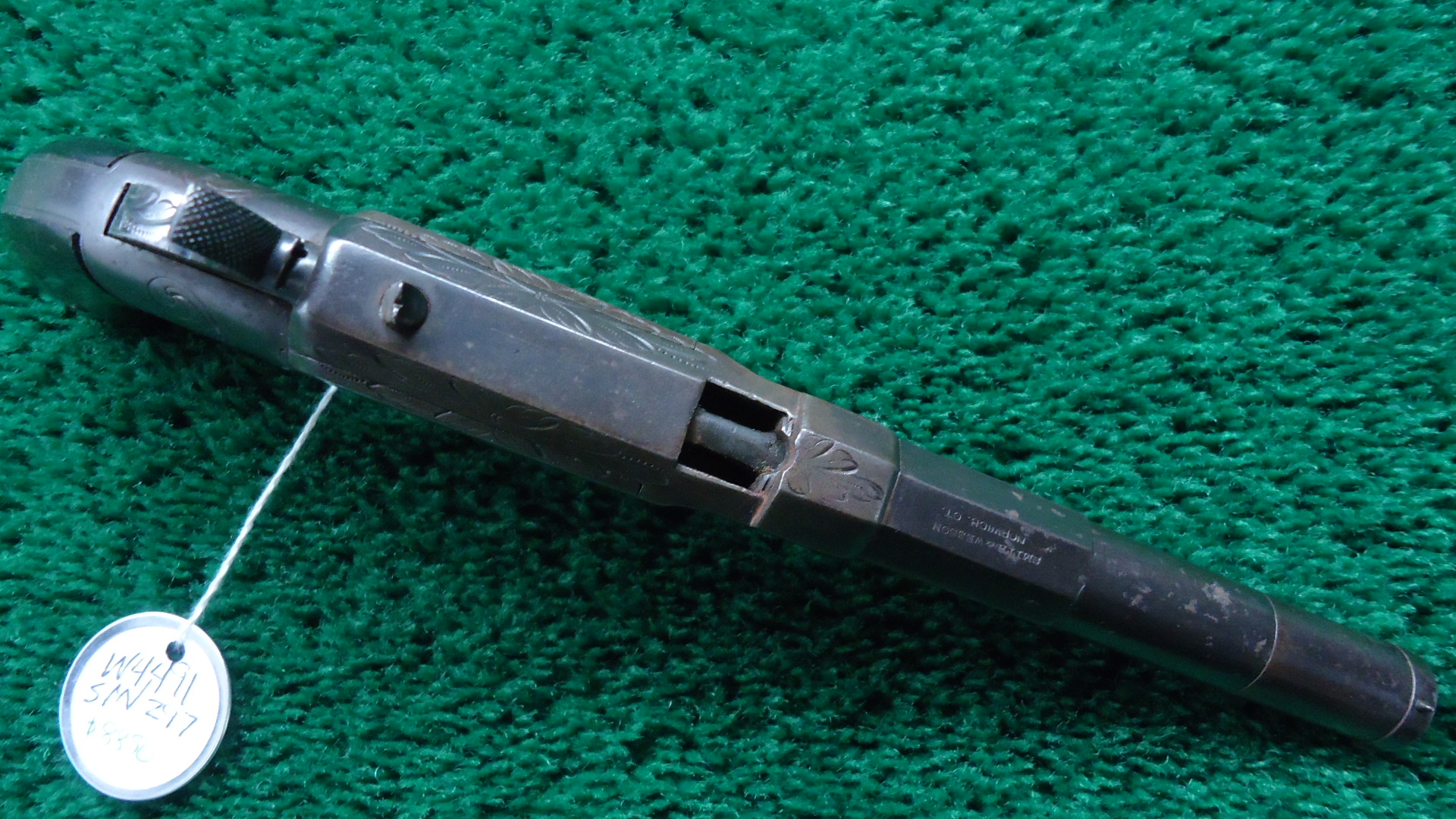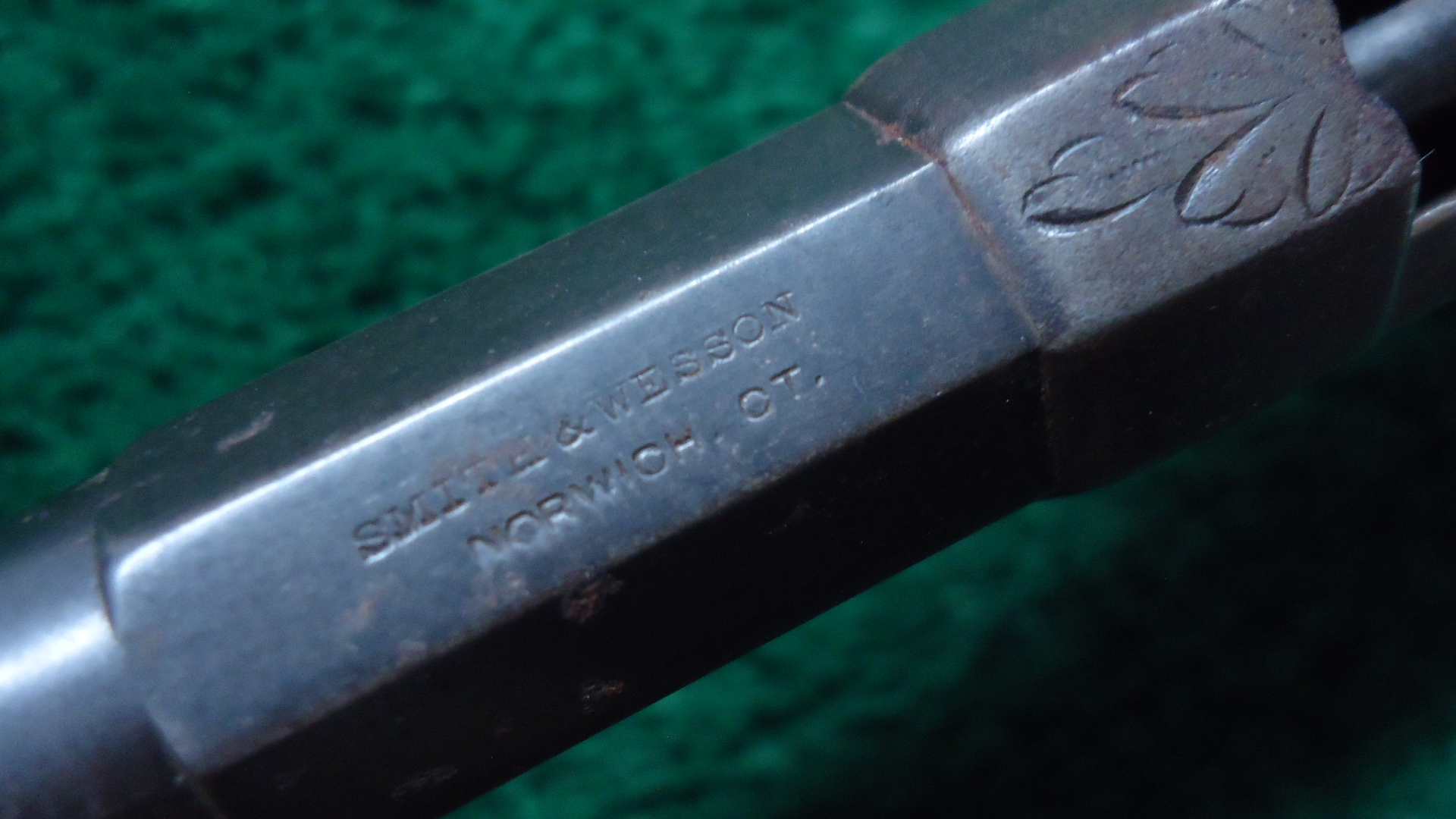 W4491 SMITH & WESSON NO. 1 SMALL FRAME PISTOL IN 31 CALIBER; Factory engraved early production serial number 297 small frame No. 1 Volcanic lever action pistol has an 4 inch part octagon barrel chambered in 36 caliber and has a very good shiny bore. These pistols fired the self contained “Rocket Ball”. Features a nicely crowned muzzle face. The top of the barrel is stamped “SMITH & WESSON / NORWICH, CT” while one flat reads “PATENT / FEB 14,1854″ and another reads ” CAST-STEEL”. Integral 6-shot magazine below the barrel. Sights include a post blade front and a fixed notch rear. Barrel and magazine tube assembly as well as the frame have traces of blue remaining with the balance a plum/brown patina. The blued iron frame has factory scroll engraving. Varnished Rosewood grips fit good and have just some minor wear. Action functions properly. This Smith & Wesson Volcanic pistol was manufactured in 1855. Only about 1,200 of these 36 caliber small frame No. 1 Volcanic pistols were made between 1854-1855. This was the first Smith & Wesson branded firearm based on Daniel Wesson’s 1854 patent. A rare and historic pistol that is important to S&W collectors and Winchester collectors alike.
