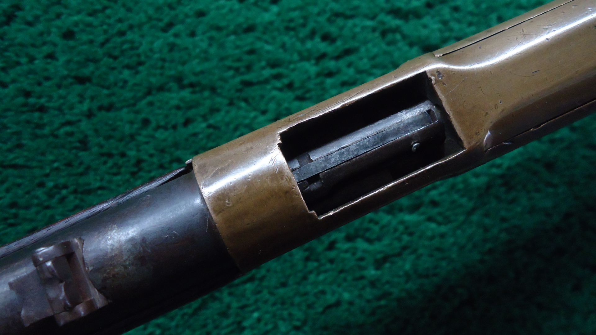 W4497 WINCHESTER MODEL 1866 SRC; Standard 20 inch carbine configuration chambered in 44 CF caliber. Bore is dark with scattered roughness throughout. Sights include a blade front that is integral to the barrel band and a folding two-leaf rear that has been modified. Winchester barrel address is mostly visible but faint. Barrel and full length magazine tube are a mottled plum/brown patina. Brass receiver has aged to a dark patina with numerous dings and scratches from usage on the frontier in the Wild West. Bolt has been converted to Centerfire. Hammer and lever are mostly a light brown with some gray. Loading gate is dark blue. Original saddle ring is present. Smooth functioning action. Walnut stock set has been refinished and has numerous dings and handling mars. Brass carbine buttplate matches the receiver. This 1866 carbine was made in 1874 and looks like it has a story to tell.