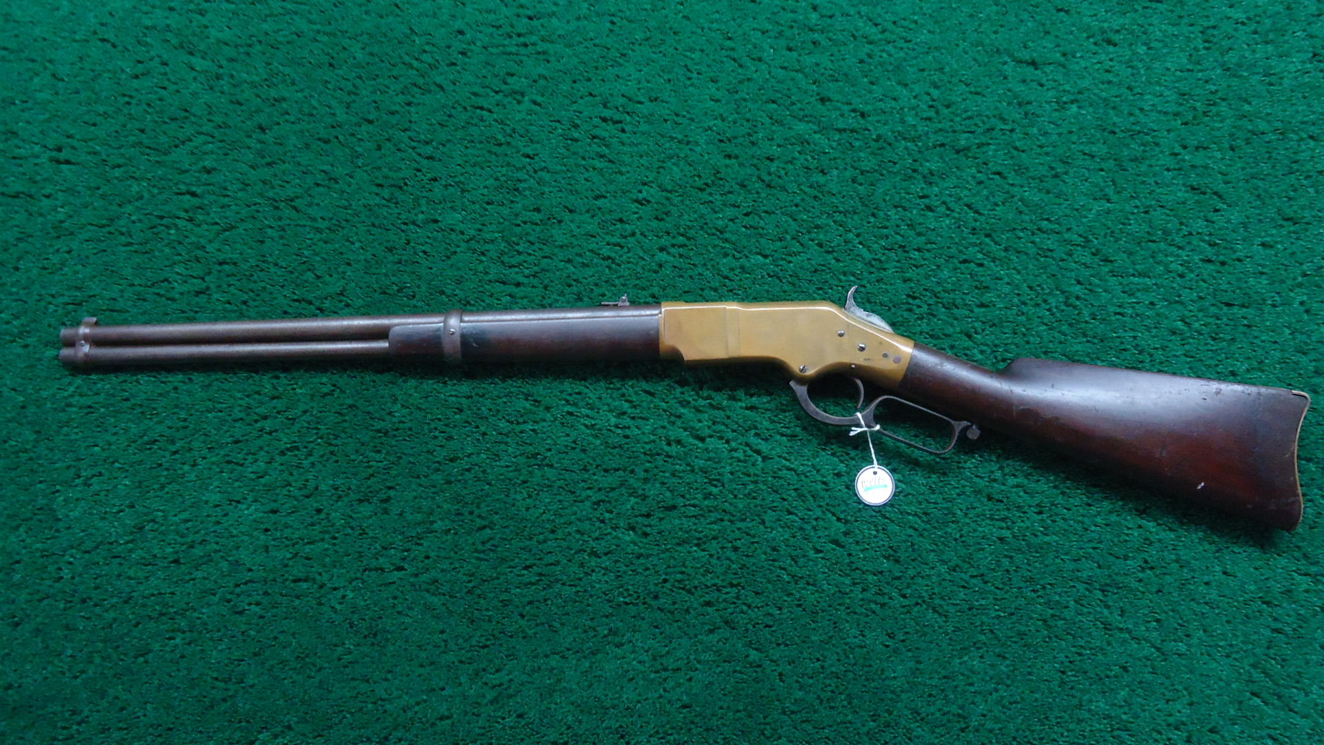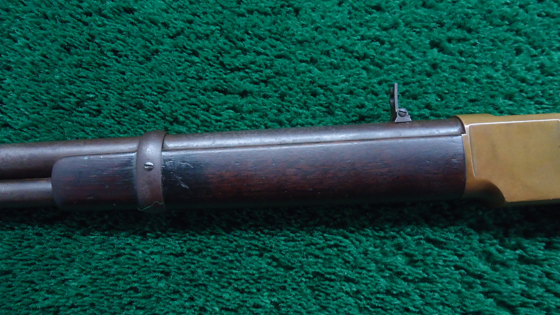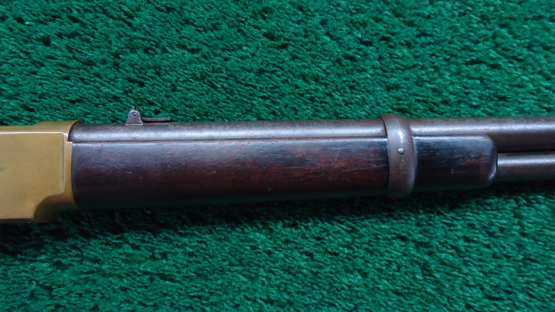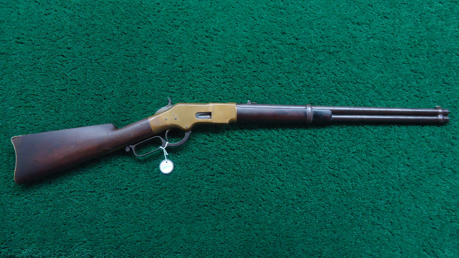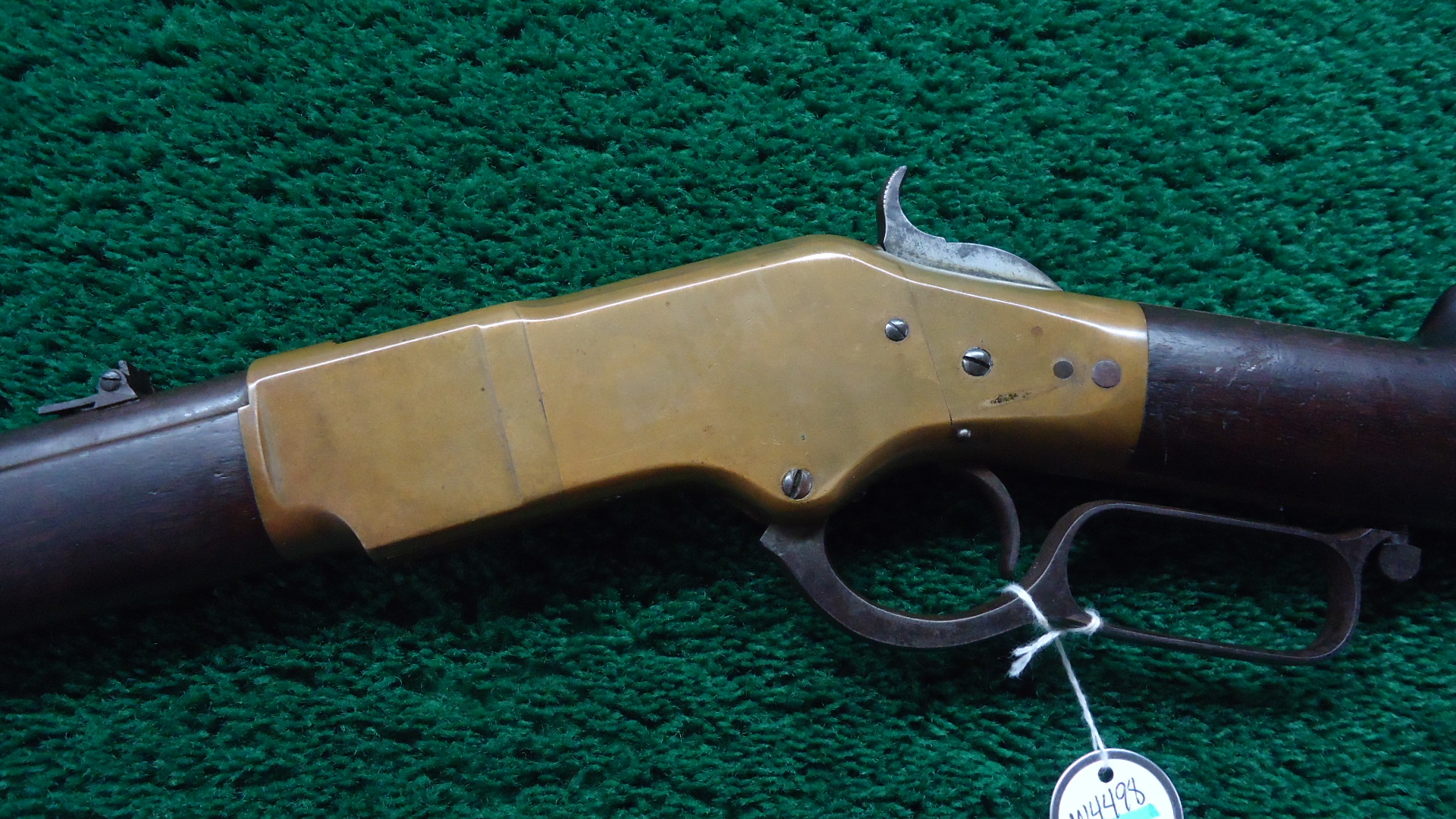 W4498 WINCHESTER MODEL 1866 SRC; Standard 20 inch carbine configuration chambered in 44 RF caliber. Bore is dark with scattered roughness and pitting. Sights include a blade front that is integral to the barrel band and a folding two-leaf rear. Winchester barrel address is visible. Barrel and full length magazine tube are a mottled gray/brown patina. Brass receiver has aged to a smooth light mustard patina. Hammer and lever are mostly brown with some gray. Loading gate has traces of fire blue. Original saddle ring has been removed. Smooth functioning action. Walnut stock set fit well with some scattered minor dings and scratches. 3-Piece cleaning rod is present in the stock compartment. Brass carbine buttplate matches the receiver. An honest looking survivor from the western cowboy era. This carbine was made in 1875 and shipped in 1876.