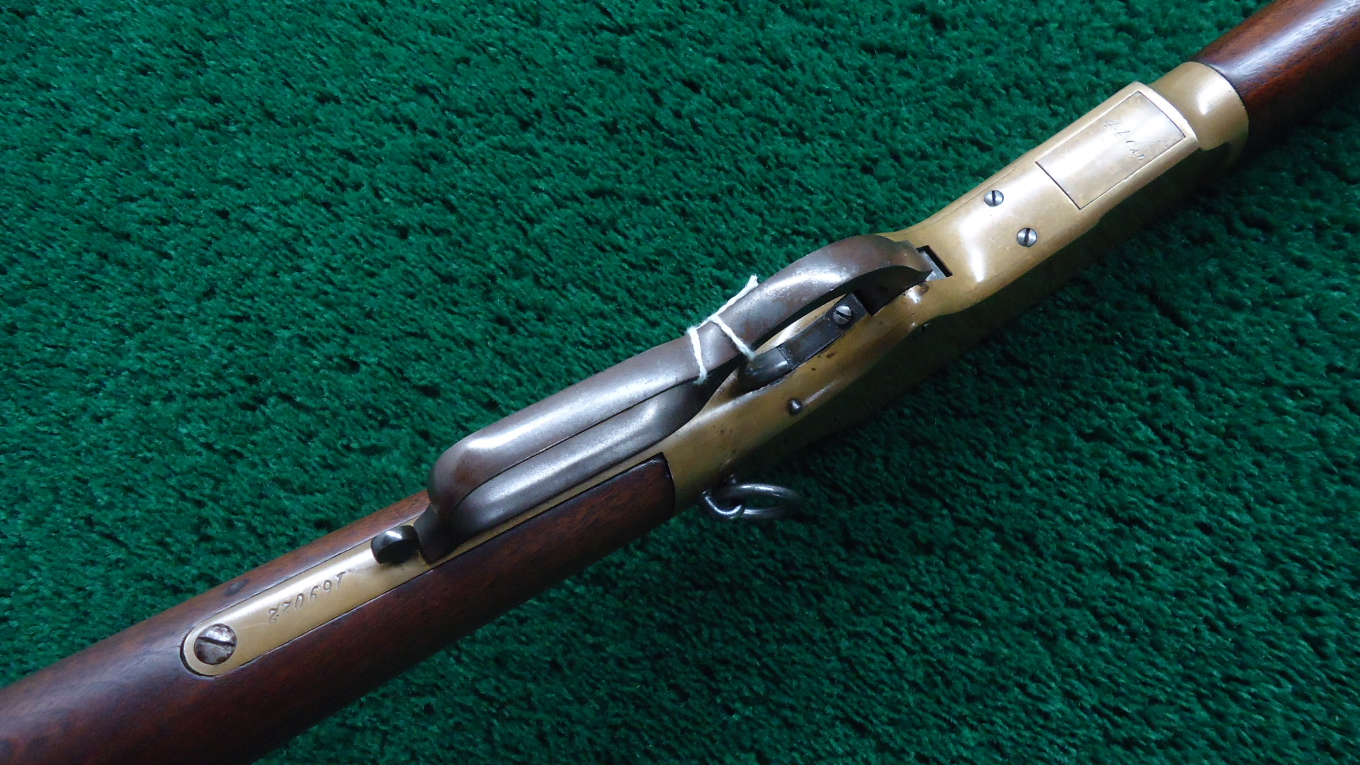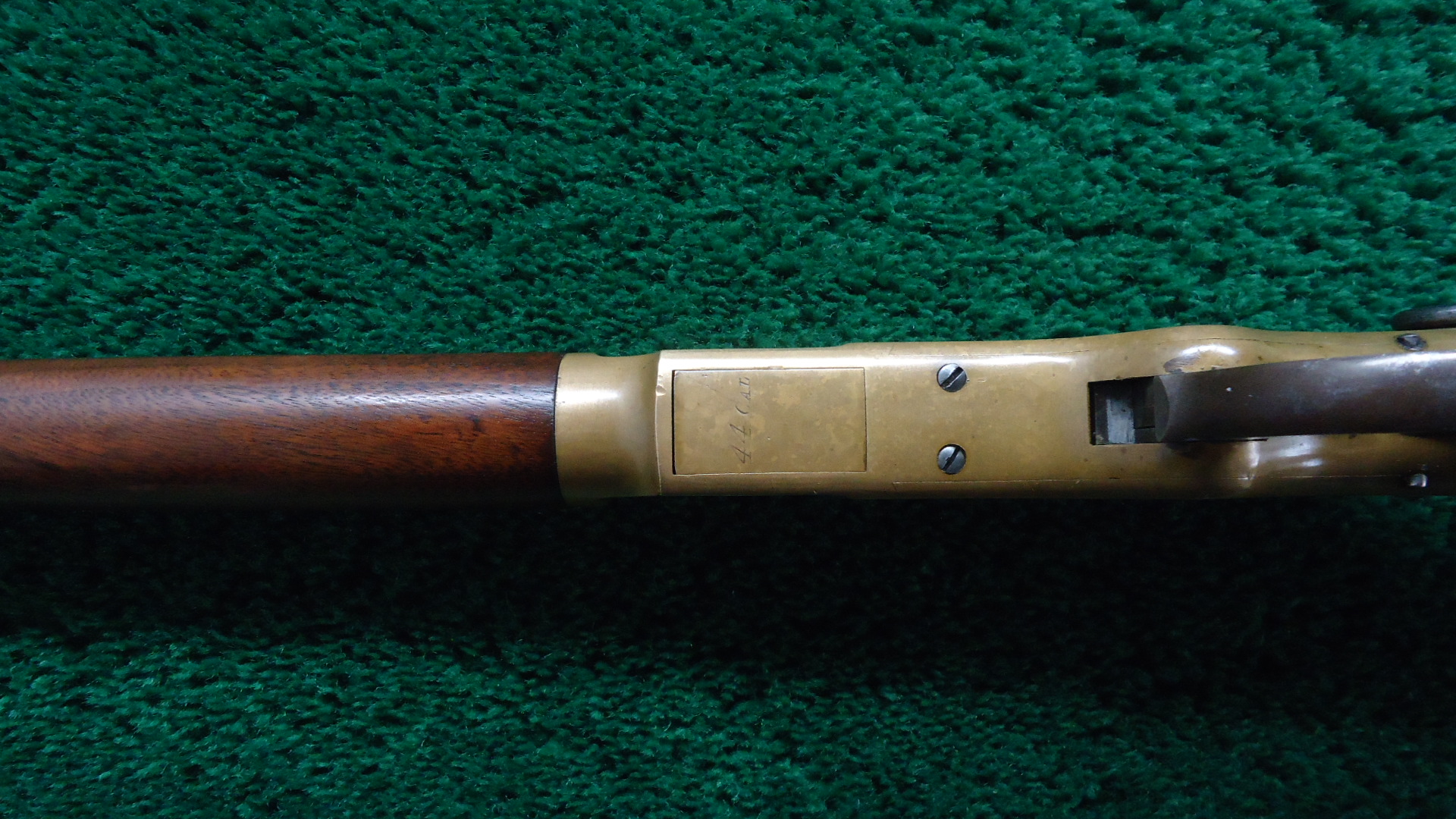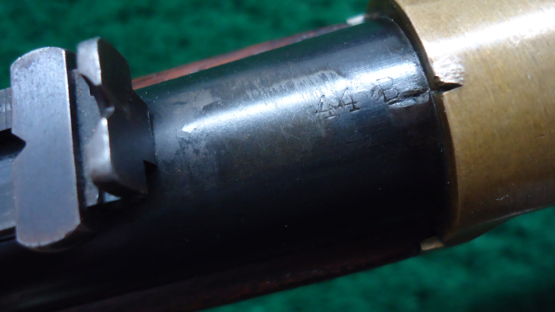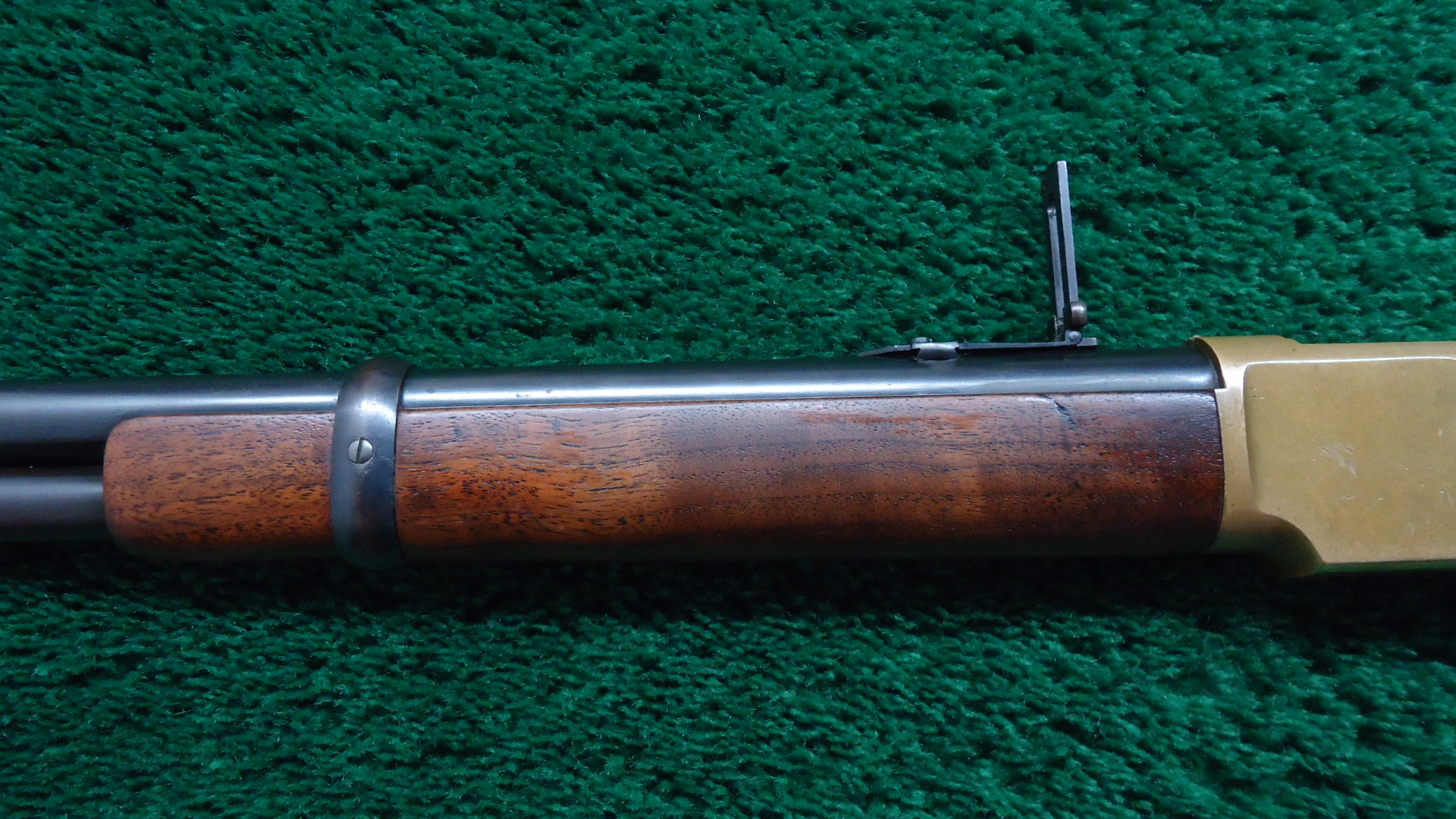W4499 WINCHESTER LATE 4TH MODEL 1866 SRC; Standard 20 inch carbine configuration chambered in 44 RF caliber. Very good shiny bore with distinct rifling. Sights include a barleycorn front and an “1873” marked carbine rear. Winchester barrel address is crisp and clear and has a 44B caliber marking. Barrel and magazine tube retain most lightly faded thinning blue. Brass receiver has a mild patina with some scratches and marks. Hammer has some nice colors while the lever has traces of color but is mostly a gray/brown. Loading gate has good fire blue remaining. Original saddle ring is present. Nice functioning action. Walnut forearm has traces of varnish and is in good condition. Buttstock has been lightly sanded and is a little bit shy at the tangs. 3-Piece cleaning rod is present in the stock compartment. Steel carbine buttplate appears to have been touched up. The 44 B marking indicates it was part of a 1,000 gun shipment of 44 Center Fire 1866 Carbines for Brazil. The Winchester Model 1866 Carbines made for Brazil were in .44 Henry Center fire Caliber. The meaning of the “B” in the caliber marking is uncertain but it is presumed to stand for “Brazil.” This carbine started life as a Center Fire but was later changed back to Rim Fire in May of 1891. This Fourth Model 1866 carbine has an interesting history as indicated by the Research Form.