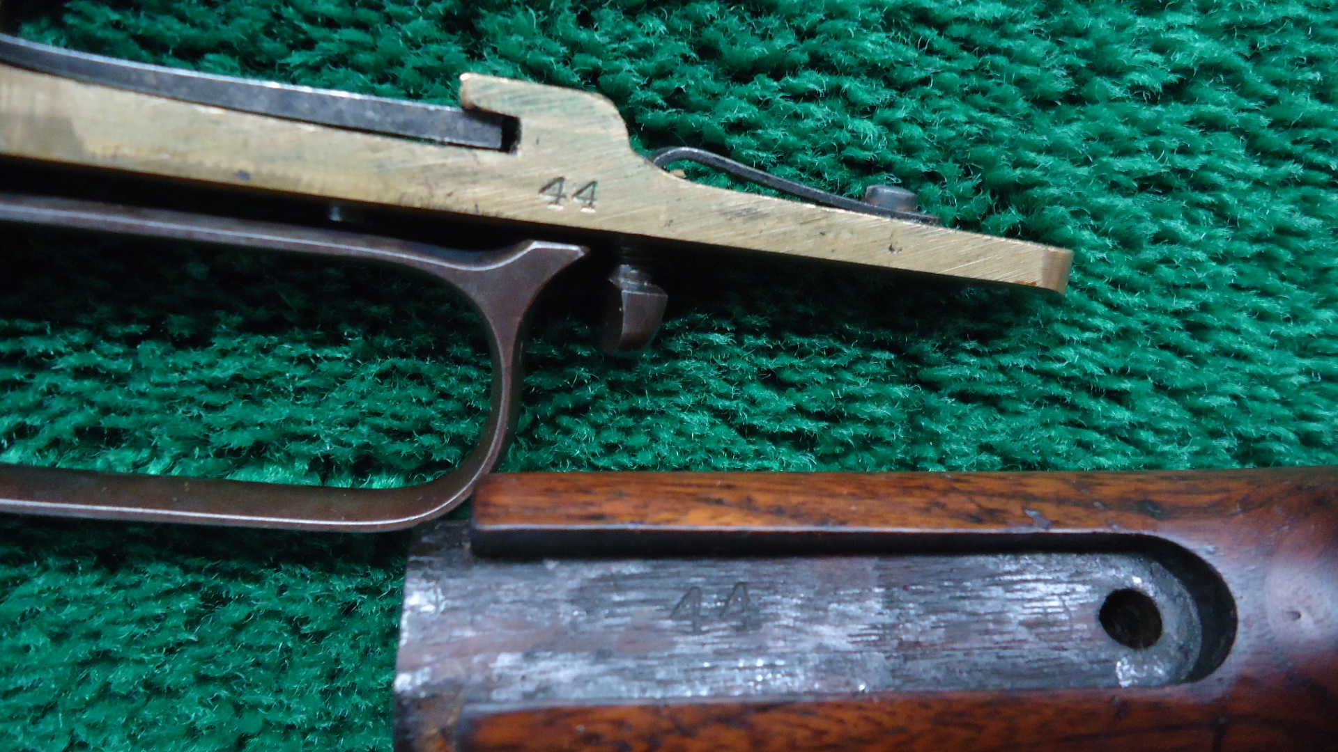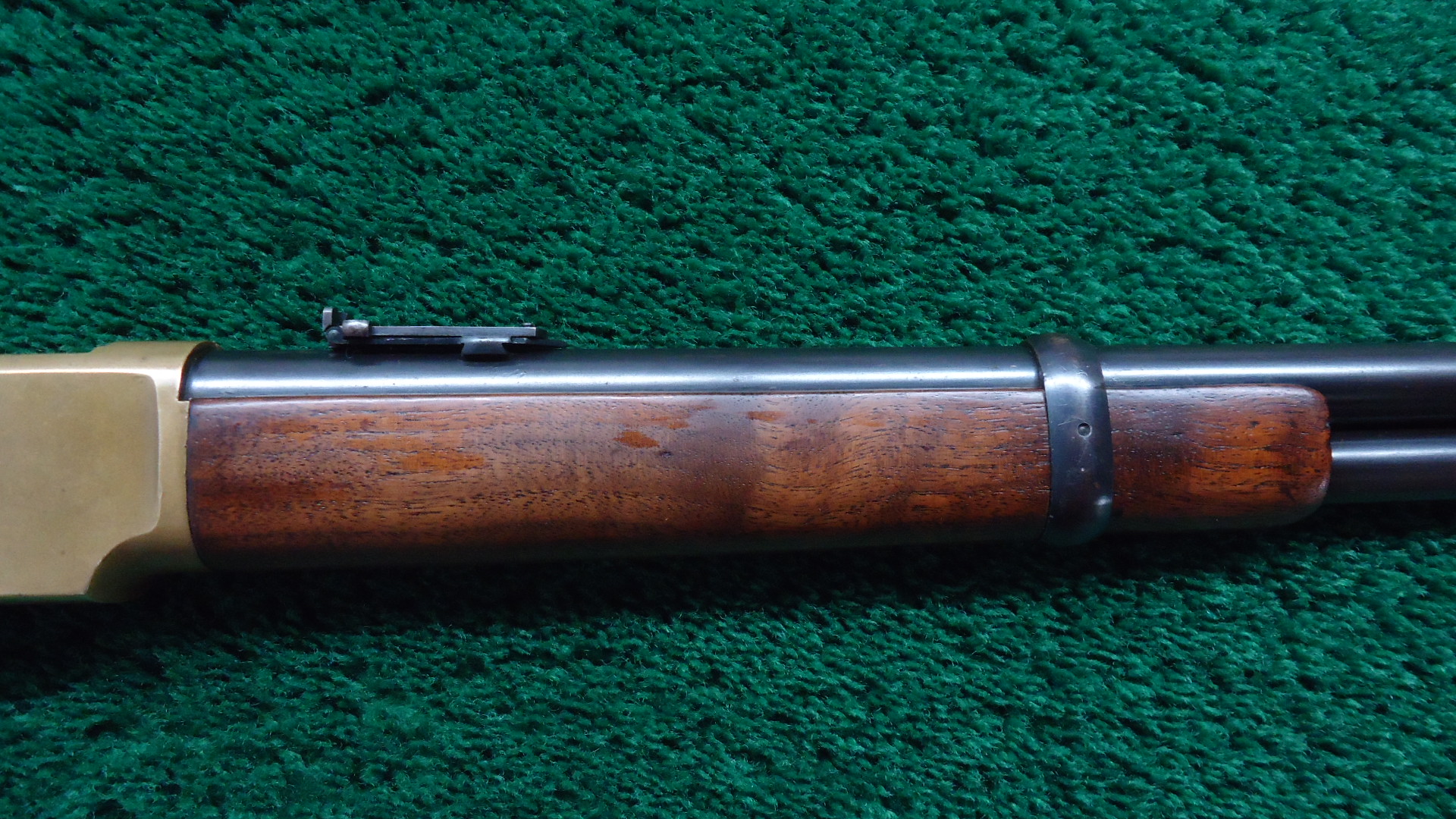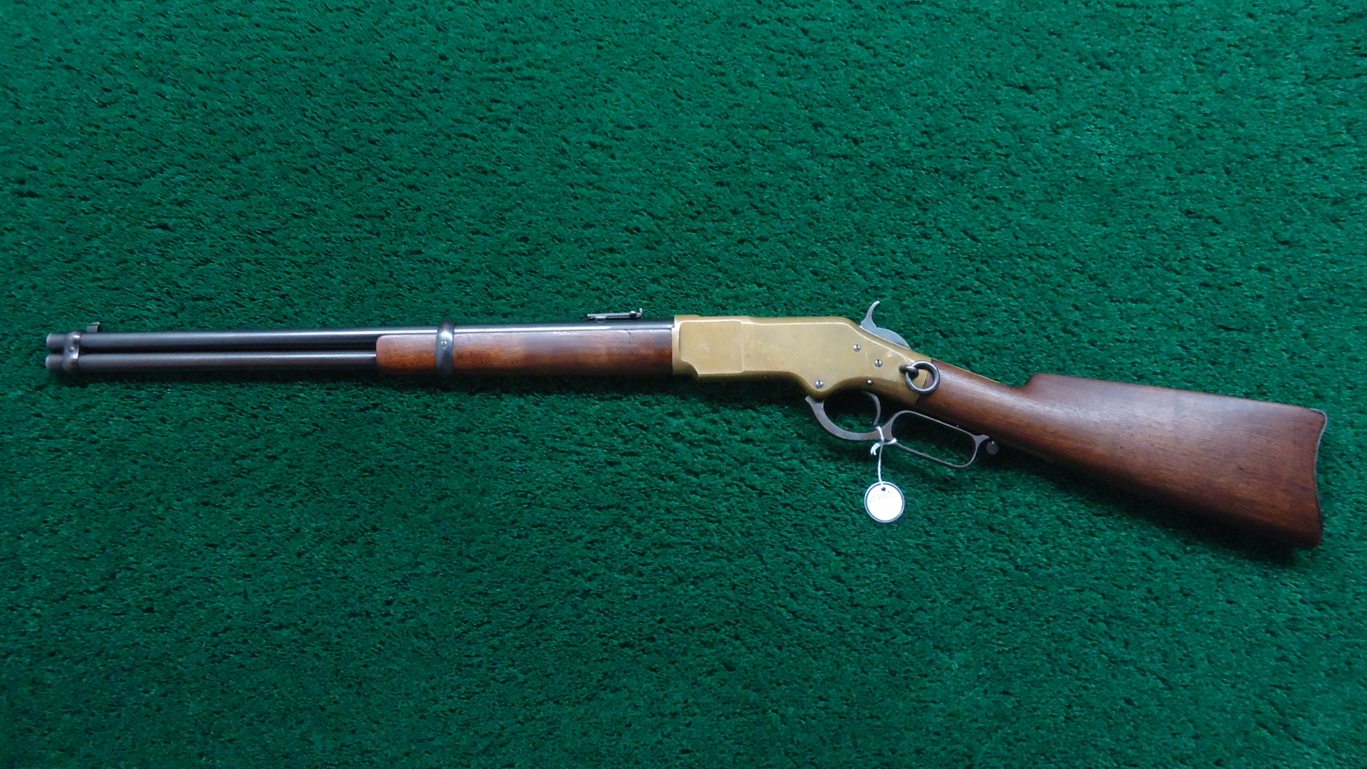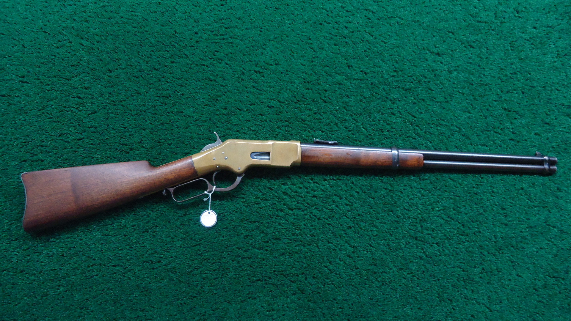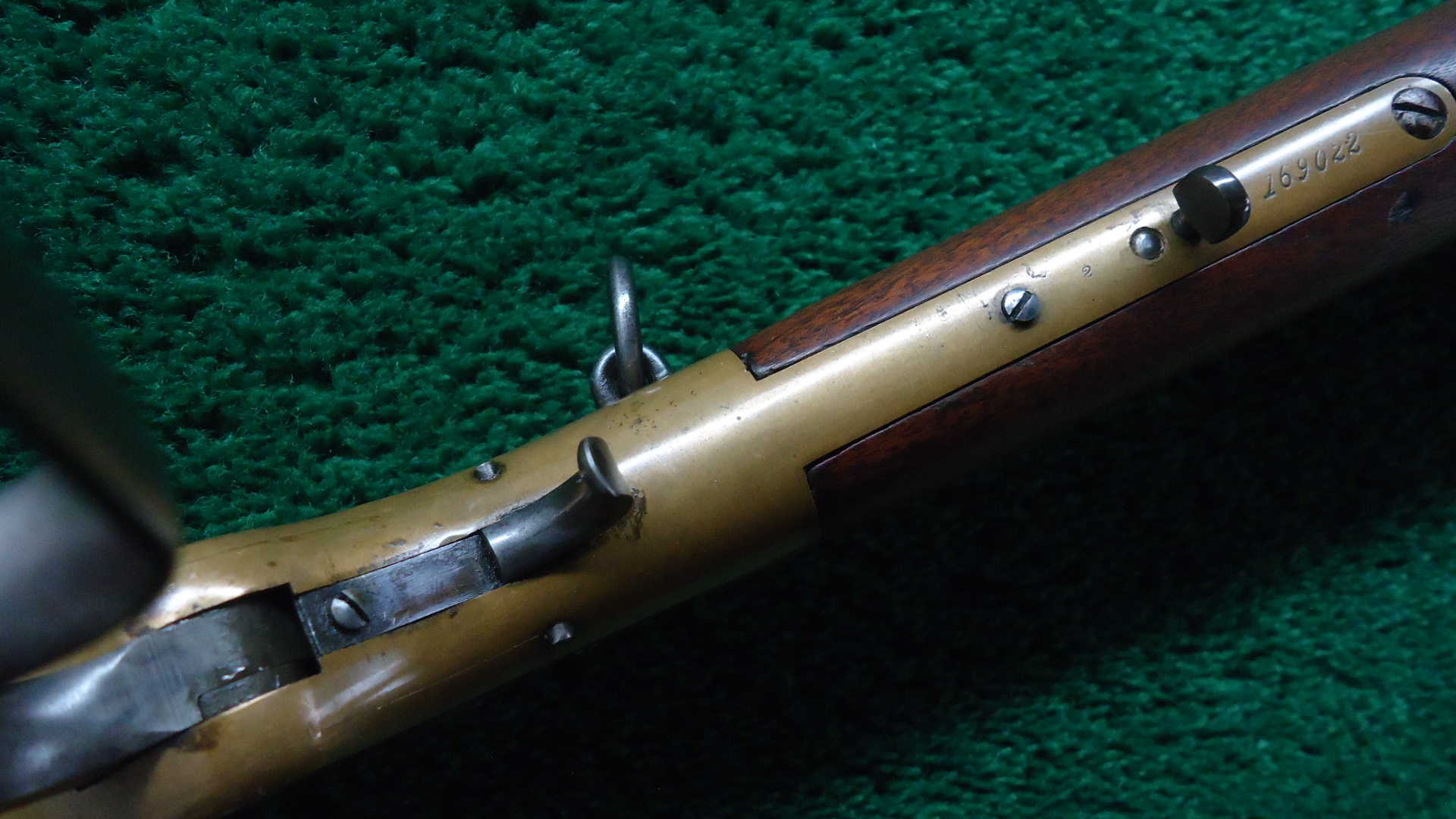 W4499 WINCHESTER LATE 4TH MODEL 1866 SRC; Standard 20 inch carbine configuration chambered in 44 RF caliber. Very good shiny bore with distinct rifling. Sights include a barleycorn front and an “1873” marked carbine rear. Winchester barrel address is crisp and clear and has a 44B caliber marking. Barrel and magazine tube retain most lightly faded thinning blue. Brass receiver has a mild patina with some scratches and marks. Hammer has some nice colors while the lever has traces of color but is mostly a gray/brown. Loading gate has good fire blue remaining. Original saddle ring is present. Nice functioning action. Walnut forearm has traces of varnish and is in good condition. Buttstock has been lightly sanded and is a little bit shy at the tangs. 3-Piece cleaning rod is present in the stock compartment. Steel carbine buttplate appears to have been touched up. The 44 B marking indicates it was part of a 1,000 gun shipment of 44 Center Fire 1866 Carbines for Brazil. The Winchester Model 1866 Carbines made for Brazil were in .44 Henry Center fire Caliber. The meaning of the “B” in the caliber marking is uncertain but it is presumed to stand for “Brazil.” This carbine started life as a Center Fire but was later changed back to Rim Fire in May of 1891. This Fourth Model 1866 carbine has an interesting history as indicated by the Research Form.