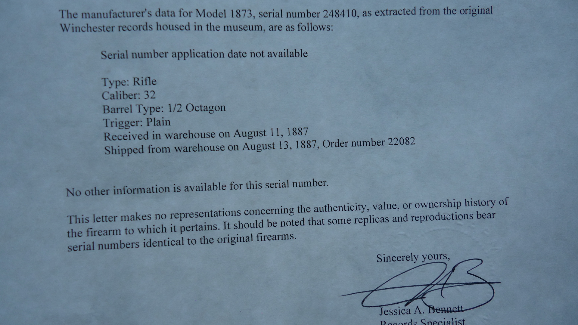 W4513 SPECIAL ORDER WINCHESTER MODEL 1873 RIFLE IN 32 WCF; Special order 24 inch half octagon barrel chambered in 32 WCF caliber with a shiny bore and light frosting on the rifling. Sights include a Marble No. 6 blade front and sporting rear with a rare Winchester 62B tang sight. Barrel and full length magazine tube are a blue/brown patina with more blue in the protected areas. Magazine tube and forend cap are more brownish in color. Receiver has a lot of blue with the balance fading to brown. Hammer and lever are mostly gray. Faded blue on the loading gate. Crisp functioning action. Walnut stock set is in good condition with a rifle style buttplate. Not a bad looking Winchester rifle that was made in 1887. Complete with factory letter verifying the caliber and configuration.