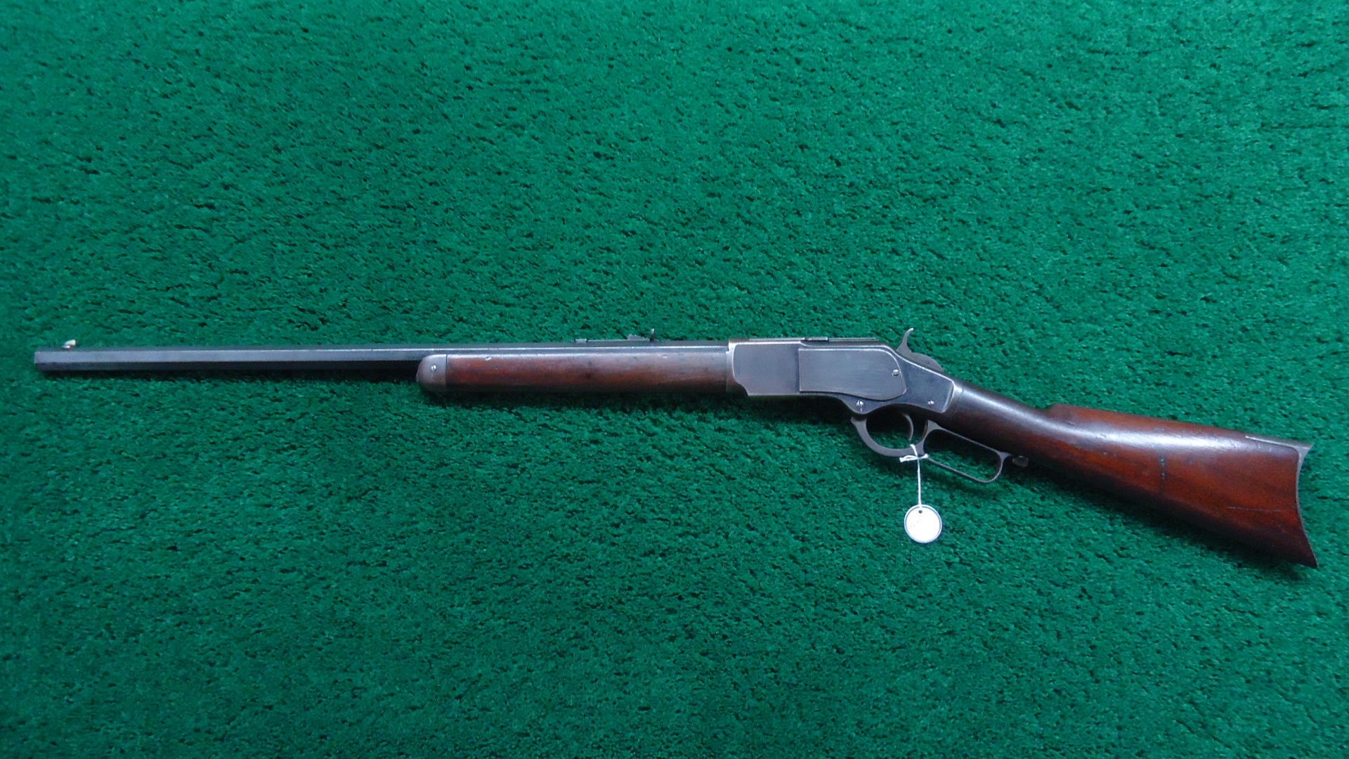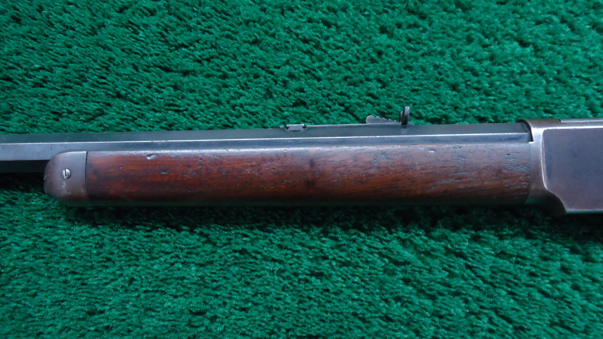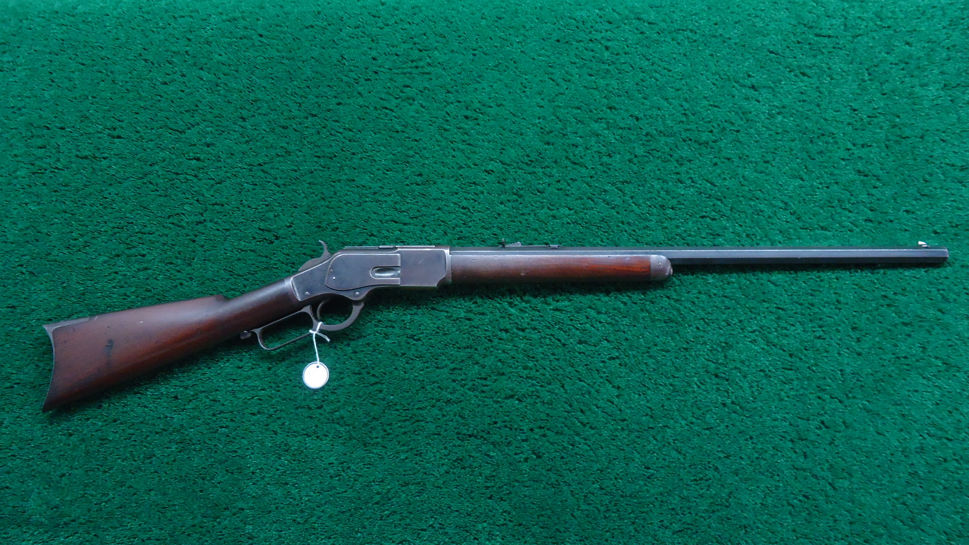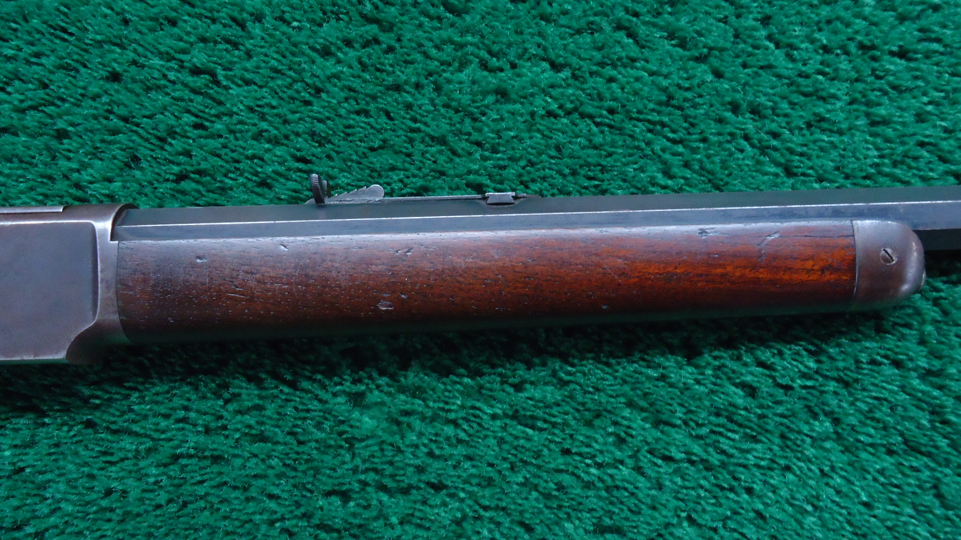 W4517 WINCHESTER MODEL 1873 RIFLE IN 44 WCF WITH 1/2 MAGAZINE; 24 inch octagon barrel chambered in 44 WCF caliber with a bright bore that has strong rifling. Sights include a German silver blade front and a flattop sporting rear. Barrel has thinning blue with scattered light scratches and marks. Special order half length button magazine. Receiver has thinning blue with some scratches and light frecking. Faint traces of case colors on the hammer and lever. About 50% blue on the loading gate. Crisp functioning action. Walnut stock set has a worn appearance with some handling mars and a noticeable dent on the right side of the stock. Rifle style buttplate with no cleaning rod in the trapdoor. A special order Winchester rifle that got used and was made in 1888.