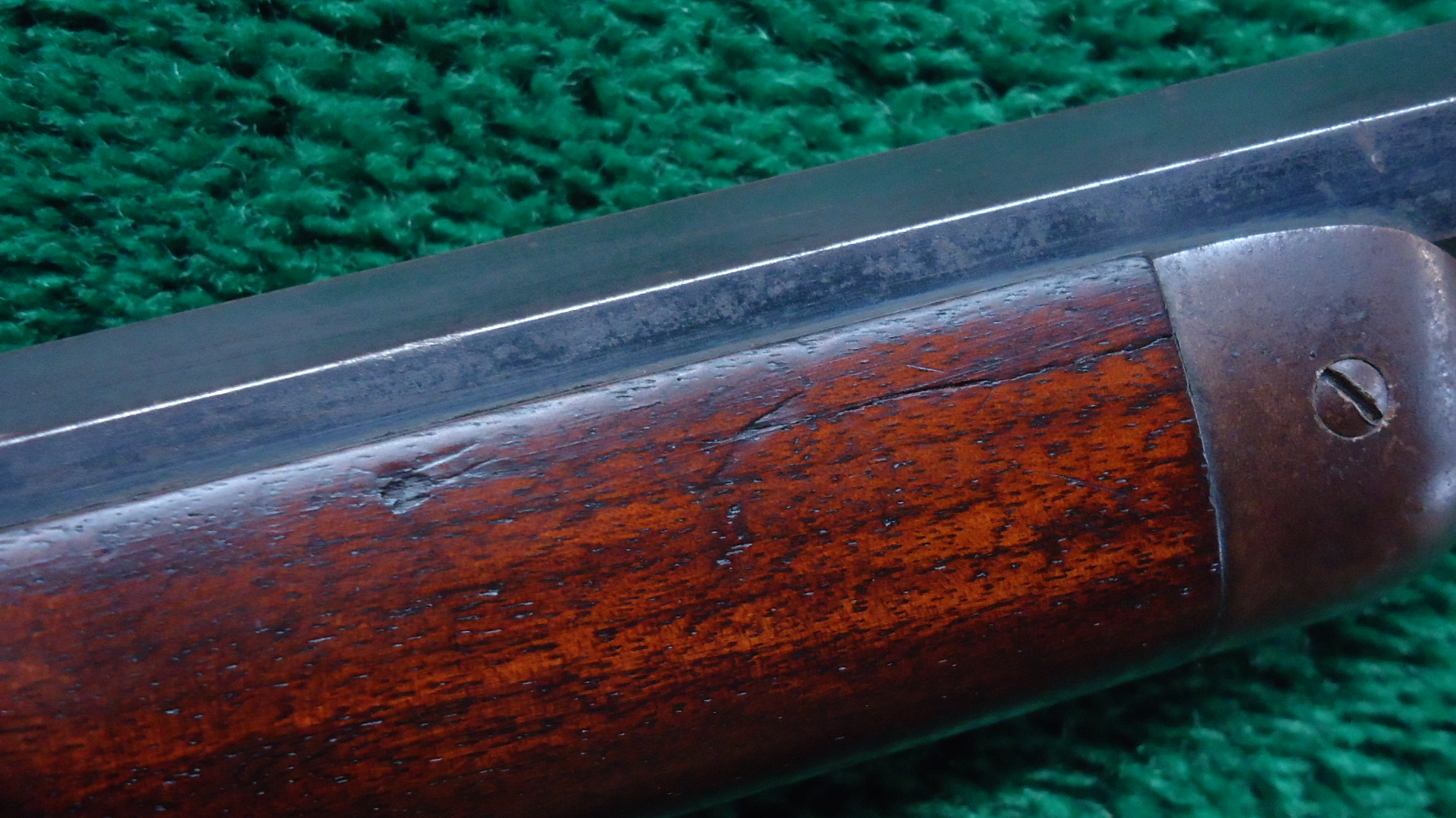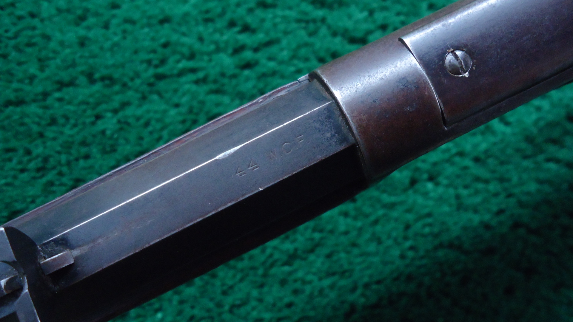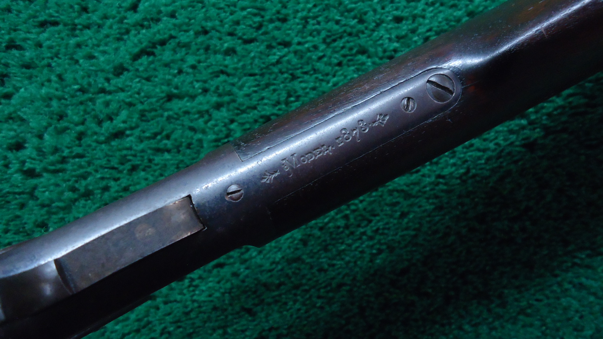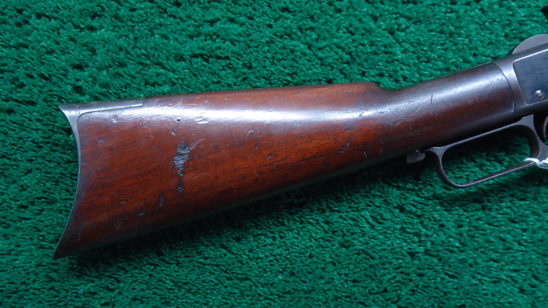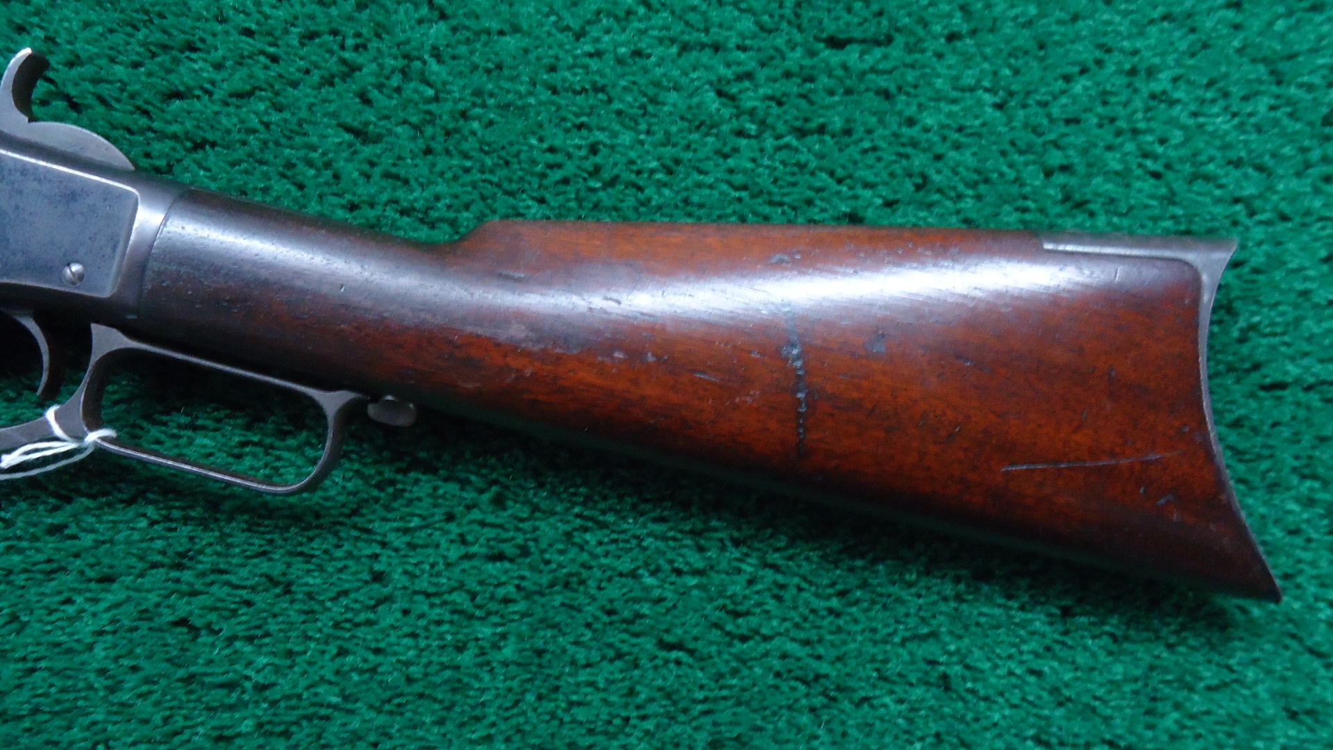 W4517 WINCHESTER MODEL 1873 RIFLE IN 44 WCF WITH 1/2 MAGAZINE; 24 inch octagon barrel chambered in 44 WCF caliber with a bright bore that has strong rifling. Sights include a German silver blade front and a flattop sporting rear. Barrel has thinning blue with scattered light scratches and marks. Special order half length button magazine. Receiver has thinning blue with some scratches and light frecking. Faint traces of case colors on the hammer and lever. About 50% blue on the loading gate. Crisp functioning action. Walnut stock set has a worn appearance with some handling mars and a noticeable dent on the right side of the stock. Rifle style buttplate with no cleaning rod in the trapdoor. A special order Winchester rifle that got used and was made in 1888.