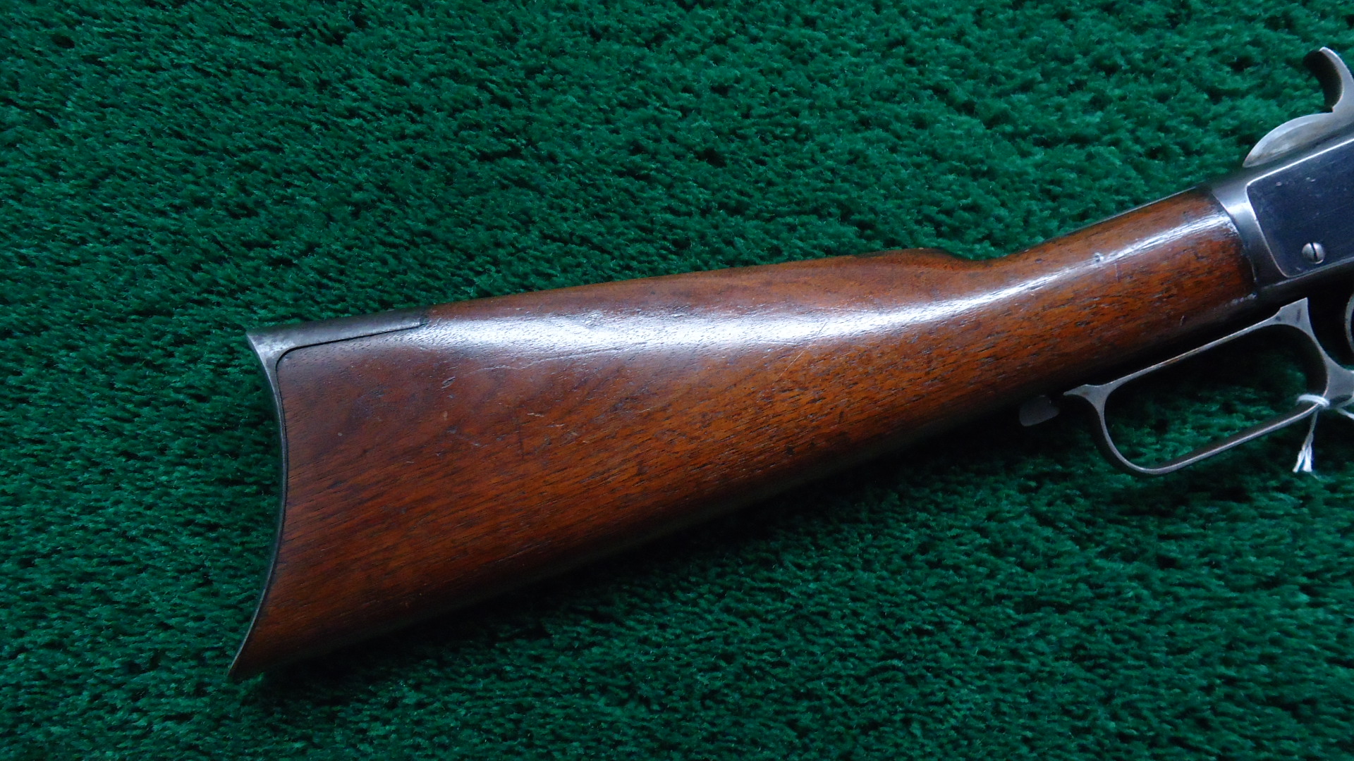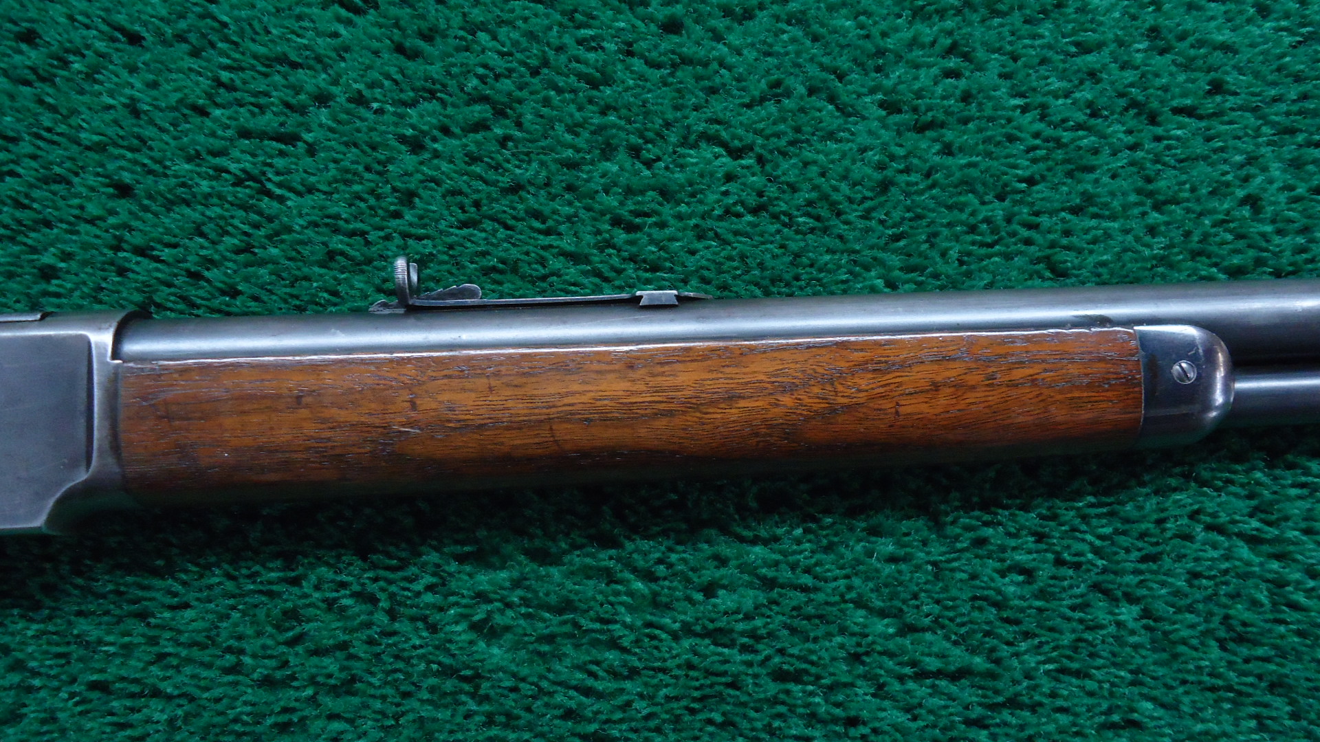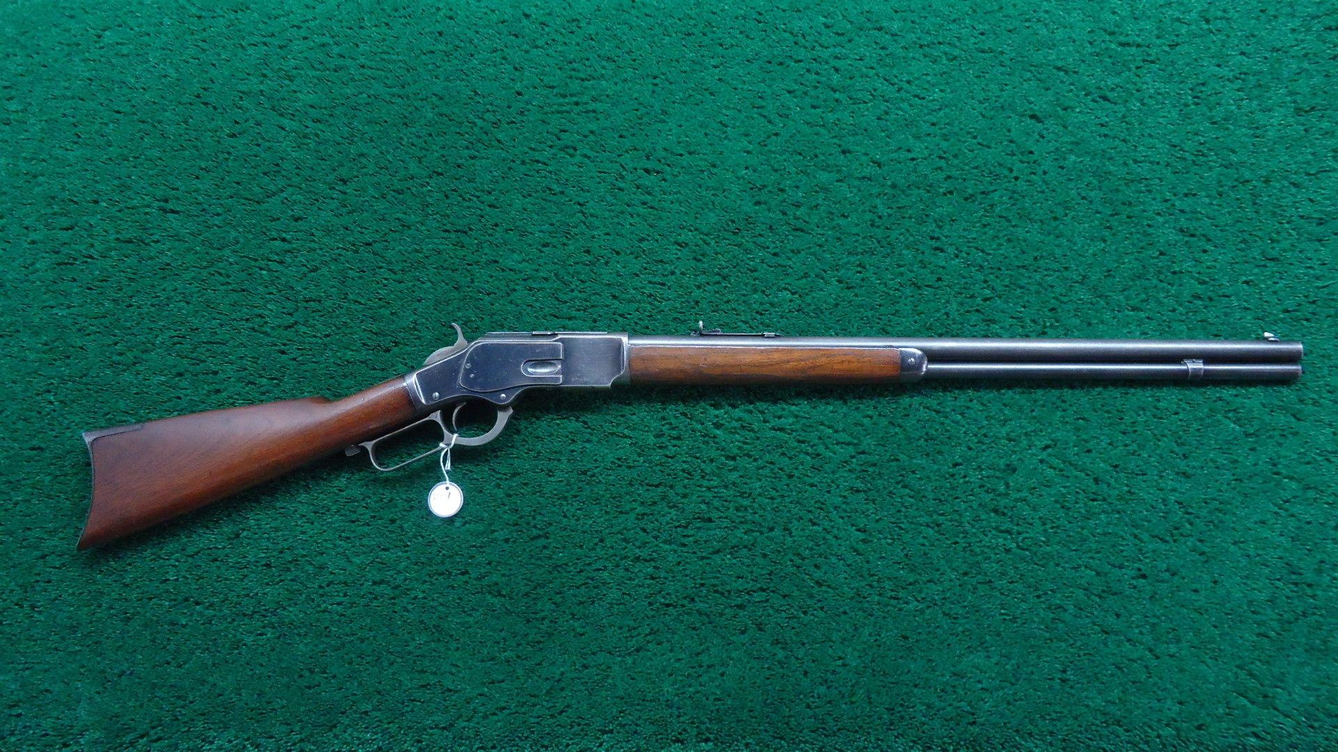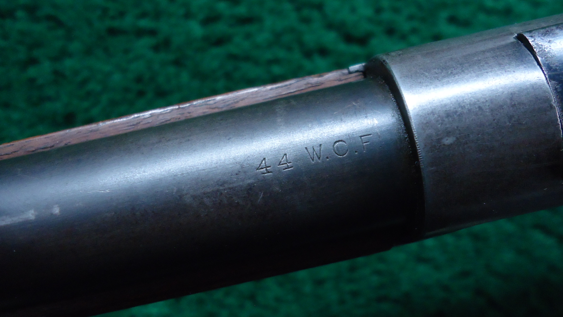 W4519 WINCHESTER MODEL 1873 RIFLE IN 44 WCF; 24 inch octagon barrel chambered in 44 WCF caliber with a bright shiny bore with strong rifling and a few scattered pits. Sights include a German silver blade front and sporting rear. Barrel and full length magazine tube have thinning fading blue with some scratches. Receiver has thinning blue with some spots of corrosion with a series of tiny dents on the forward part of the frame. Some edge wear and traces of case colors on the hammer and lever. About 50% blue on the loading gate. Crisp functioning action. Walnut stock set is in good condition with some handling mars. Rifle style buttplate with no cleaning rod in the trapdoor. An honest looking Winchester rifle that was made in 1890.