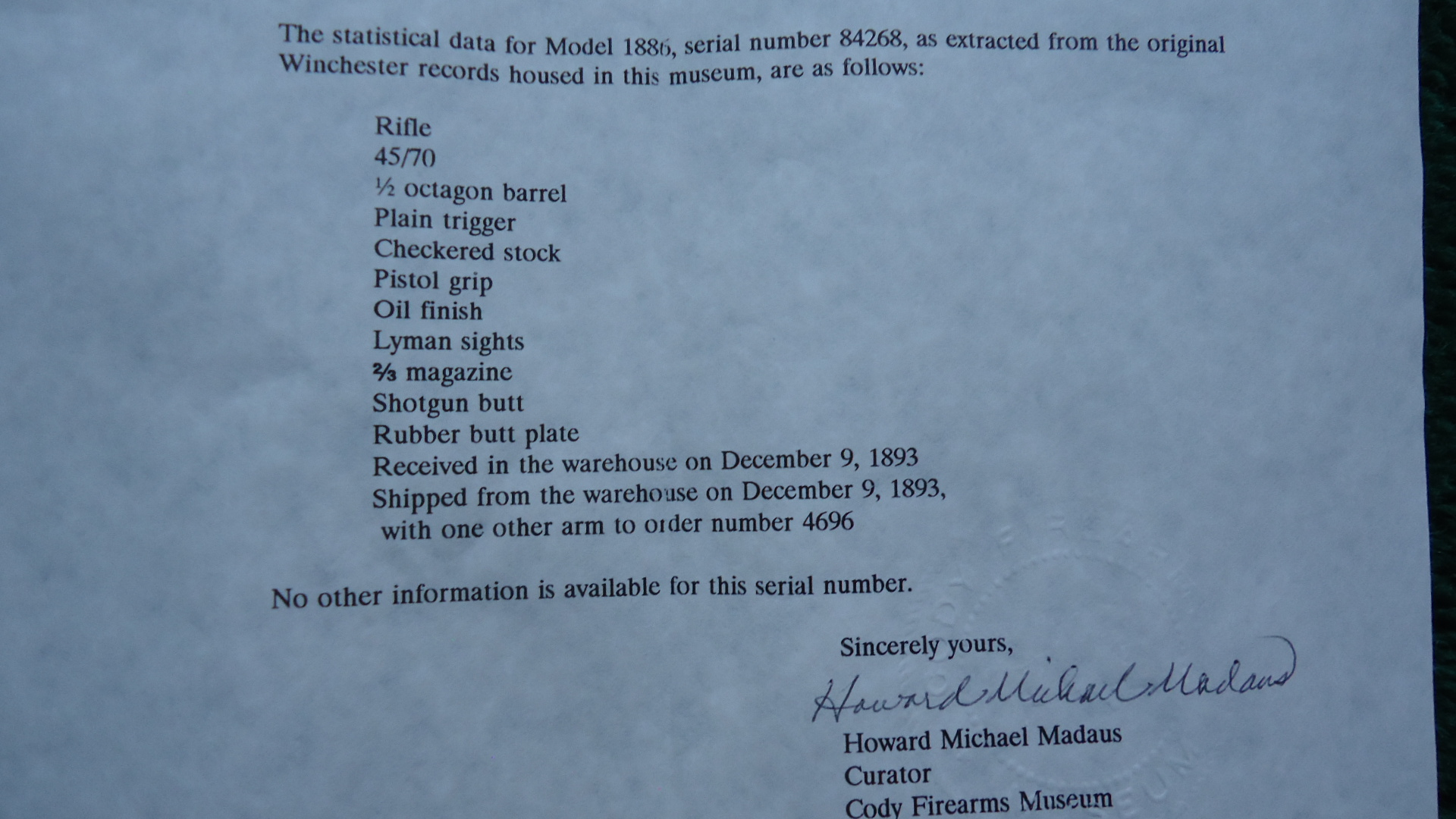 W4528 SPECIAL ORDER WINCHESTER MODEL 1886 DELUXE RIFLE IN 45-70 CALIBER; Special order 26 inch half octagon barrel chambered in the desirable 45-70 WCF caliber with a very good shiny bore. Sights include a German silver blade front with a graduated leaf folding rear and a Lyman folding tang. Barrel and 2/3 length magazine tube retain most thinning blue. Forend cap has traces of color. Casehardened receiver has fading colors on both sides. Hammer and lever have traces of case colors. Loading gate is a blue/gray. Crisp tight functioning action. Checkered XX fancy Walnut forearm and pistolgrip stock set with oil finish have an age darkened appearance with some handling mars and a shotgun butt with hard rubber buttplate. A very usable caliber on a special order Winchester that the original owner new exactly what they wanted in a rifle. This one was made in 1893 and comes with a factory Cody Firearms letter stating the configuration and date of manufacture.