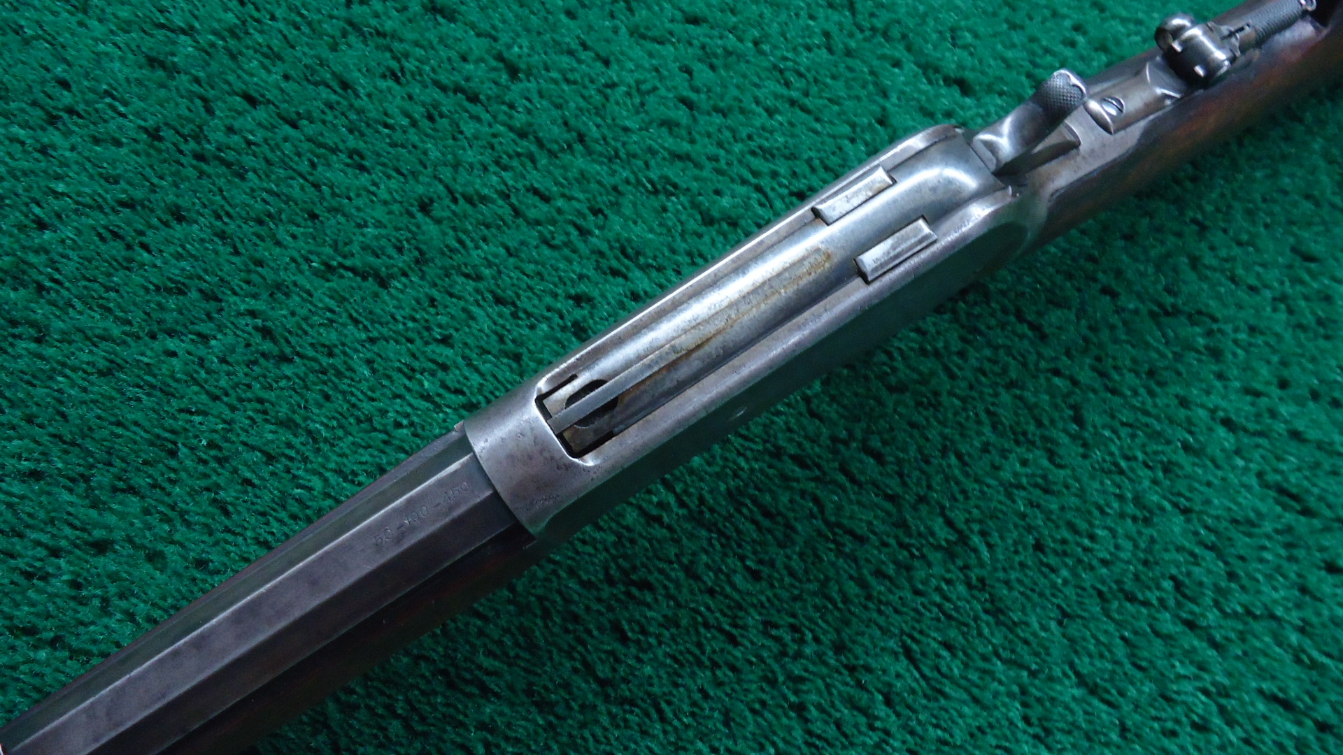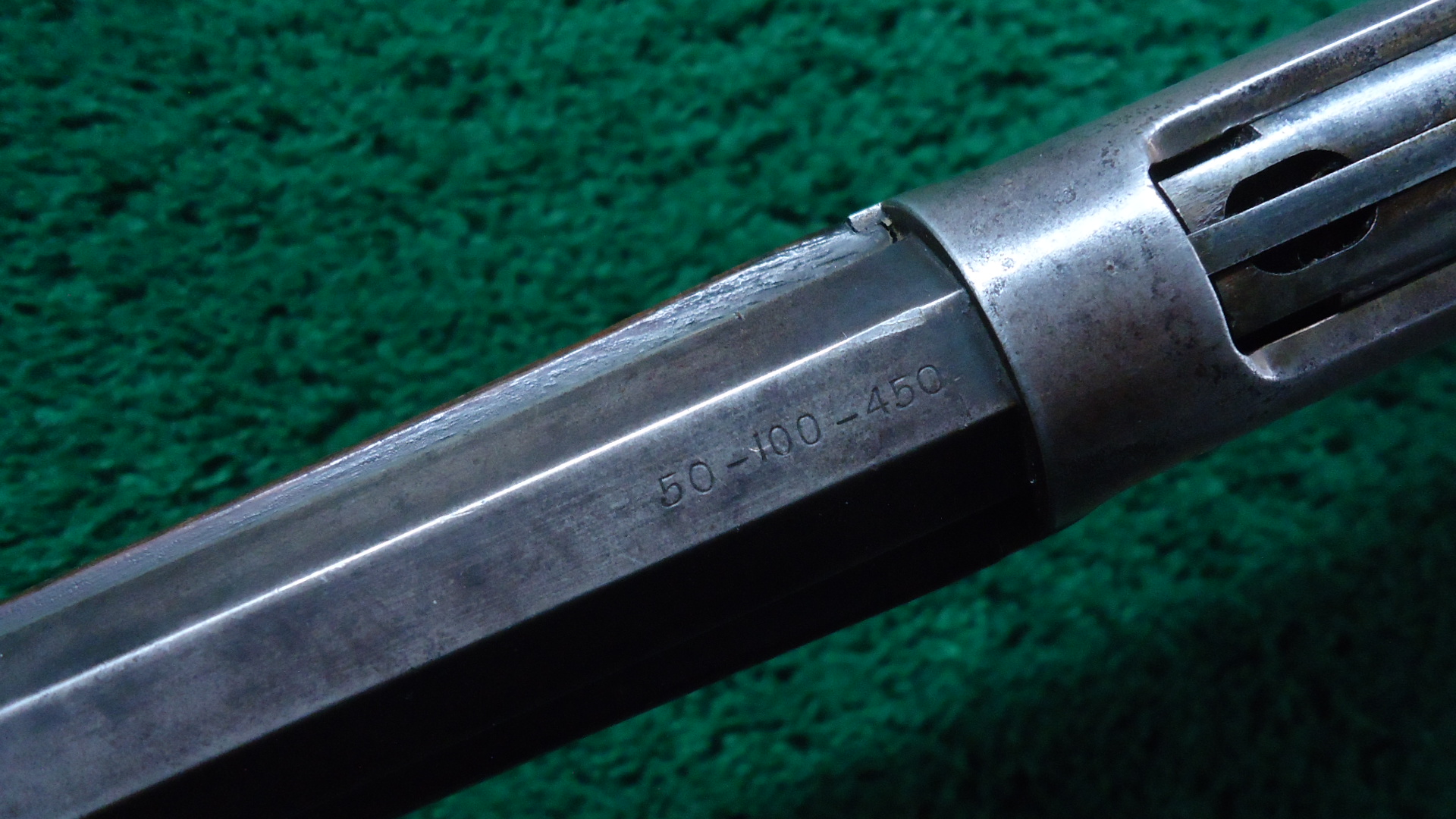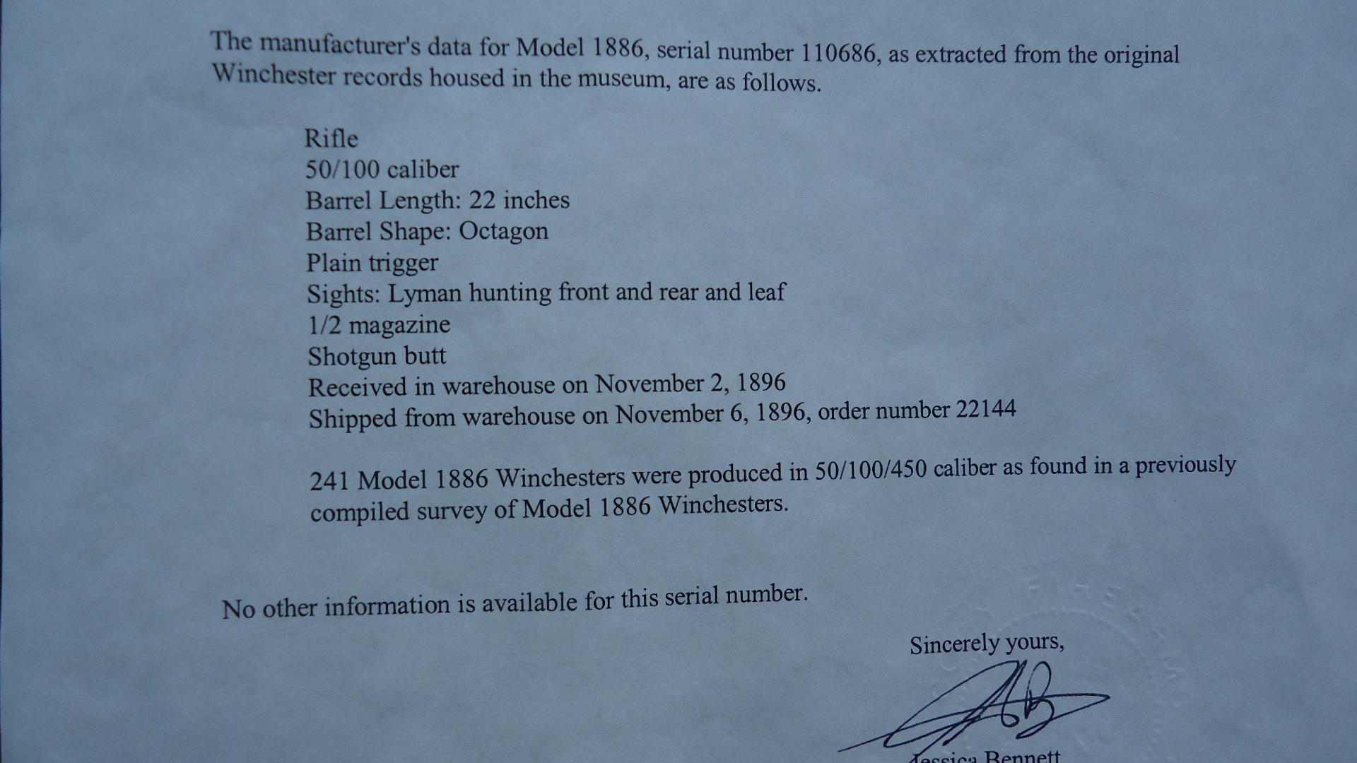 W4529 ANTIQUE WINCHESTER MODEL 1886 RIFLE IN VERY SCARCE 50-100-450 CALIBER; 22 inch octagon barrel chambered in the very desirable 50-100-450 caliber. Bore has visible rifling with scattered roughness throughout. Sights include a Lyman hunting blade front with leaf rear and Lyman peep folding tang sight. Barrel is a brown patina and has some dings and scratches with traces of blue in the protected areas. Special ordered half length magazine. Receiver is a mottled gray with some light pitting. Hammer and lever have good traces of case colors. Very crisp tight action. Walnut stocks have scattered minor dings and scratches with a small crack by the toe with a special order steel shotgun buttplate. Comes with factory letter confirming the caliber and configuration. Manufactured in 1896. Letter also states that only 241 Model 1886 Winchesters were produced in 50-100-450 caliber. There were only 11 manufactured with the 22 inch barrel length and 74 with a 1/2 magazine. Your chance to add a seldom seen Winchester to your collection. These just hardly ever come up for sale.