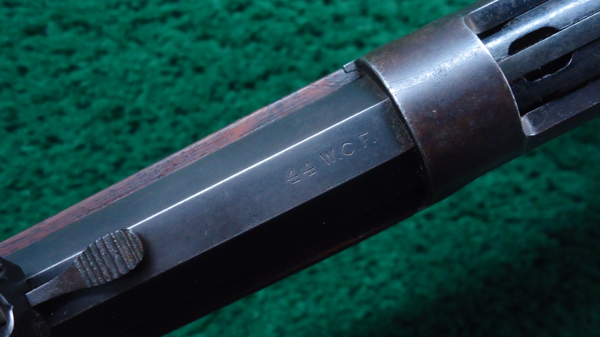 W4532 ANTIQUE WINCHESTER MODEL 1892 RIFLE IN DESIRABLE 44 WCF; Standard configuration featuring a 24 inch octagon barrel chambered in 44 WCF caliber with a full length magazine. Bore has shine and strong rifling with a few scattered spots of roughness. Sights include a German silver blade front and a sporting rear with a peep folding tang sight. Barrel and magazine tube retain most all thinning blue. Receiver has thinning blue turning a plum patina. Traces of case colors remain on the hammer and lever. Walnut stocks are overall good condition with several handling mars. Rifle style crescent buttplate. Nice crisp functioning action. This is a second year of production Model 1892 rifle in 44 WCF that has everything you are looking for and would look good in any Winchester collection. A good honest gun.