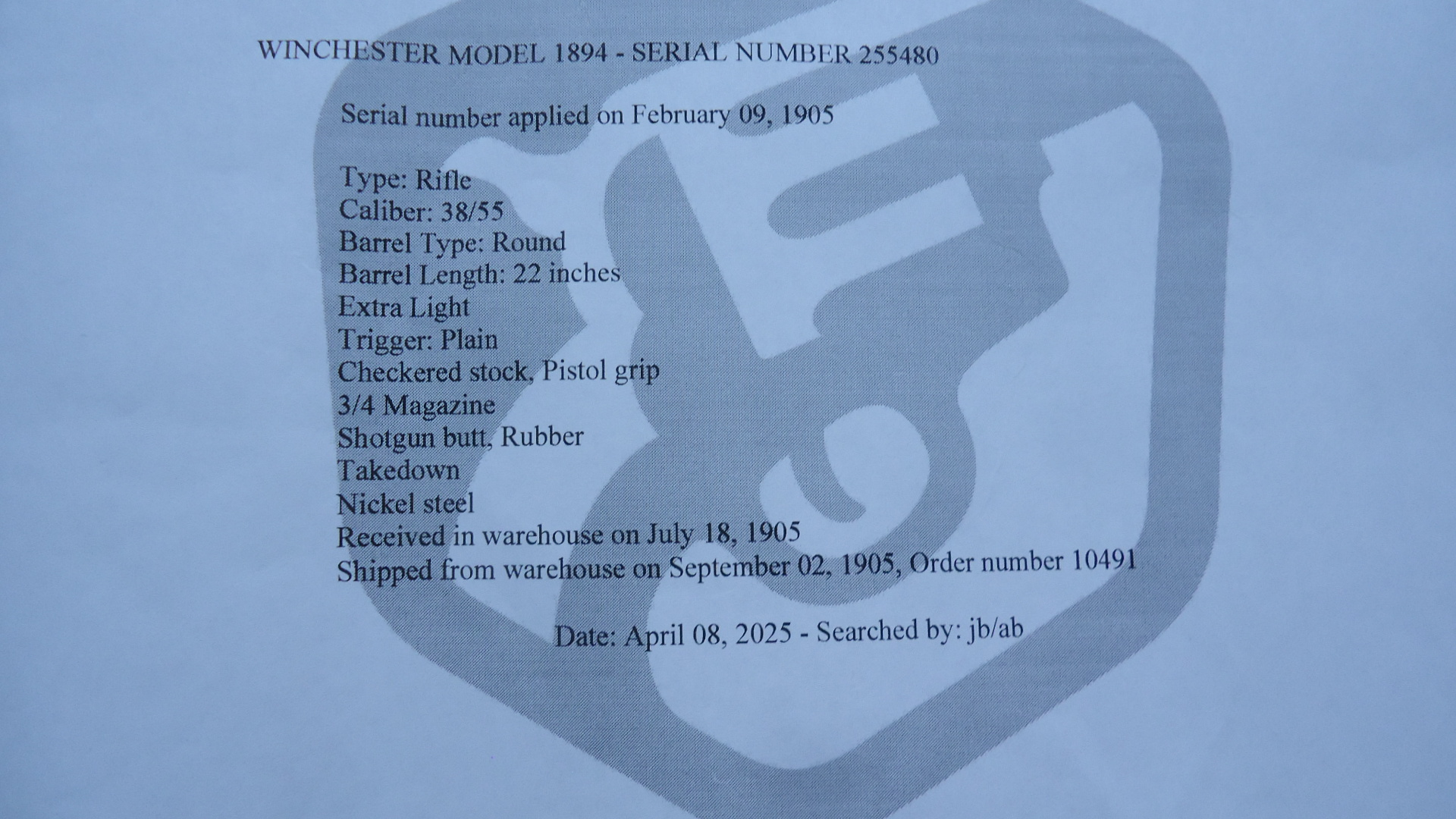 W4537 WINCHESTER MODEL 1894 DLX EXTRA LIGHTWEIGHT RIFLE IN 38-55; 22 inch tapered round Nickel steel barrel chambered in 30 WCF caliber with a bright shiny bore and strong rifling. Barrel and 3/4 length magazine tube have been cleaned long ago and are a mottled gray color. Sights include a Beaches combination front with a sporting rear and a combination peep folding tang sight. Takedown collar and forend cap both show some spots of light pitting. Receiver still has a good amount of blue remaining with a few scattered light pits. Hammer and lever show traces of case colors. Crisp functioning action. Checkered walnut forearm and pistolgrip stock with hard rubber grip cap are in good condition with a hard rubber shotgun buttplate. A lot of features, somebody knew what they wanted when this one was ordered. Manufactured in 1905 and comes with a Cody Firearms research form stating the special order features and configuration. Should be a good shooter.