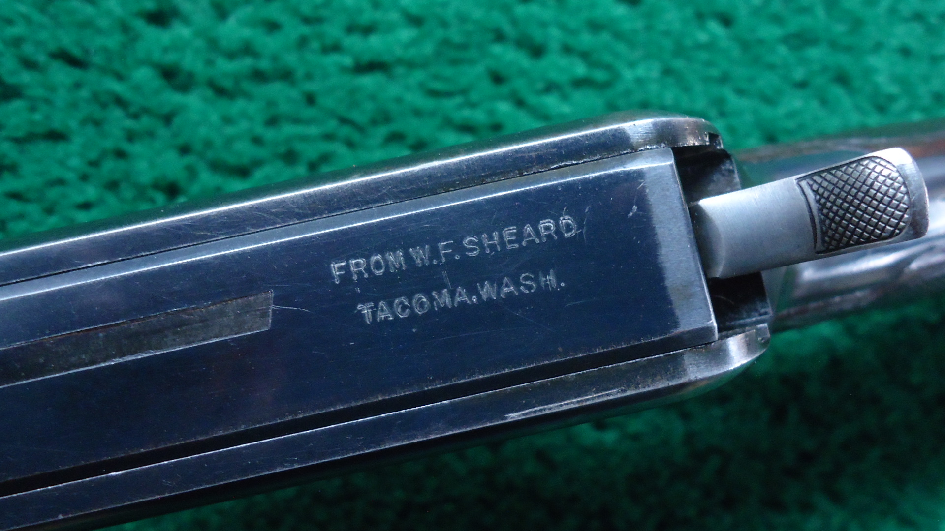 W4551 W. F. SHEARD MARKED WINCHESTER MODEL 1895 DELUXE RIFLE IN CALIBER 30 US / 30-40 KRAG; 28 inch round nickel steel barrel is marked 30 US. Pinned blade with bead front sight and half buckhorn sporting rear. Top of breechblock is retailer marked “FROM W.F. SHEARD/ TOCOMA, WASH.”. Checkered deluxe walnut stocks. Winchester marked hard rubber shotgun style buttplate. Metal surfaces are mostly clean and smooth showing light wear and handling marks with the barrel showing 90% original blue, the receiver showing about 80% and the lever and magazine showing about 70%. The bore is excellent, bright and shiny with strong rifling. The stocks are solid and full fitting having been freshened up some time ago with a coat of finish added over muted checkering now showing light wear and handling marks.