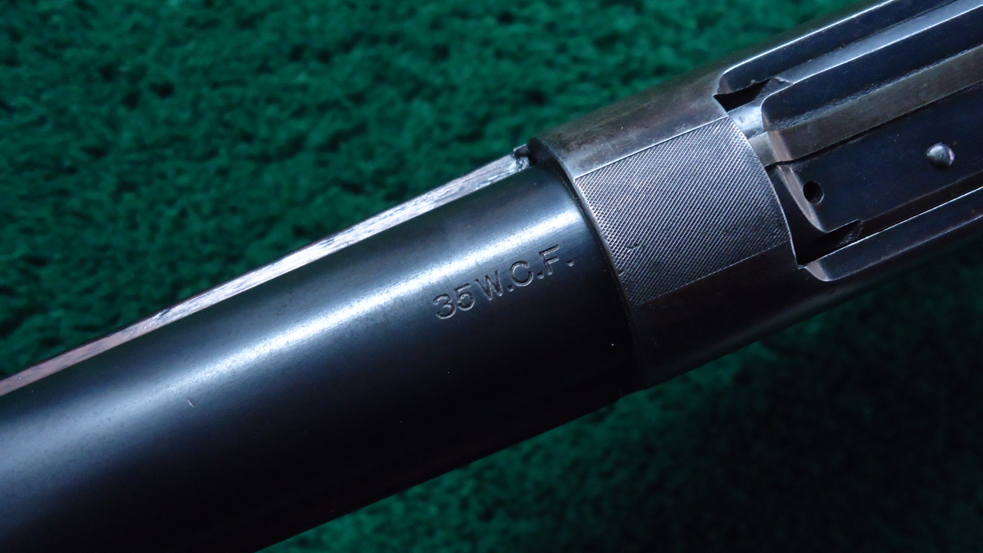 W4553 WINCHESTER MODEL 1895 RIFLE CHAMBERED FOR 35 WCF; 24 inch round barrel. Lyman ivory bead front sight with half buckhorn sporting rear. 4 round box magazine. Plain walnut forearm with matching straight grip buttstock fit with a crescent rifle buttplate. Good condition overall with barrel showing about 95% touched up blue over areas of light residual pitting. About good bore shows areas of light roughnes with otherwise decent rifling. Receiver shows about 40% finish with thinning areas turning brown and has a threaded plugged hole added on the left side. Stocks are solid and full fitting with a coat of finish added now showing light wear and handling marks. Manufactured in 1903.
