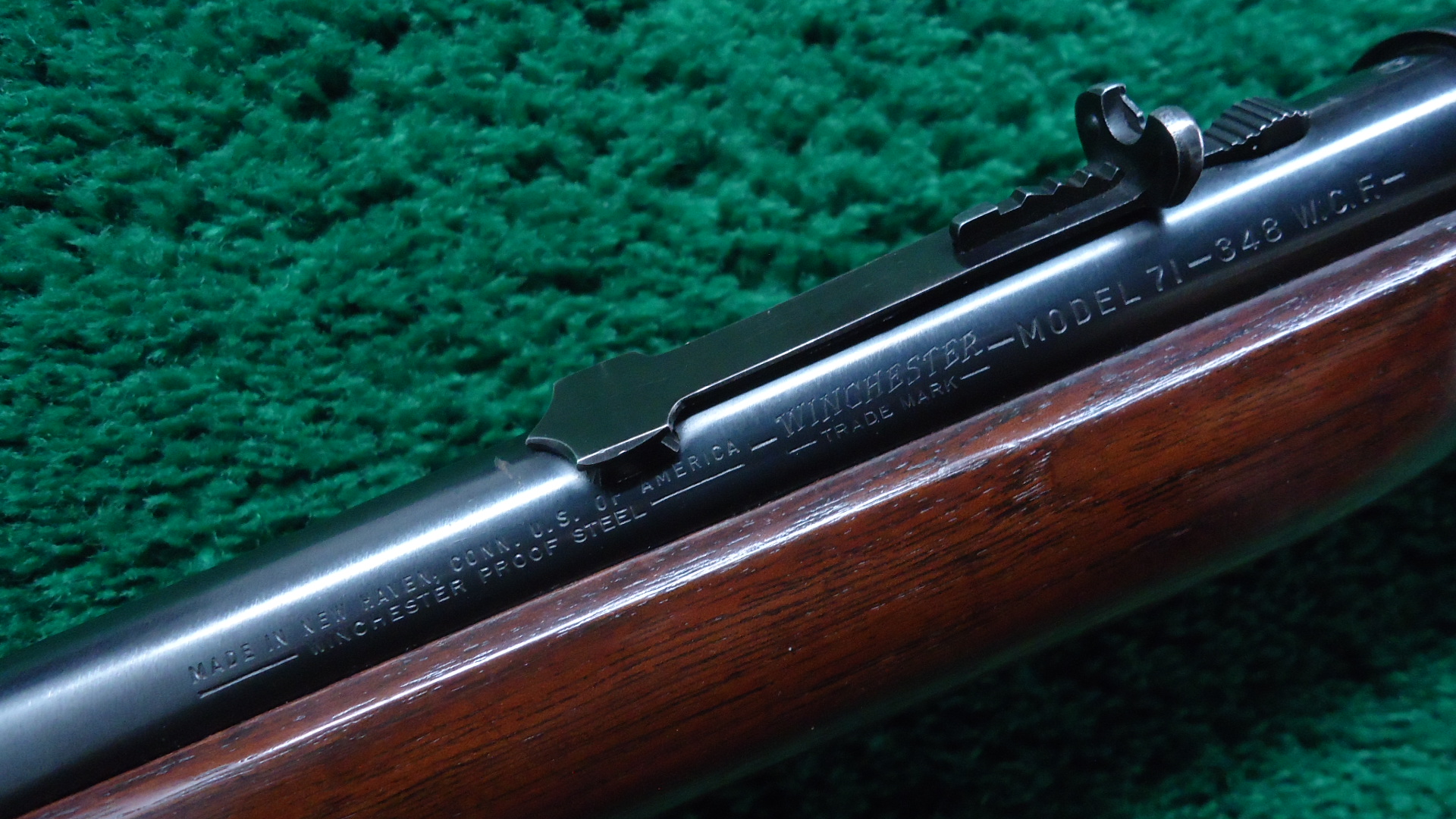 W4557 WINCHESTER MODEL 71 STANDARD LEVER ACTION RIFLE IN .348 WCF; 24 inch round barrel. Bead on ramp with hood front sight with sporting rear. 4 shot 2/3 length tube magazine. Plain walnut forearm with matching pistol grip buttstock featuring sling swivels and a checked steel shotgun style buttplate. Near excellent condition overall with metal surfaces showing about 85% original blued finish. Bore is excellent, bright and shiny with strong rifling. Stocks are solid and full fitting with a light coat of finish added now showing light wear and handling marks. Manufactured in 1950.