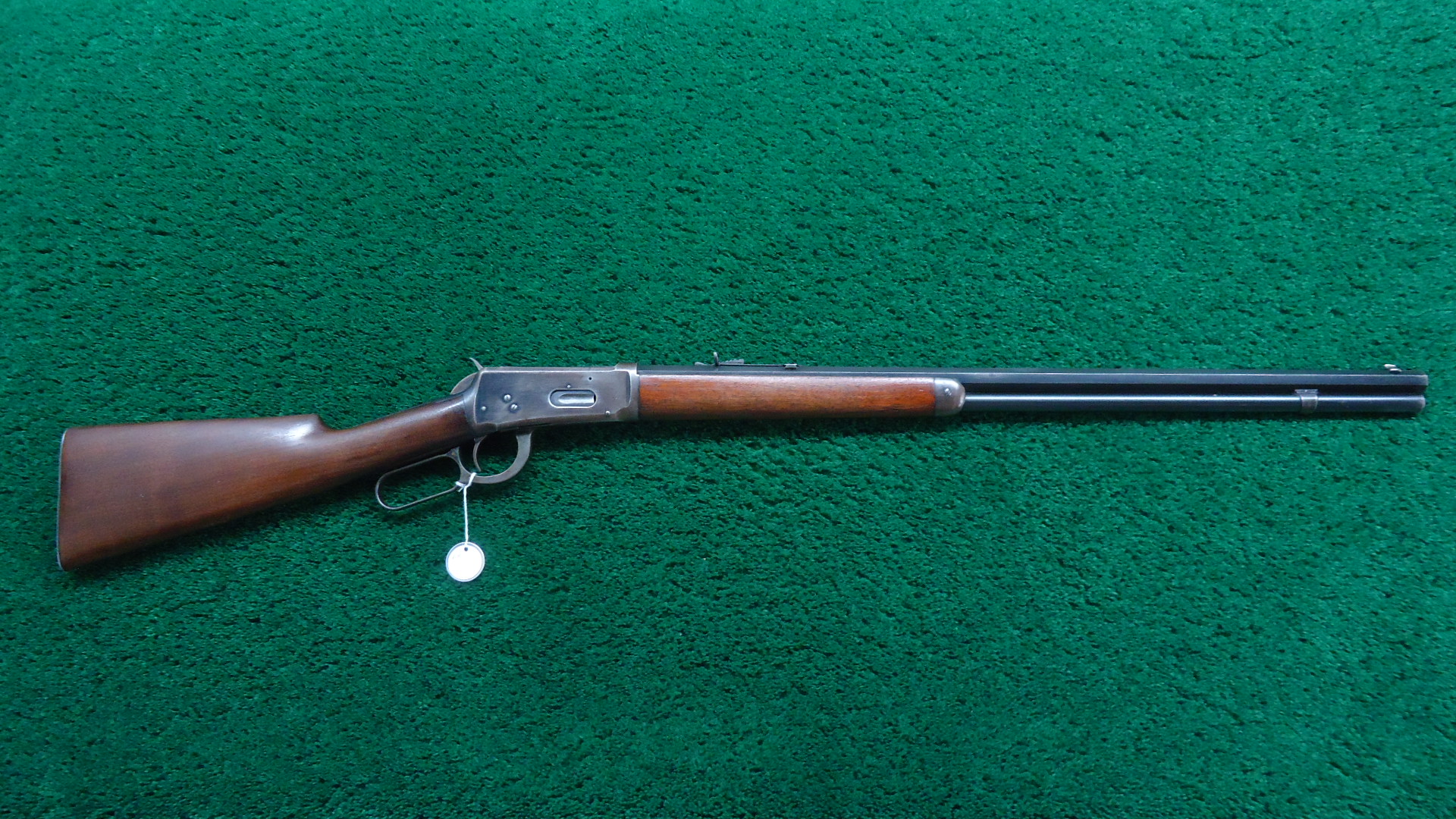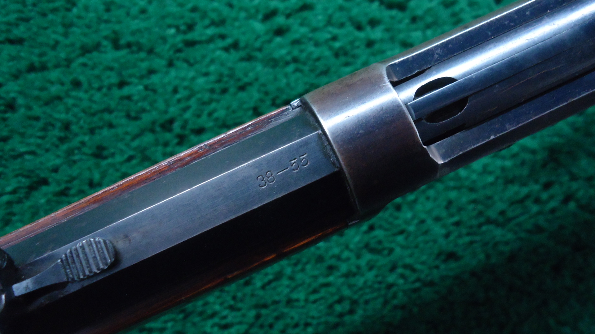 W4570 WINCHESTER MODEL 1894 RIFLE CHAMBERED FOR 38-55; 26 inch octagon barrel. Full length tube magazine. Original sights include No. 21 Sporting front with nickel silver insert and No. 22 Sporting rear. Plain walnut forearm with matching straight grip buttstock fit with a checkered steel shotgun style buttplate. Very good condition overall with barrel and magazine showing about 70% original blued finish. The receiver shows about 40% finish with thinning areas appearing gray turning to brown. Hammer and Lever show nice case coloring. Very good bore is bright and fairly shiny with decent rifling. Stocks are solid and full fitting showing average wear and handling marks. Manufactured in 1904.