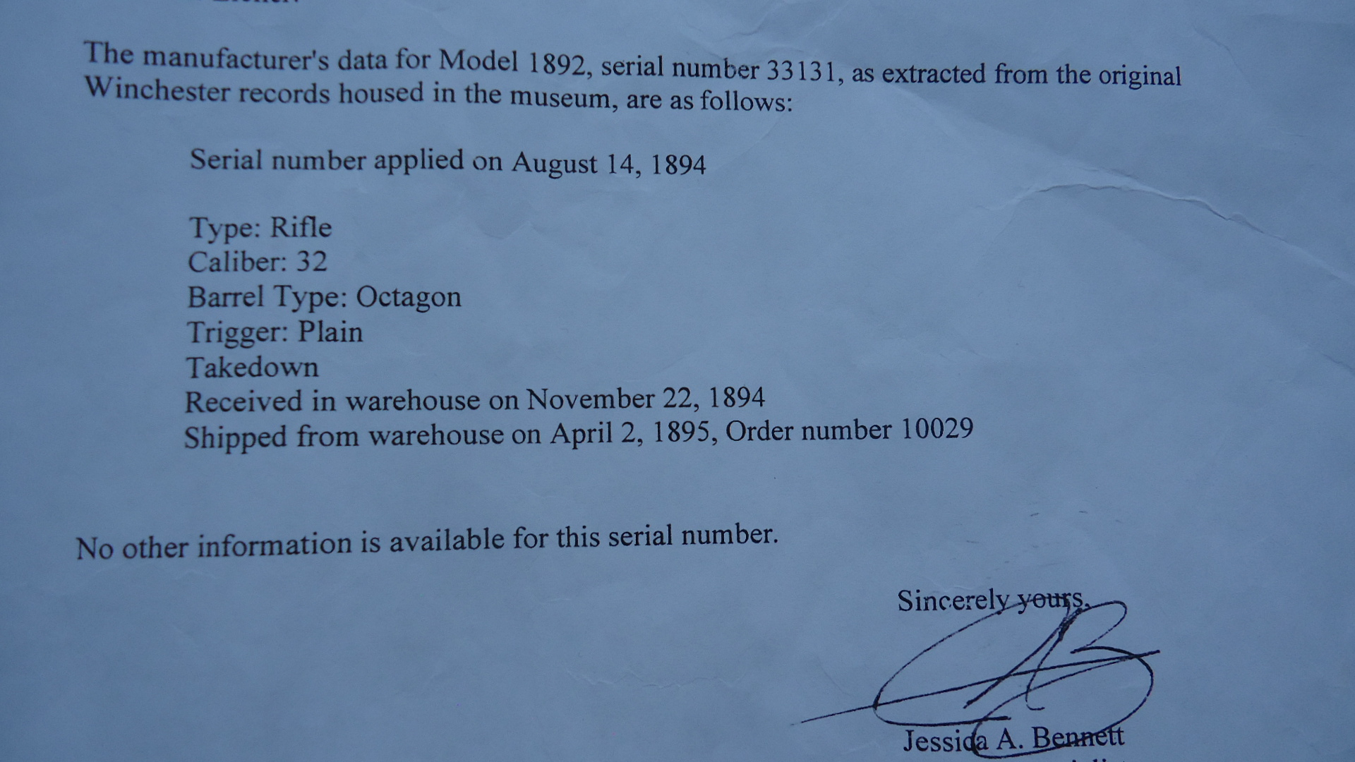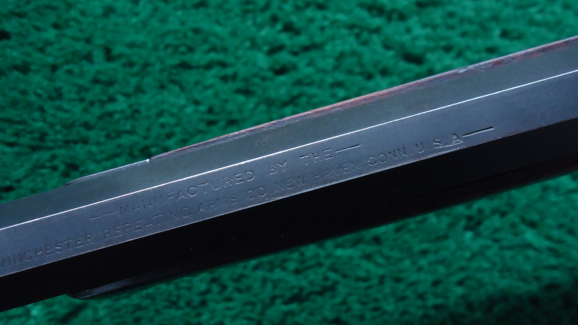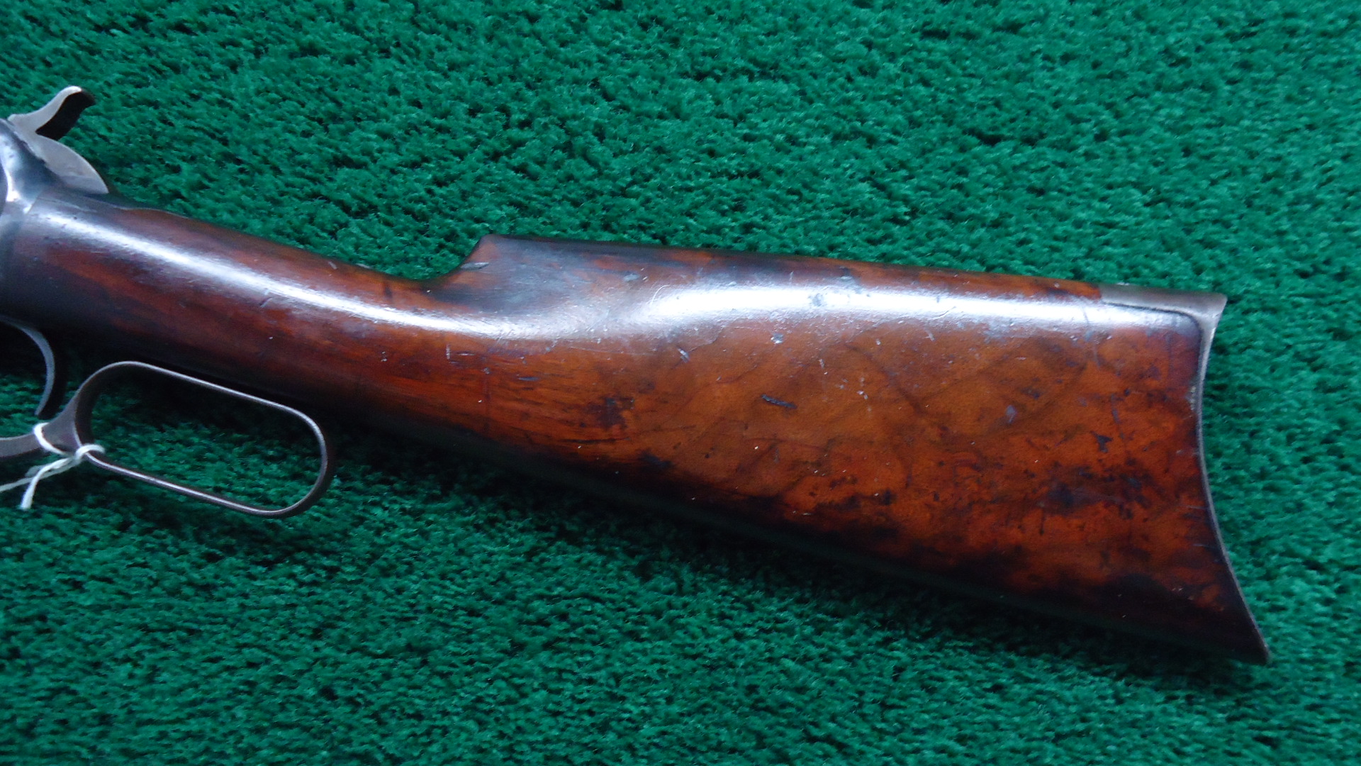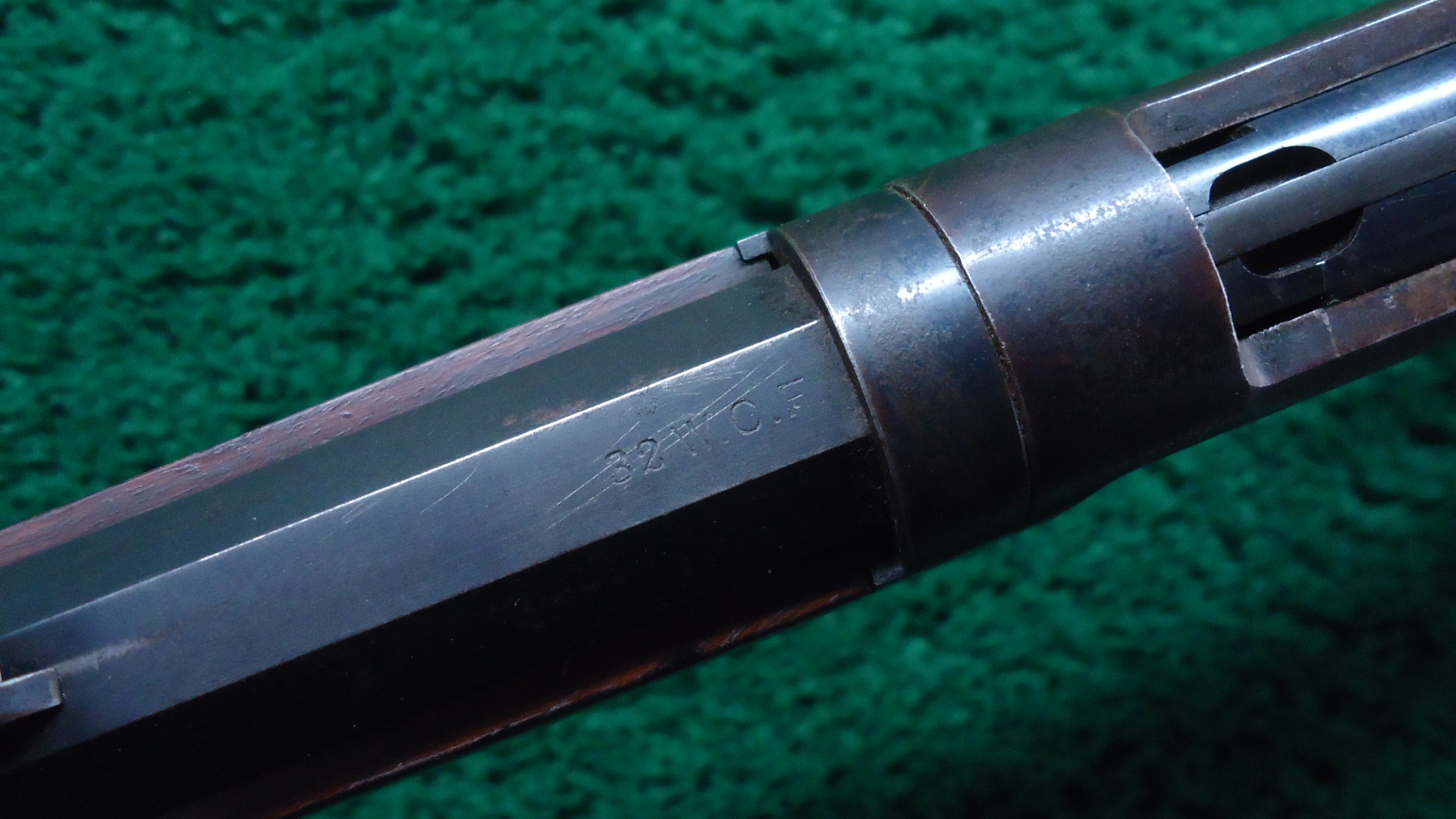 W4588 ANTIQUE WINCHESTER MODEL 1892 TD RIFLE IN 32 WCF; 24 inch octagon barrel chambered in 32 WCF caliber. Very good bore with shine and good rifling. Sights include a German silver blade front and semi-buckhorn sporting rear. Barrel and full length magazine tube retain about 95% blue with some some thinning and minor handling wear. Receiver has about 85% bright blue but shows some age freckling. Hammer and lever have traces of case colors. Bright blue on the loading gate. Forend cap retains most of its blue finish as well as the Takedown ring. Nice smooth functioning action. Walnut stock set is in good condition and fit well and are proud to the metal with some handling and usage mars. A little bit of figure showing as well. Rifle style buttplate. This Winchester rifle with Take-Down frame was made in 1894. Complete with a copy of a factory letter stating in the warehouse in November 1894 and shipped out in April 1895.