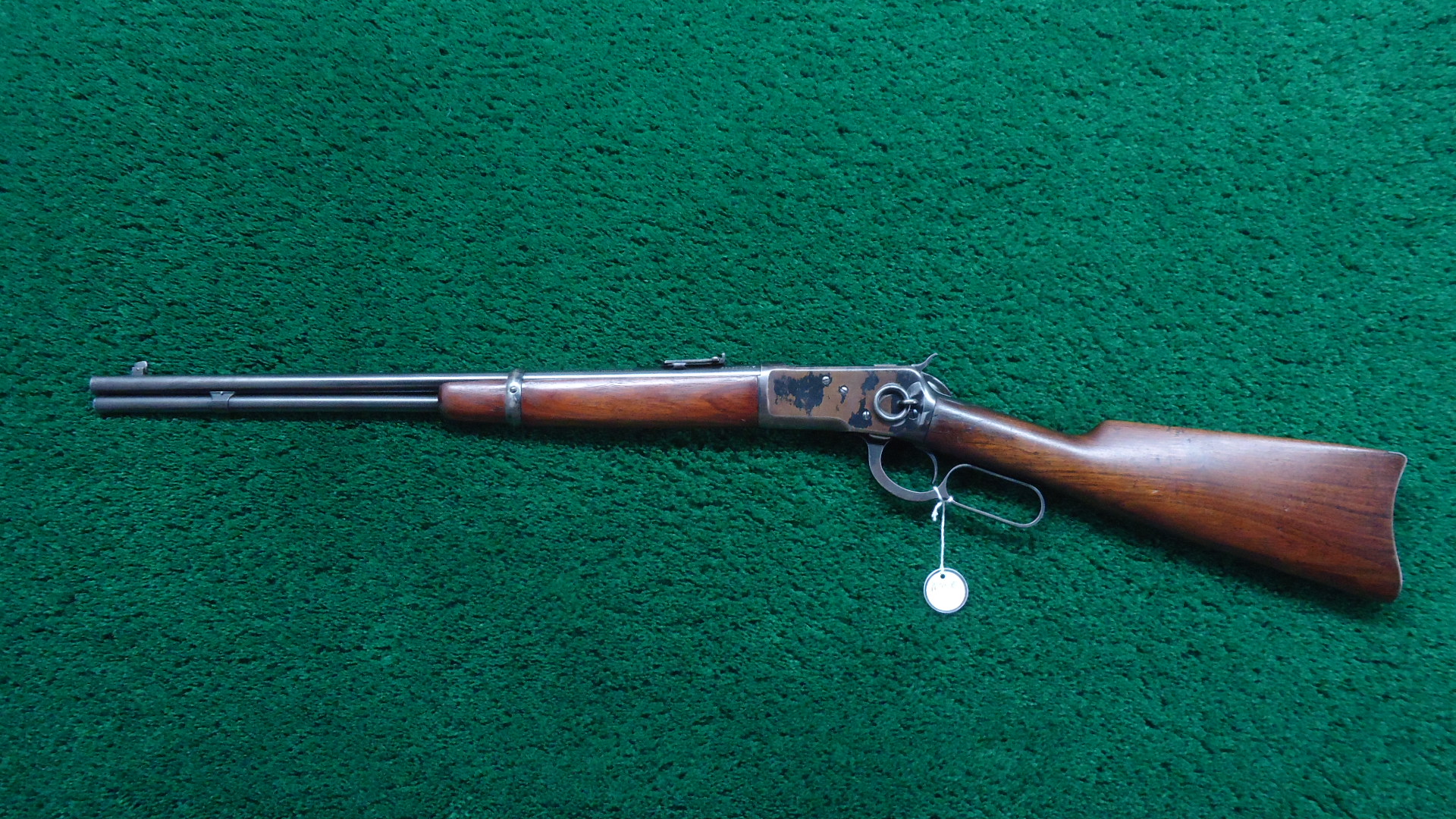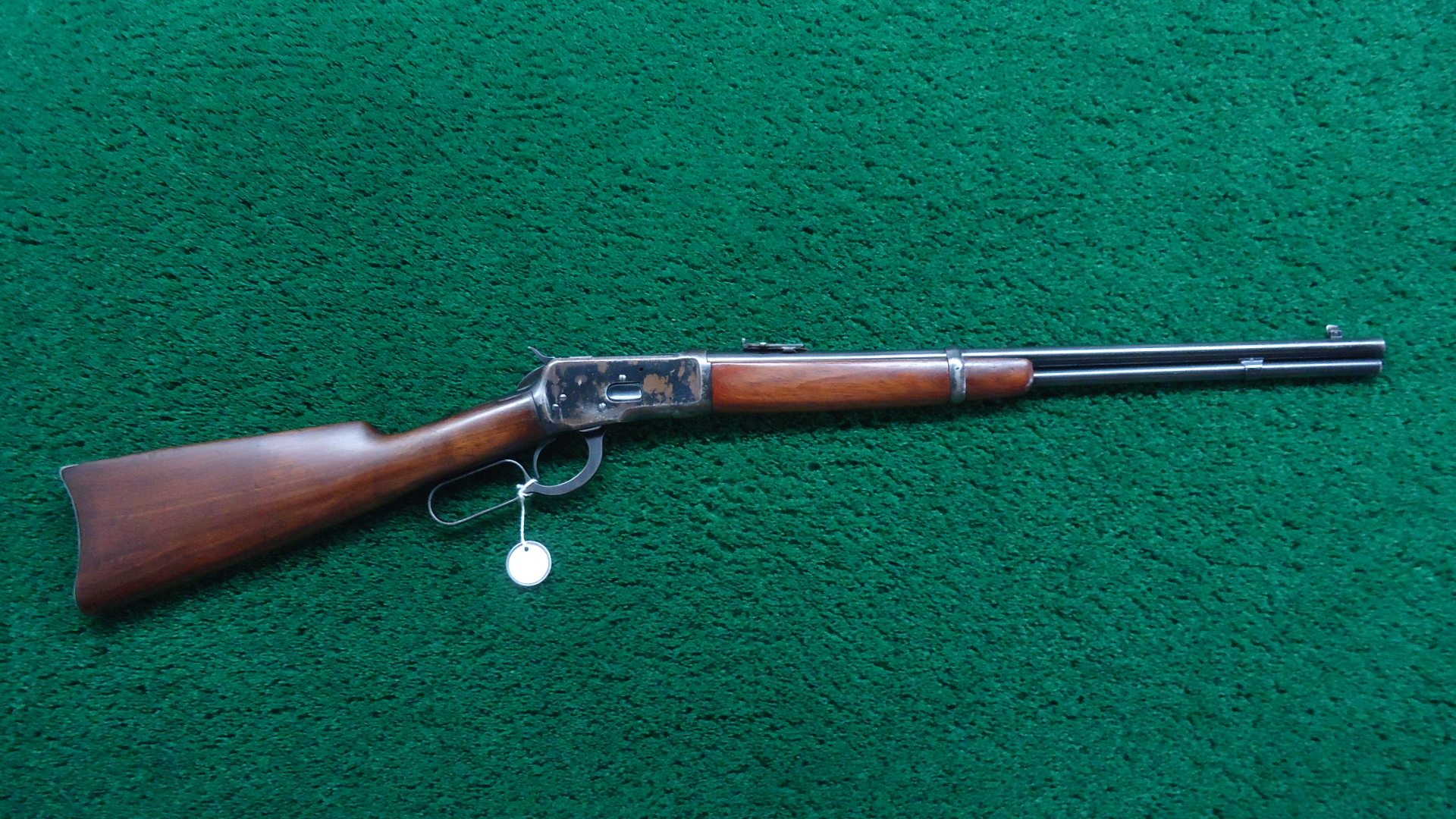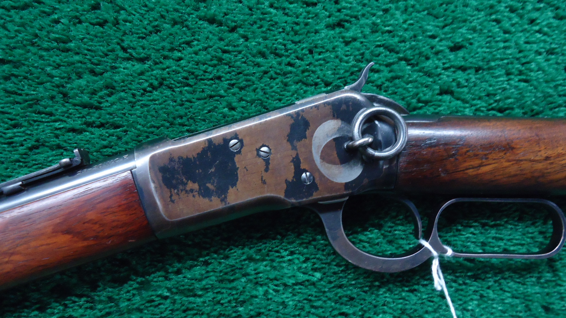 W4590 WINCHESTER MODEL 92 SADDLE RING CARBINE IN CALIBER 25-20 WCF; 20 inch round barrel. Full length tube magazine. Pinned blade front sight with folding ladder rear. Plain walnut forearm with matching straight grip buttstock fit with a carbine style buttplate. Barrel and magazine show about 80% original blue. Receiver shows about 40% original flaking blue with areas of flaking turning brown. Bore is fairly bright with some lightly frosted surfaces and strong rifling. Action is crisp and tight. Stocks have been lightly sanded and refinished at some time now showing light handling marks with the buttstock fitting full but the forearm being slightly shy at the bottom by the receiver. Manufactured in 1920.