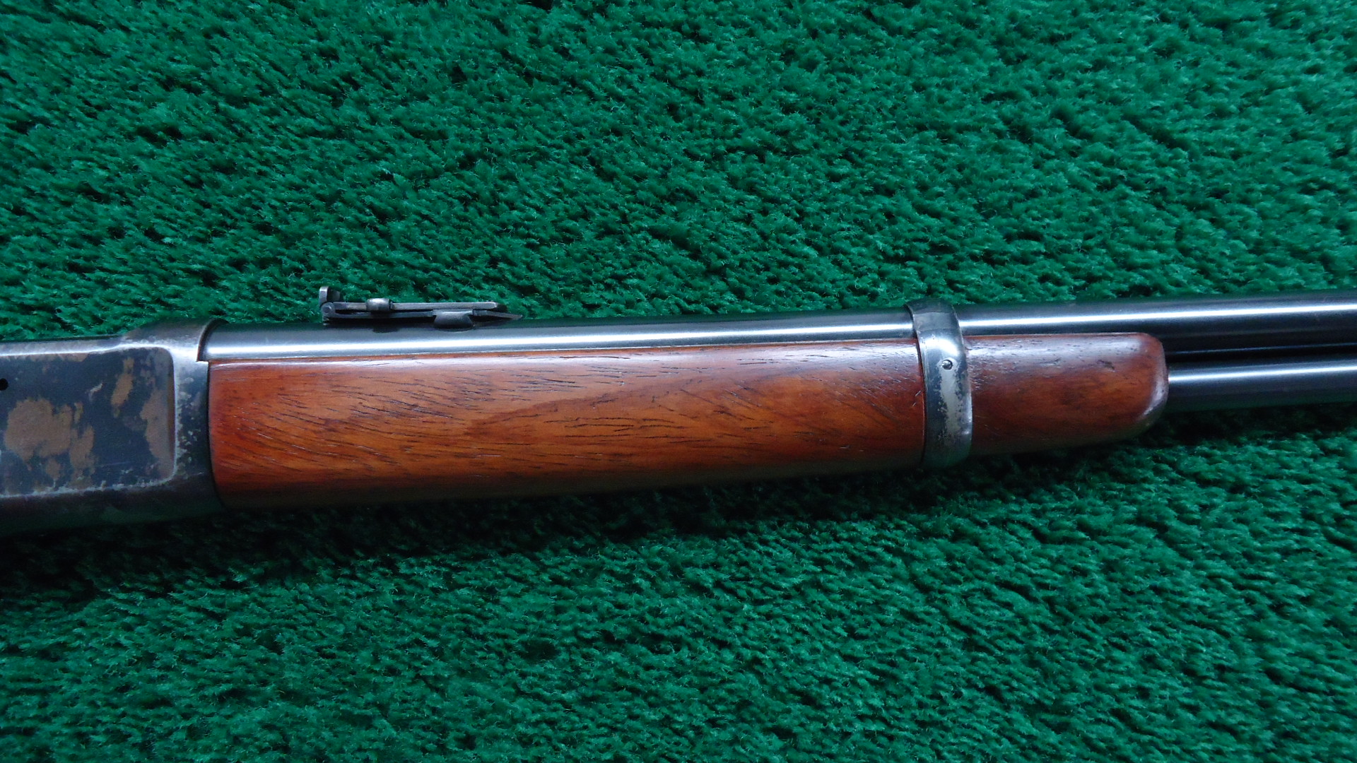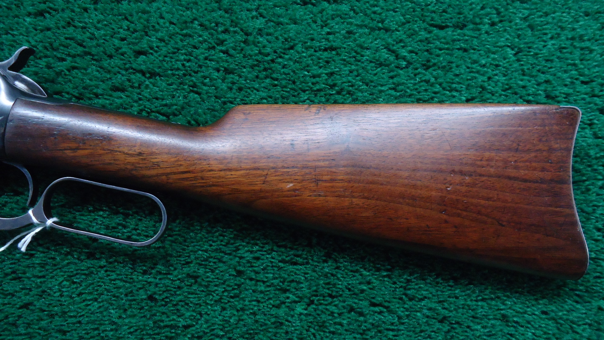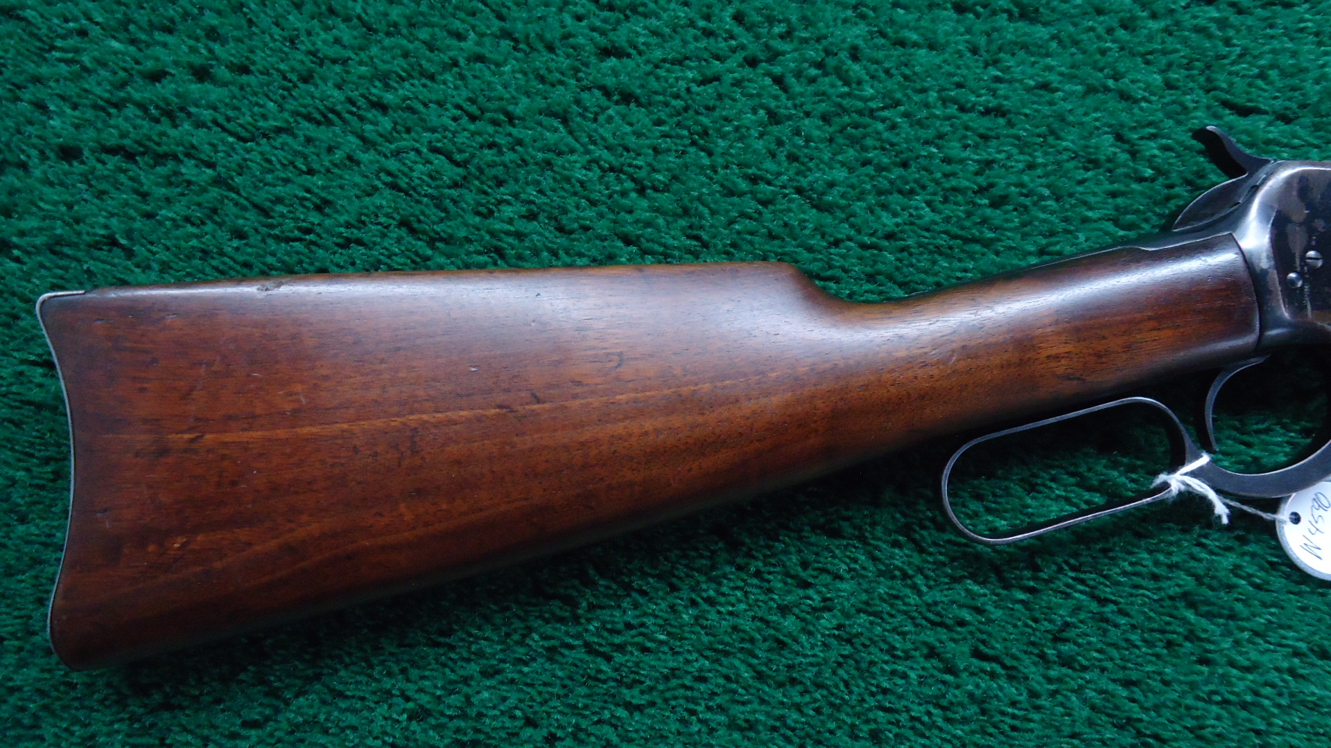 W4590 WINCHESTER MODEL 92 SADDLE RING CARBINE IN CALIBER 25-20 WCF; 20 inch round barrel. Full length tube magazine. Pinned blade front sight with folding ladder rear. Plain walnut forearm with matching straight grip buttstock fit with a carbine style buttplate. Barrel and magazine show about 80% original blue. Receiver shows about 40% original flaking blue with areas of flaking turning brown. Bore is fairly bright with some lightly frosted surfaces and strong rifling. Action is crisp and tight. Stocks have been lightly sanded and refinished at some time now showing light handling marks with the buttstock fitting full but the forearm being slightly shy at the bottom by the receiver. Manufactured in 1920.