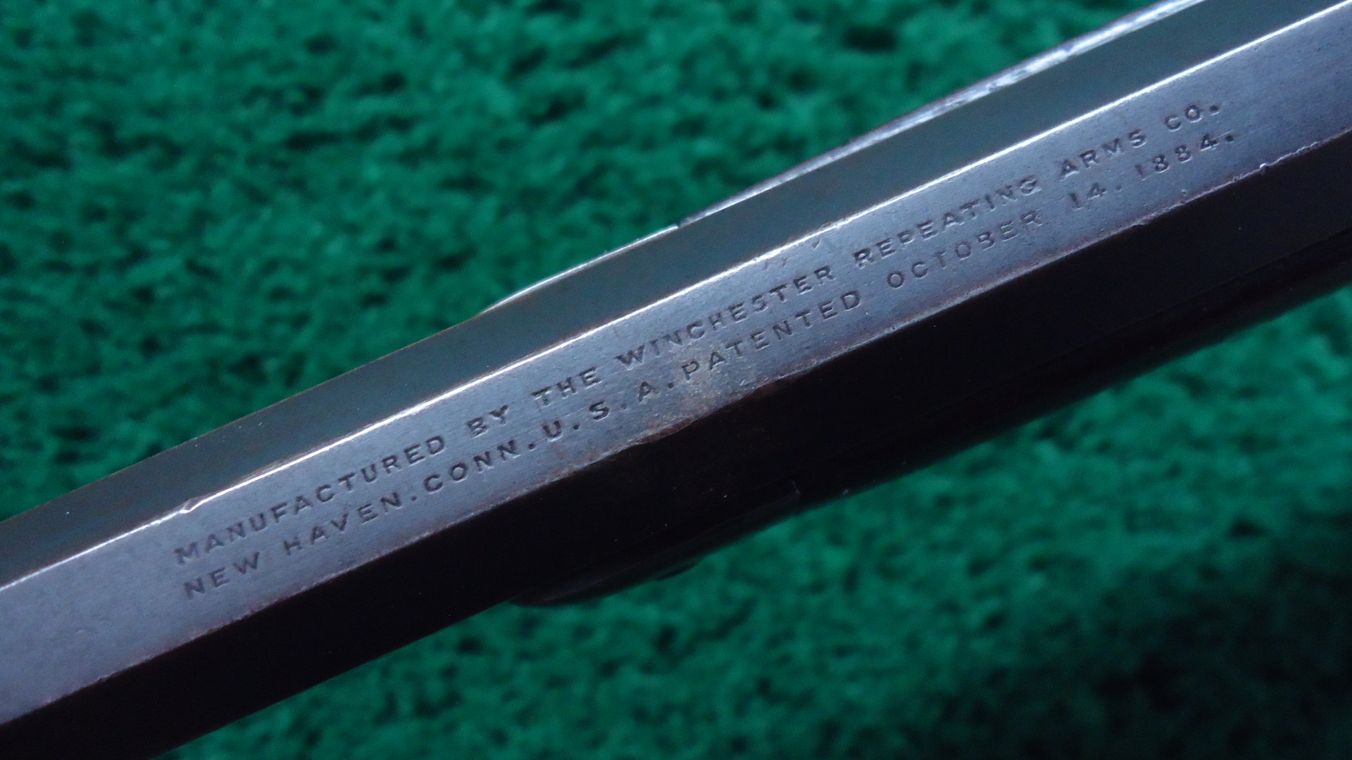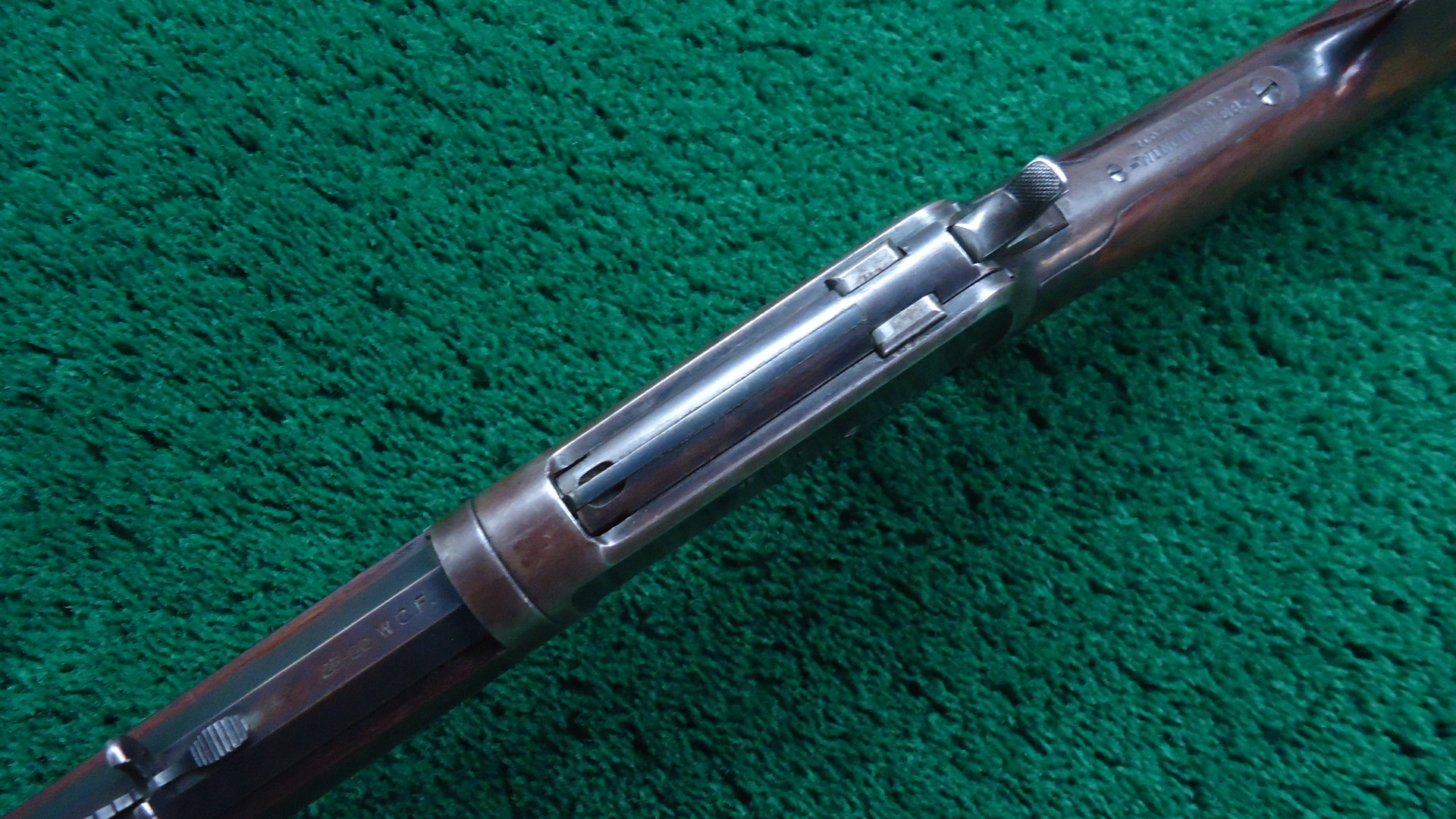 W4591 WINCHESTER MODEL 1892 TD RIFLE IN 25-20 WCF; 24 inch octagon barrel chambered in 25-20 WCF caliber. Bore has good rifling but is frosted. Sights include a German silver blade front and semi-buckhorn sporting rear. Barrel and full length magazine tube retain most original blue toning to plum/blue. Receiver has turned a plum/brown with some blue in the protected areas. Hammer and lever have just traces of case colors. Good blue on the loading gate. Nice functioning action. Walnut stock set is in good condition with some handling and usage mars. A little bit of figure showing as well. Rifle style buttplate. There are some letters stamped into the top barrel flat and on the receiver. I have no idea what they stand for. This Winchester rifle with Take-Down frame was made in 1904 and should be a fun shooter.