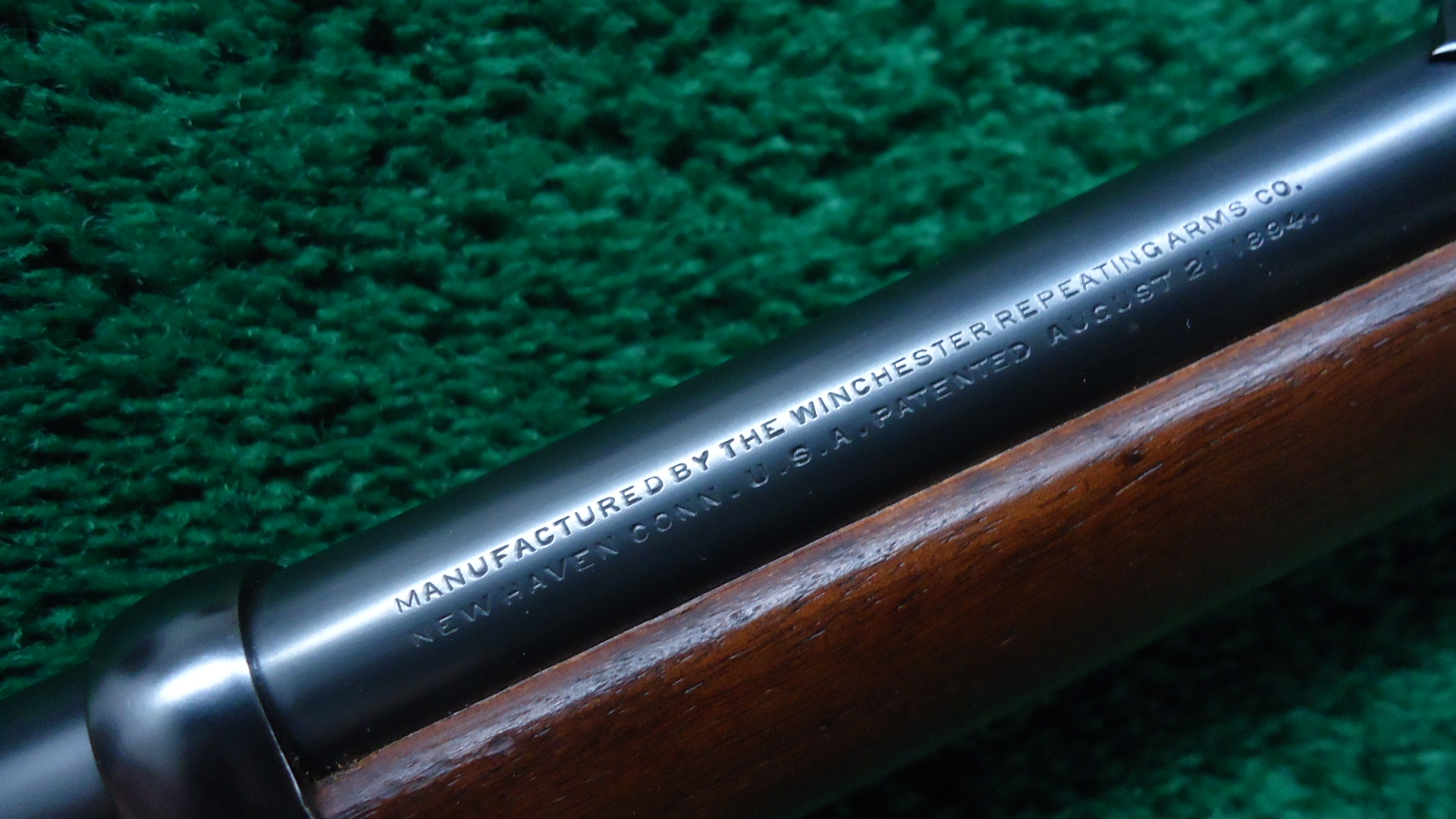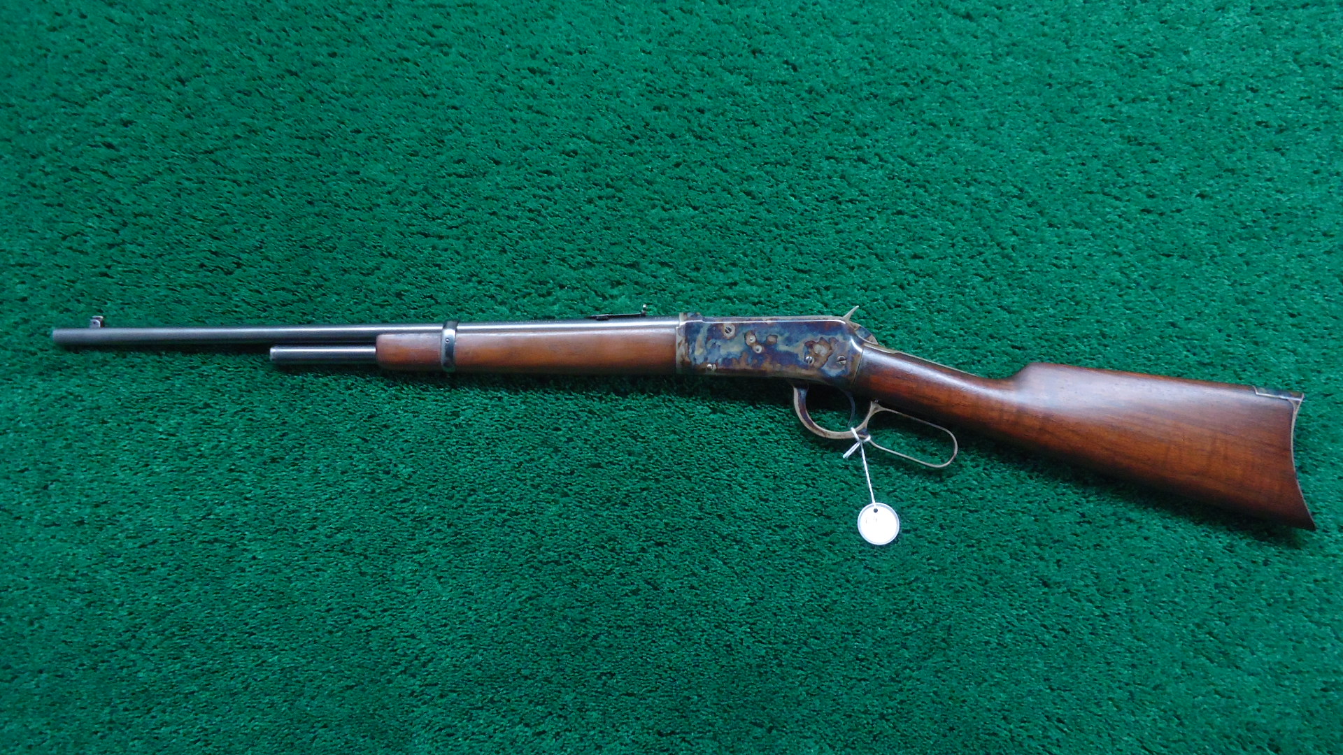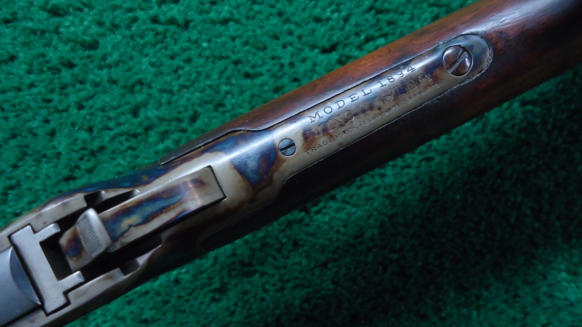 W4607 COLOR CASE HARDENED WINCHESTER MODEL 1894 CARBINE IN 32-40; 20 inch round barrel. Pinned blade with ivory bead front sight and a Marbles series 95 adjustable leaf folding rear. 2/3 length tube magazine. Color case hardened receiver without saddle ring. Plain walnut forearm with matching straight grip buttstock fit with color case hardened crescent rifle buttplate. Originally manufactured in 1918, this carbine has been completely refinished and remains in excellent condition overall with barrel and magazine showing 98% re-blued finish. Very good bore is fairly bright with decent rifling. The receiver, hammer, lever and buttplate show 98% vibrant color case hardened finish. Stocks are solid and fit decent with only light handling marks. This is a rare opportunity to get a color case hardened model 1894 carbine for a small fraction of what an original case colored gun with much less condition would cost.