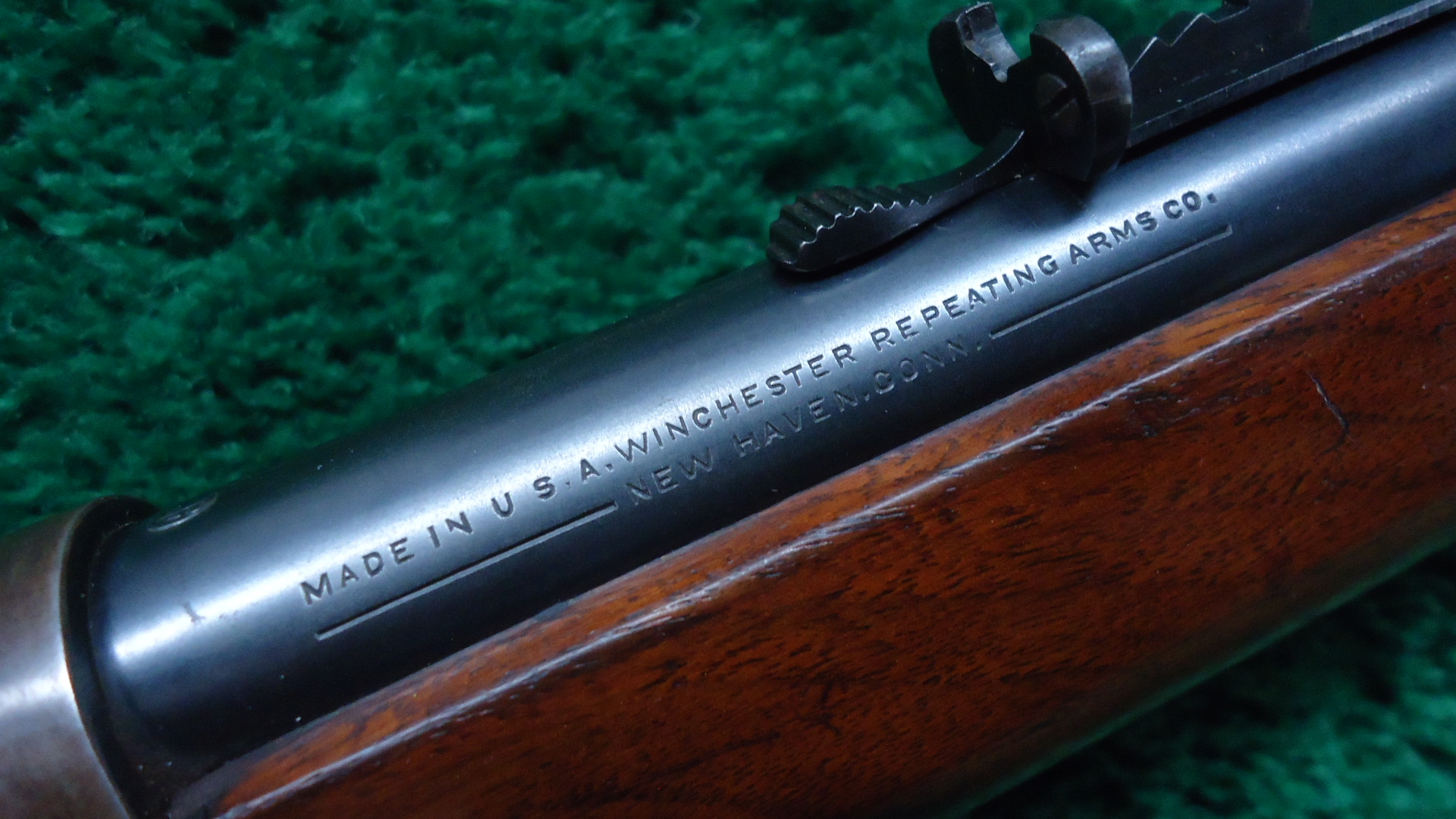 W4634 WINCHESTER MODEL 55 TAKE DOWN LEVER ACTION RIFLE IN 30 WCF; 24 inch round barrel. Sights include a brass bead front and a semi-buckhorn sporting rear with a Marbles peep sight mounted on the tang. Half length tube magazine. Takedown receiver. Plain walnut forearm with matching straight grip buttstock fit with ribbed steel shotgun style butt plate. Near excellent condition overall with the metal surfaces being mostly clean and smooth showing 80-90% finish with light handling marks. Bore is excellent, bright and shiny with strong rifling. Action is crisp and tight. The stocks are solid and full fitting with typical wear and handling marks. Manufactured in 1928.