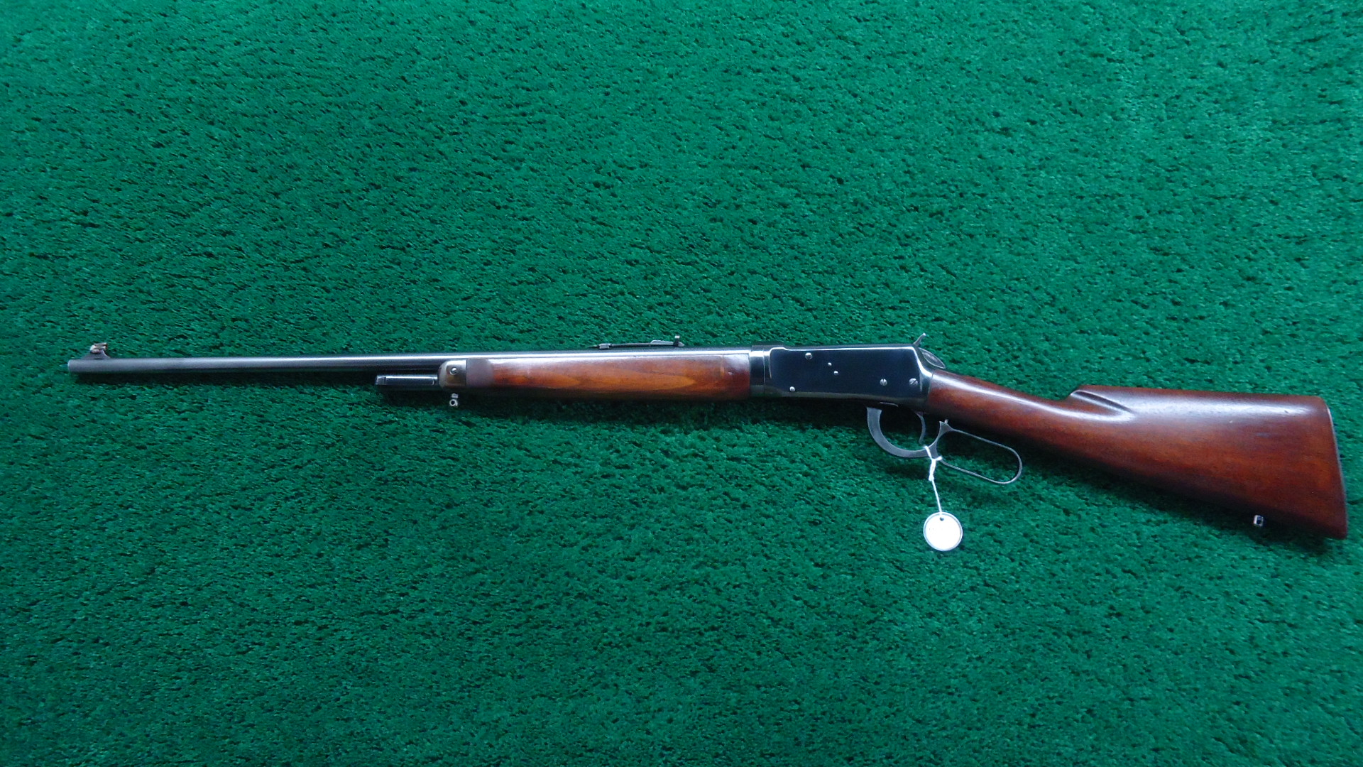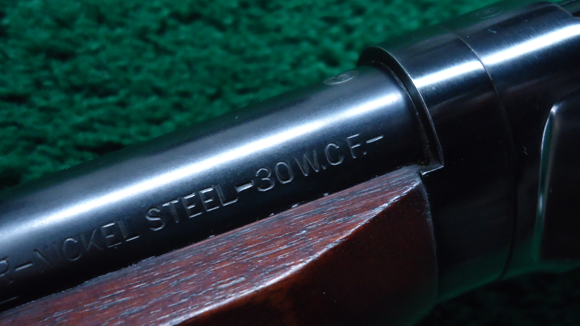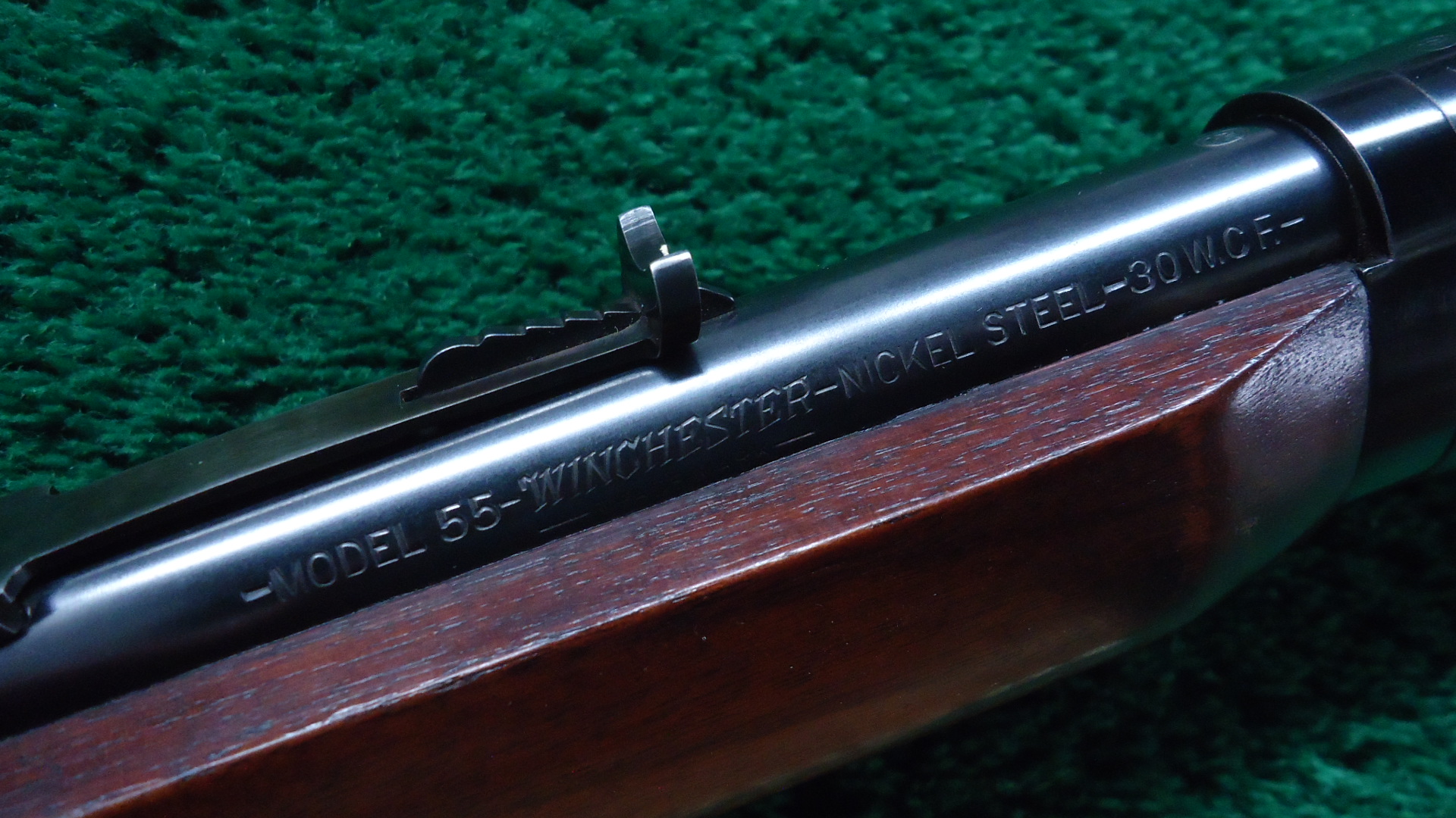 W4636 WINCHESTER MODEL 55 TAKE DOWN LEVER ACTION RIFLE IN 30 WCF; 24 inch round barrel. Modified blade front sight and a sporting rear. Half length tube magazine. The forearm is a semi-beavertail model 64 type plain walnut with matching straight grip buttstock fit with ribbed steel shotgun style butt plate. Features include a takedown receiver and eyes for detachable sling swivels. Excellent condition overall as restored with clean smooth metal surfaces showing about all deep dark re-blued finish with only slight wear on the edges of the muzzle. Bore is excellent, bright and shiny with strong rifling. Action is crisp and tight. The stocks are solid and full fitting with only very light handling marks. Manufactured in 1930.