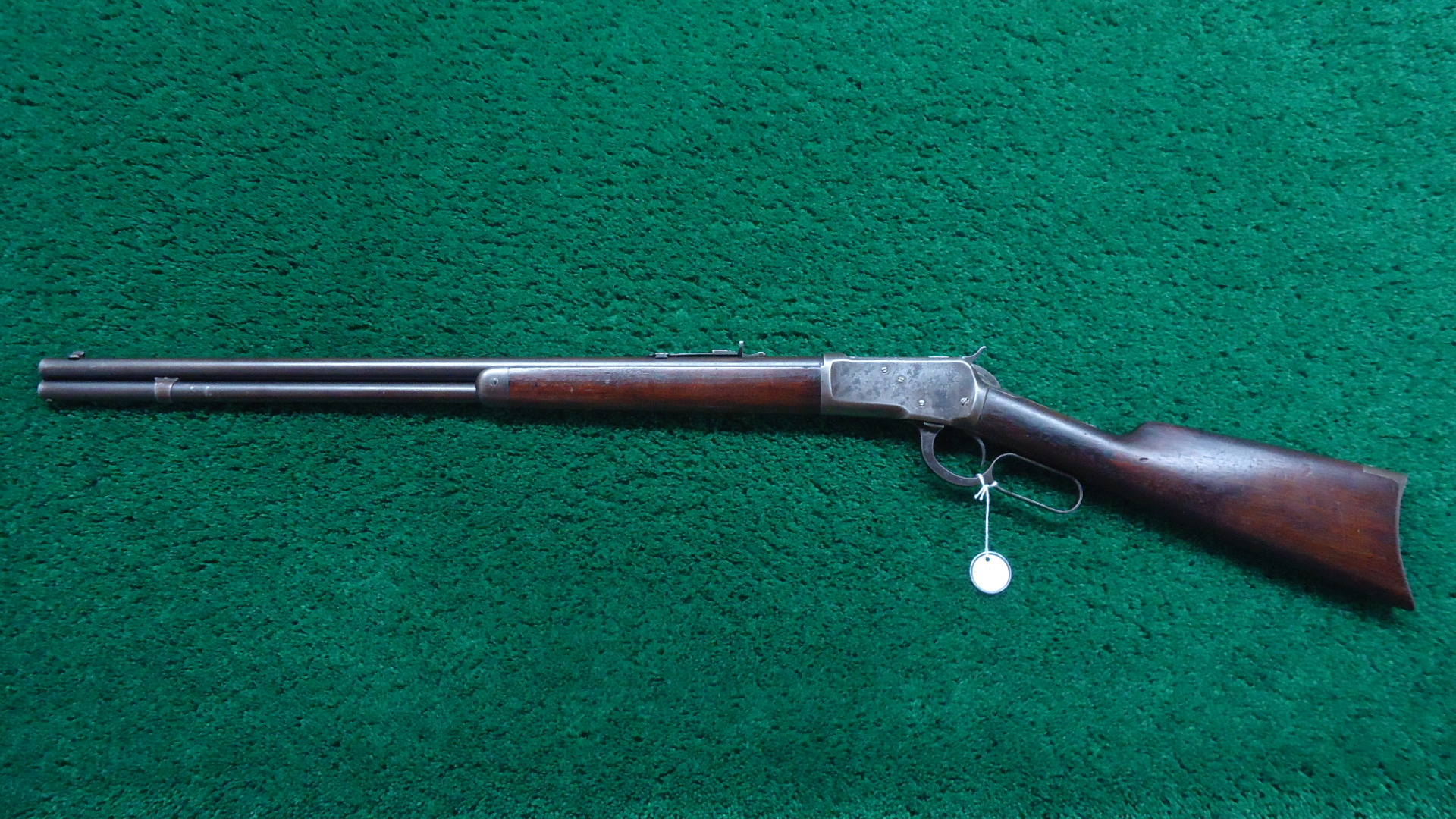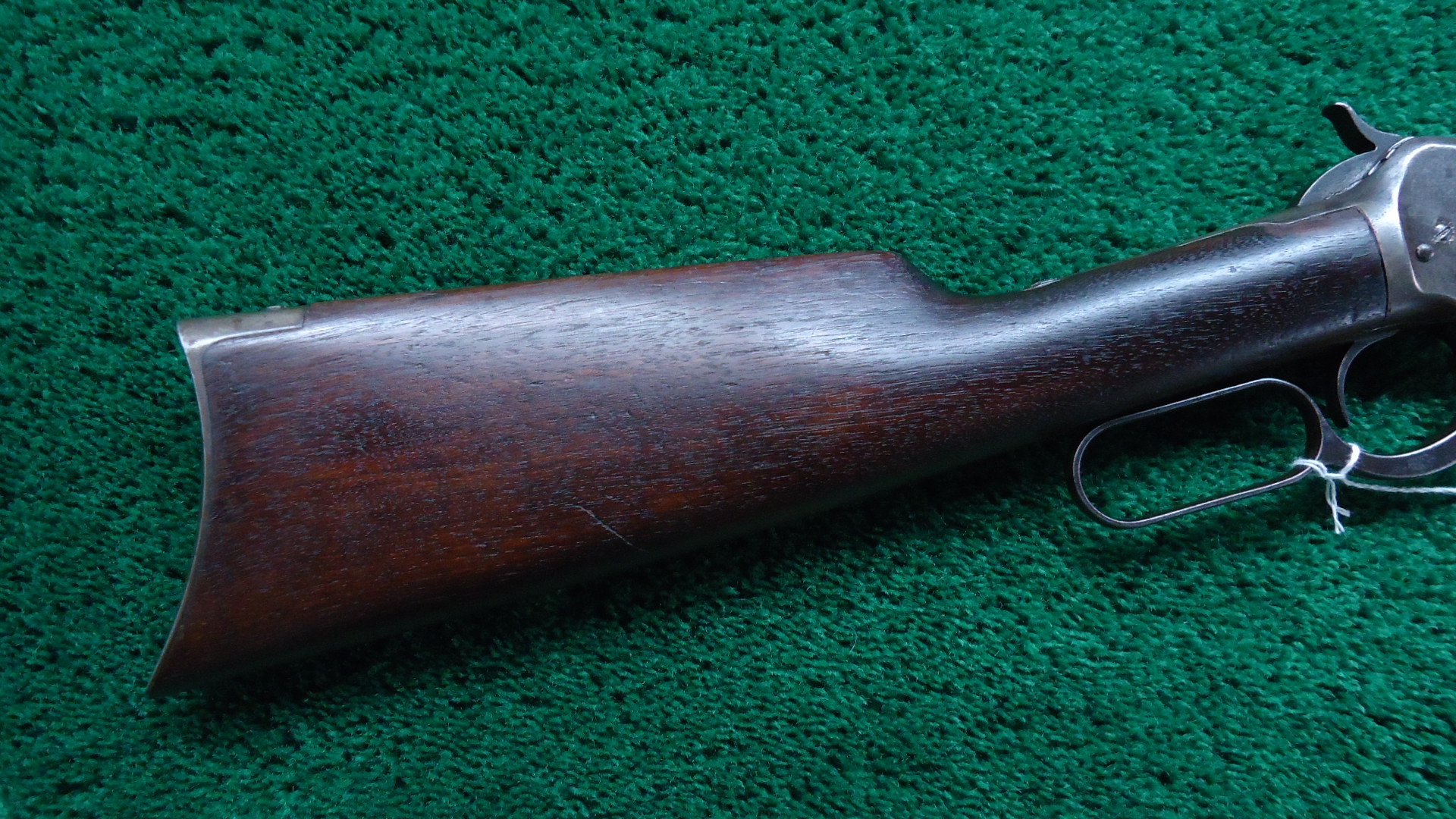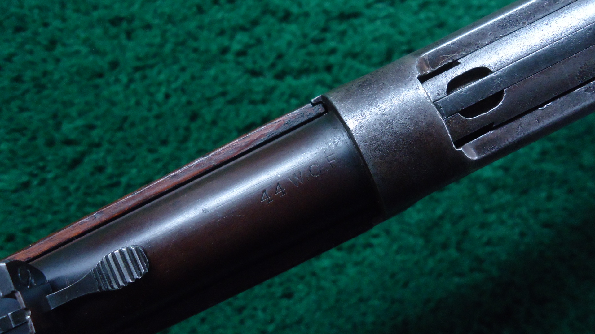 W4654 WINCHESTER MODEL 1892 RIFLE IN 44 WCF; 24 inch round barrel chambered in the desirable 44 WCF caliber with a good bore that has shine and visible rifling but also has a slight ring about 6 inches from the muzzle. Barrel and full length magazine tube are a plum/brown patina with traces of blue in the protected areas. Sights include a blade front and flattop sporting rear. Receiver has some very fine scattered pin prick pitting and has a mottled gray appearance. Loading gate is a blue/gray. Hammer and lever are a brown/gray. Smooth action. Walnut forearm has a repaired crack with some filler on the left side. Buttstock is a little ill fitting with a repair at the wrist with a rifle style buttplate. Manufactured in 1911. Should be a shooter at the range or for “Cowboy Action” shooting.