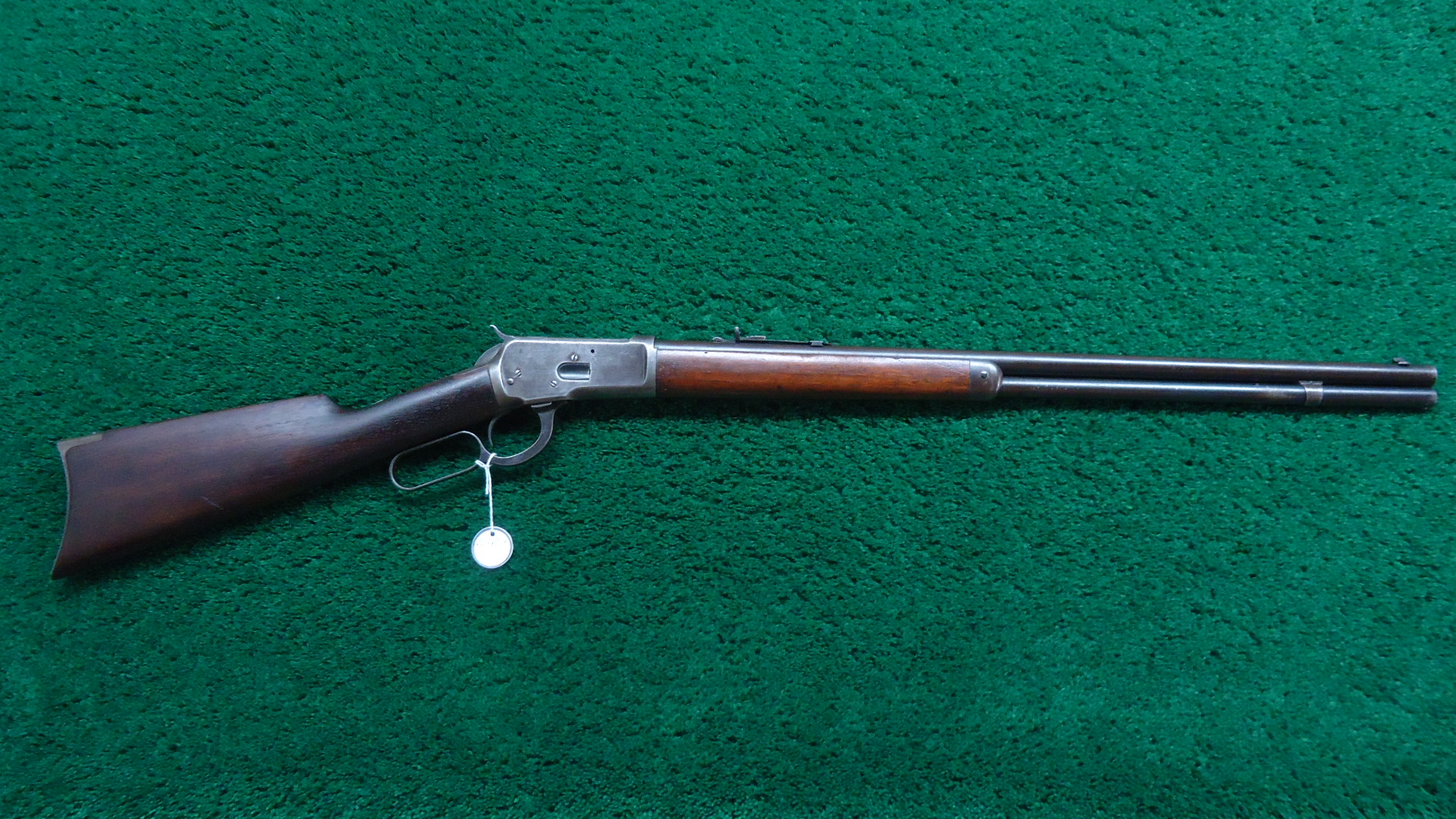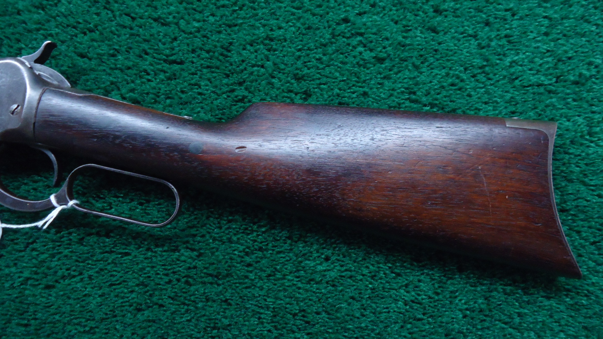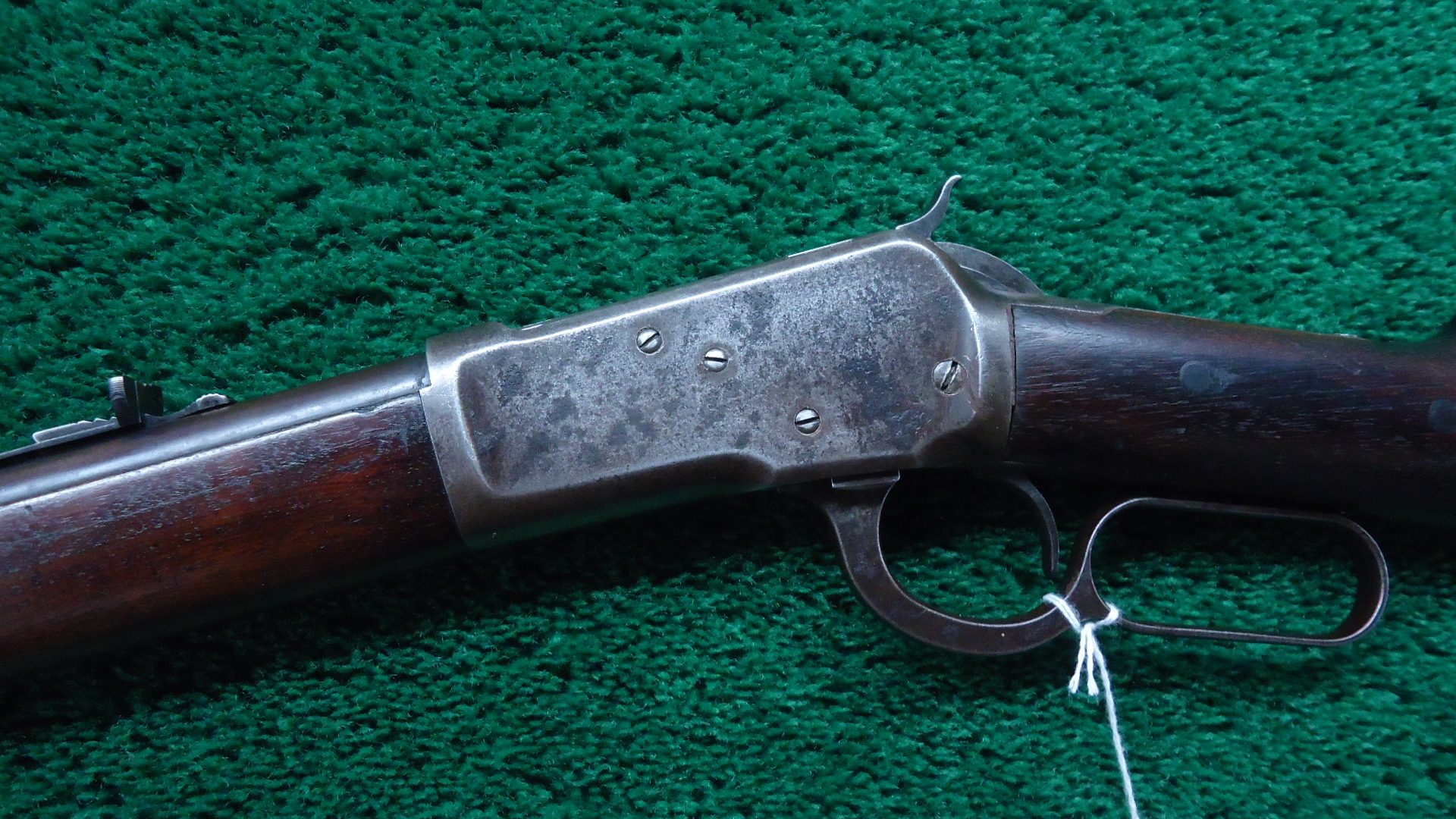 W4654 WINCHESTER MODEL 1892 RIFLE IN 44 WCF; 24 inch round barrel chambered in the desirable 44 WCF caliber with a good bore that has shine and visible rifling but also has a slight ring about 6 inches from the muzzle. Barrel and full length magazine tube are a plum/brown patina with traces of blue in the protected areas. Sights include a blade front and flattop sporting rear. Receiver has some very fine scattered pin prick pitting and has a mottled gray appearance. Loading gate is a blue/gray. Hammer and lever are a brown/gray. Smooth action. Walnut forearm has a repaired crack with some filler on the left side. Buttstock is a little ill fitting with a repair at the wrist with a rifle style buttplate. Manufactured in 1911. Should be a shooter at the range or for “Cowboy Action” shooting.
