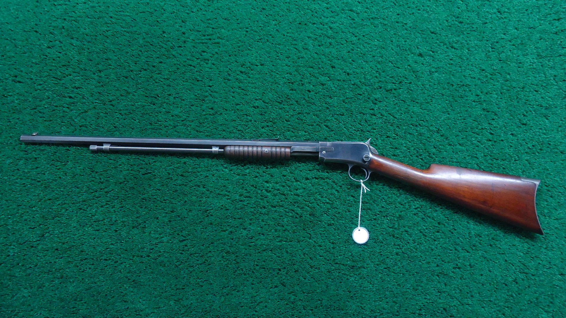 W4661 WINCHESTER MODEL 1890 SLIDE ACTION RIFLE IN 22 LONG; 24 inch octagon barrel chambered in 22 Long caliber with a good bore. Original sights include a blade front and 1901 marked rear. Barrel and magazine tube retain most all thinning original blue with a few small spots of oxidation. Receiver retains most all original blue. Hammer has a hint of case color. Grooved walnut forend pump handle and walnut stock are in good condition with a few light handling mars. Crescent steel rifle buttplate. Crisp functioning action. About 849,000 of the Model 1890’s were made between 1890-1932 and this one was made in 1909. This one is a Third Model Takedown Frame with Blued finish.
