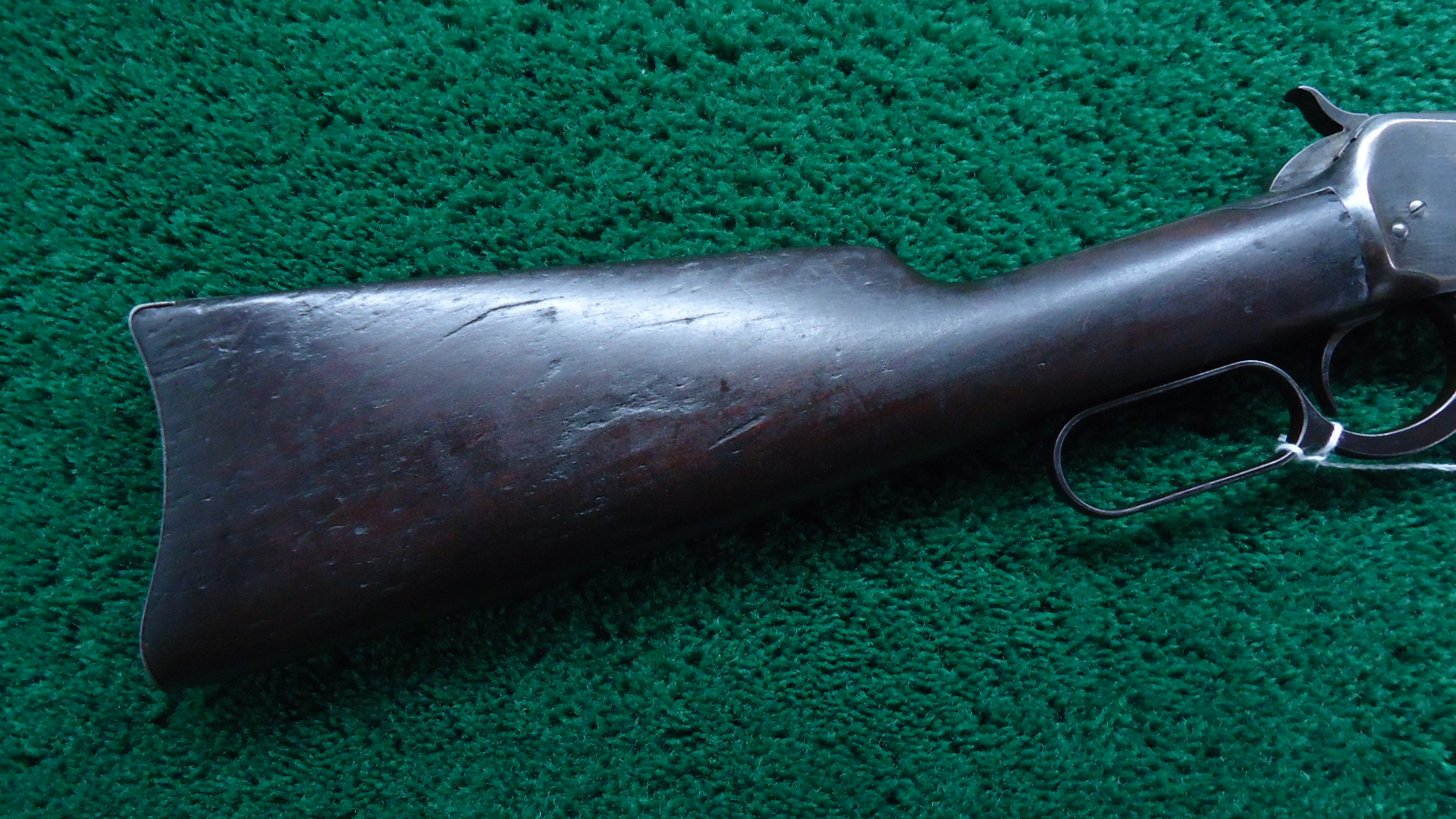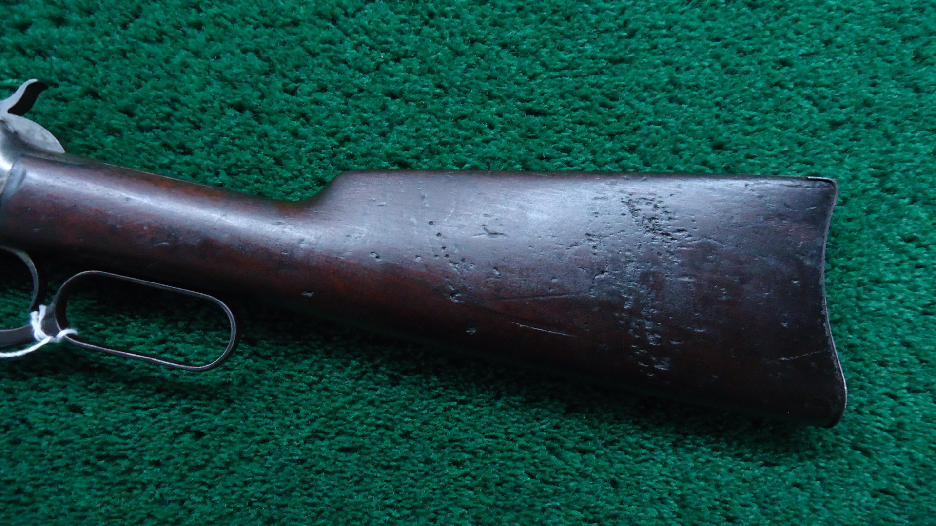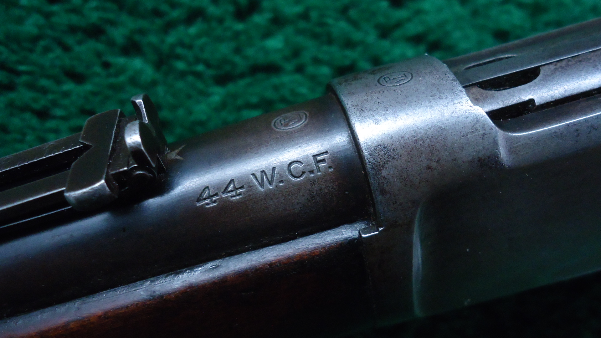 W4667 WINCHESTER MODEL 1892 SRC IN 44 WCF; 20 inch round barrel carbine configuration chambered in the desirable 44 WCF caliber with a shiny bore with some scattered light roughness. Barrel and full length magazine tube have thinning blue fading to brown. Sights include a pinned blade front and folding ladder carbine rear. Receiver appears to have been cleaned long ago and is turning a gray patina with some light spots of pitting. Loading gate is a blue/gray. Hammer is gray and the lever is more of a brown. Crisp action. Gumwood forearm has some wear and handling mars. Buttstock has some handling mars with numerous indentations with a carbine style buttplate. Manufactured in 1908. Should be a good shooter with lots of character.