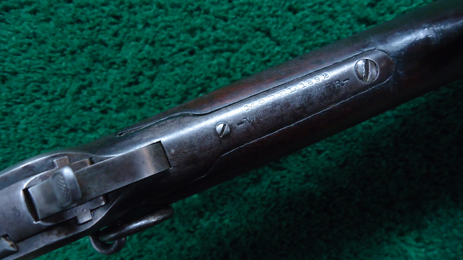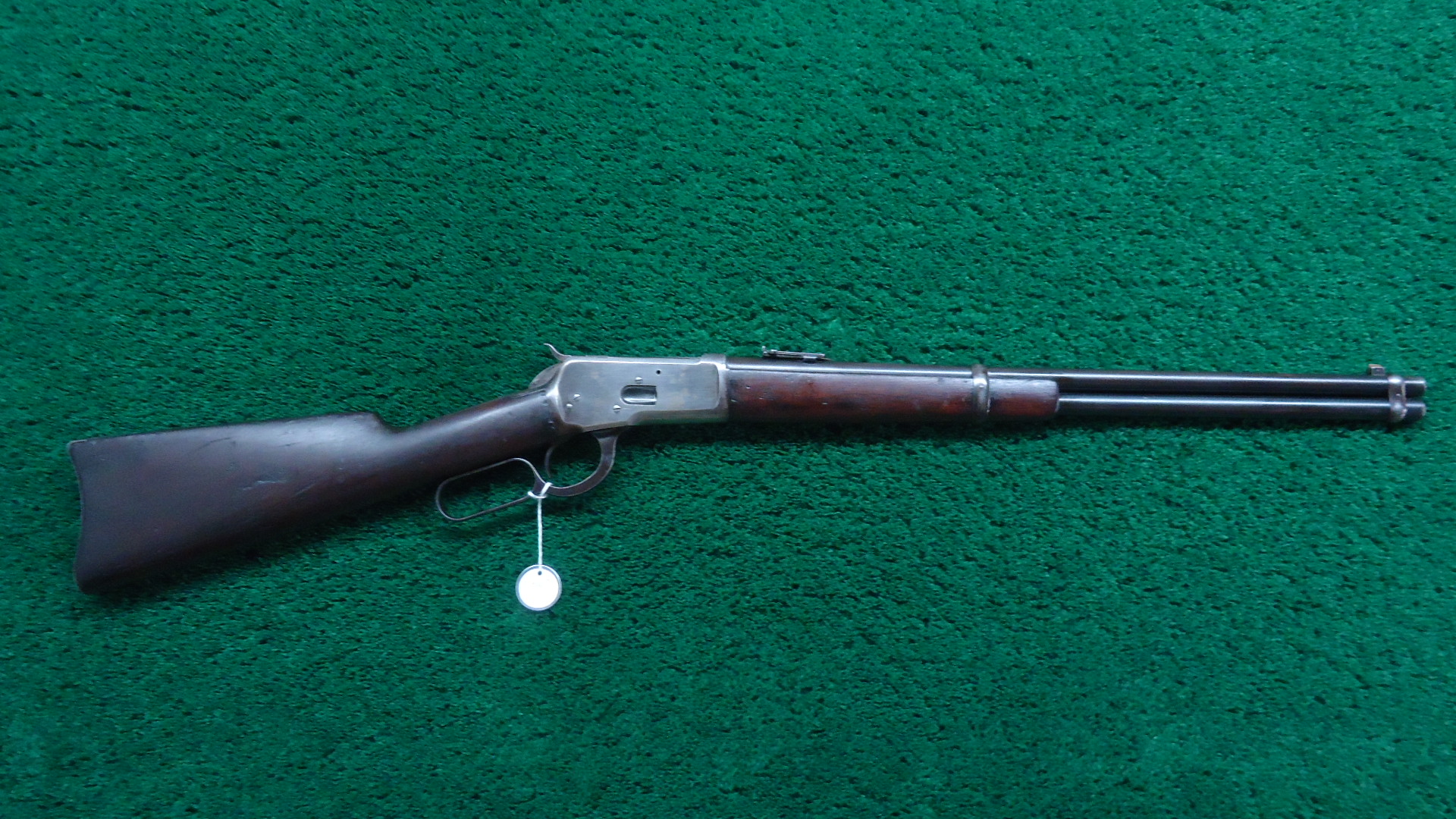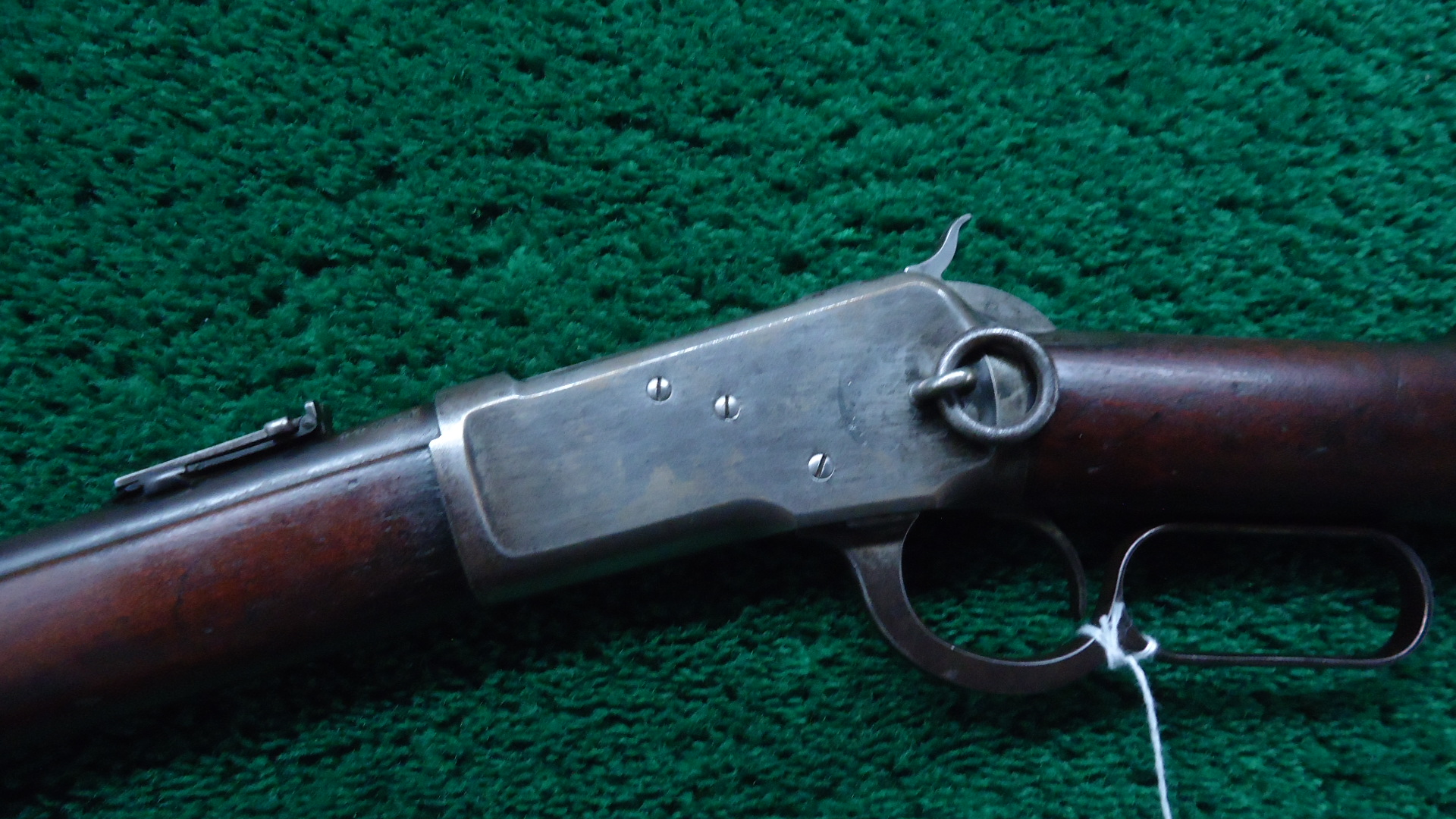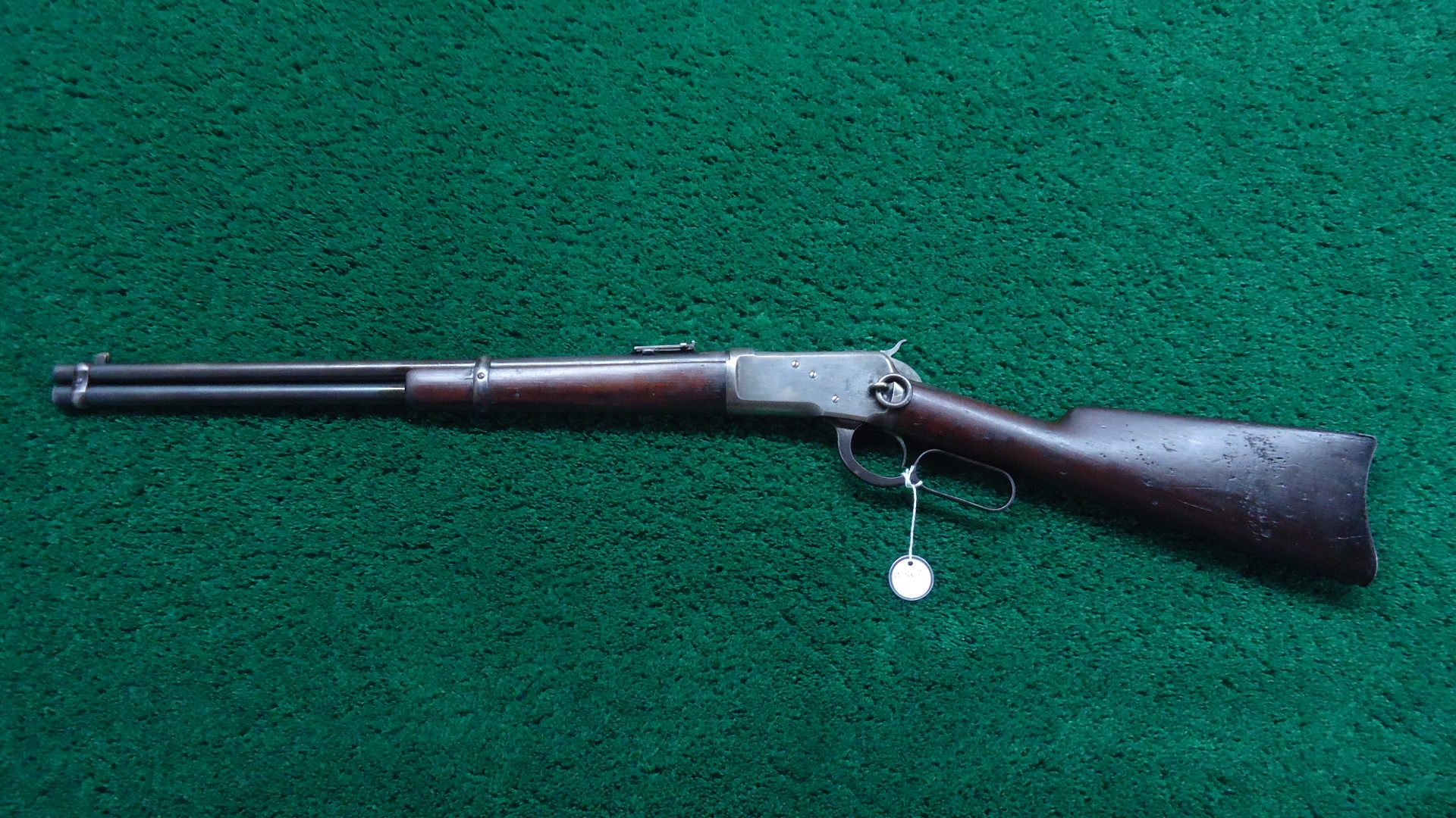 W4667 WINCHESTER MODEL 1892 SRC IN 44 WCF; 20 inch round barrel carbine configuration chambered in the desirable 44 WCF caliber with a shiny bore with some scattered light roughness. Barrel and full length magazine tube have thinning blue fading to brown. Sights include a pinned blade front and folding ladder carbine rear. Receiver appears to have been cleaned long ago and is turning a gray patina with some light spots of pitting. Loading gate is a blue/gray. Hammer is gray and the lever is more of a brown. Crisp action. Gumwood forearm has some wear and handling mars. Buttstock has some handling mars with numerous indentations with a carbine style buttplate. Manufactured in 1908. Should be a good shooter with lots of character.