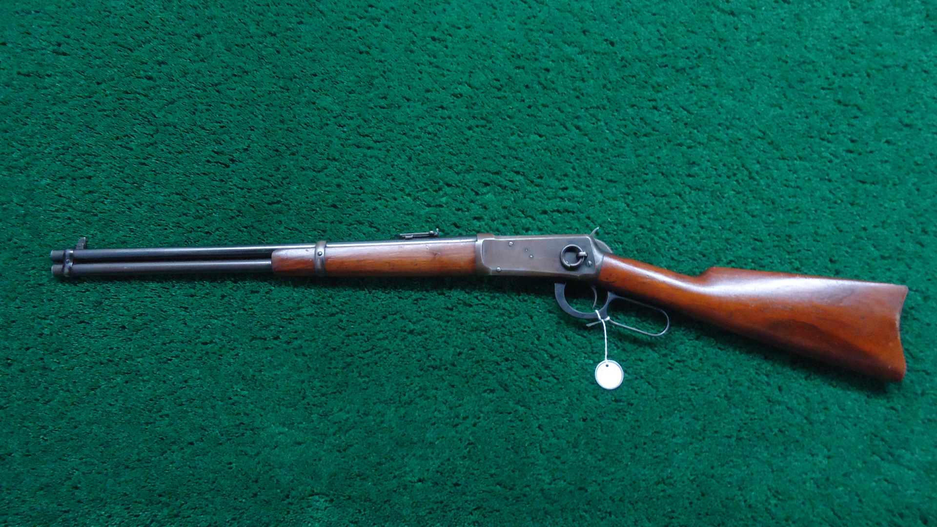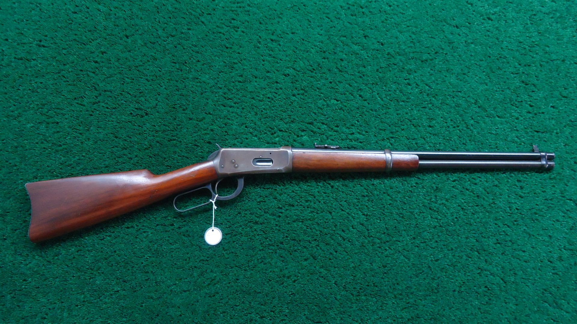 W4671 WINCHESTER MODEL 94 SRC IN 30 WCF; 20 inch round barrel carbine configuration chambered in 30 WCF caliber with a bright shiny near excellent bore. Barrel and full length magazine tube retain nearly all of the blue. Mag tube is a little duller than the barrel. Sights include a tall pinned blade front and folding ladder carbine rear. Receiver is a dull gray/brown color. Loading gate has good blue. Hammer and lever are blued. Crisp action. Walnut stock set are in good condition with some minor handling mars and an added coat of finish applied. Steel carbine buttplate. Made in 1927. Should be a good shooter.