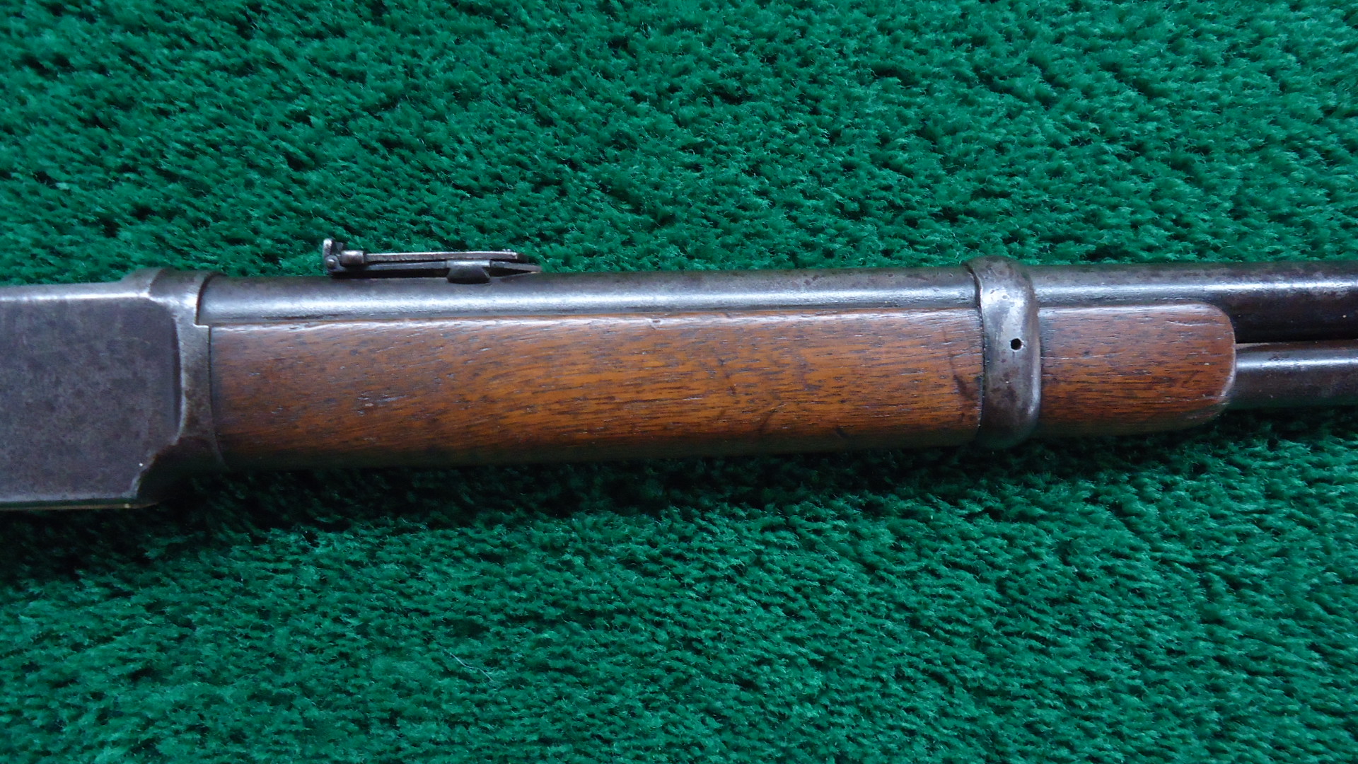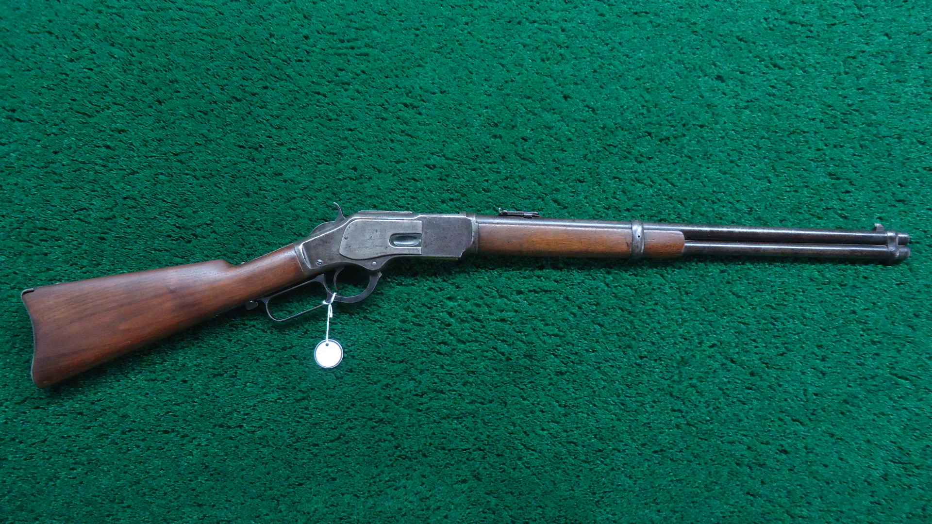 W4677 WINCHESTER MODEL 1873 SRC IN 38 WCF; 20 inch round barrel carbine configuration chambered in the seldom scene in a carbine 38 WCF caliber. Bore has good rifling and some scattered light roughness. Barrel and full length magazine tube are mostly a mottled brown/gray patina. Sights include a barleycorn front and folding ladder “1873” marked carbine rear. Receiver is a gray/brown color with some very fine pin prick pitting. Loading gate is a blue/gray. Hammer and lever are brown with the balance turning gray. Saddle ring is present but the dust cover is missing. Crisp action. Walnut forearm and buttstock have nice wood grain but has been lightly sanded and is shy in the wrist. Some handling mars and a carbine style buttplate. Manufactured in 1894. A Winchester with character.